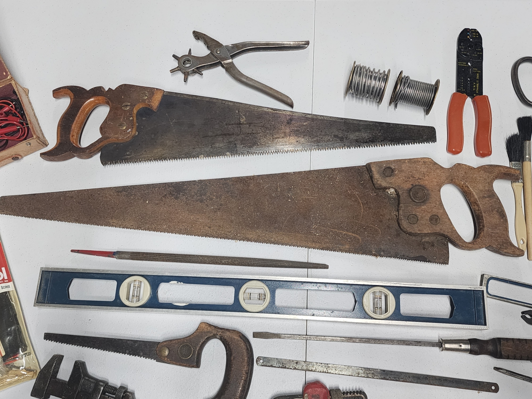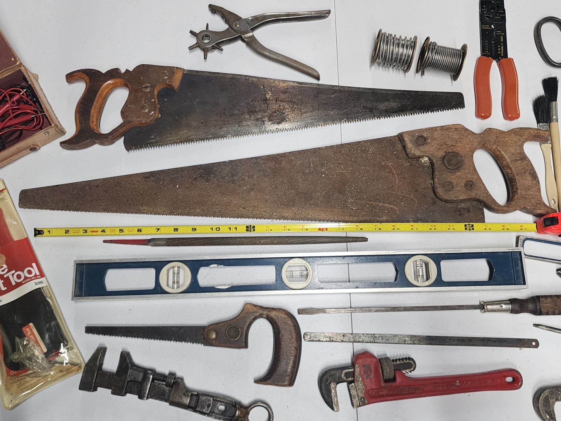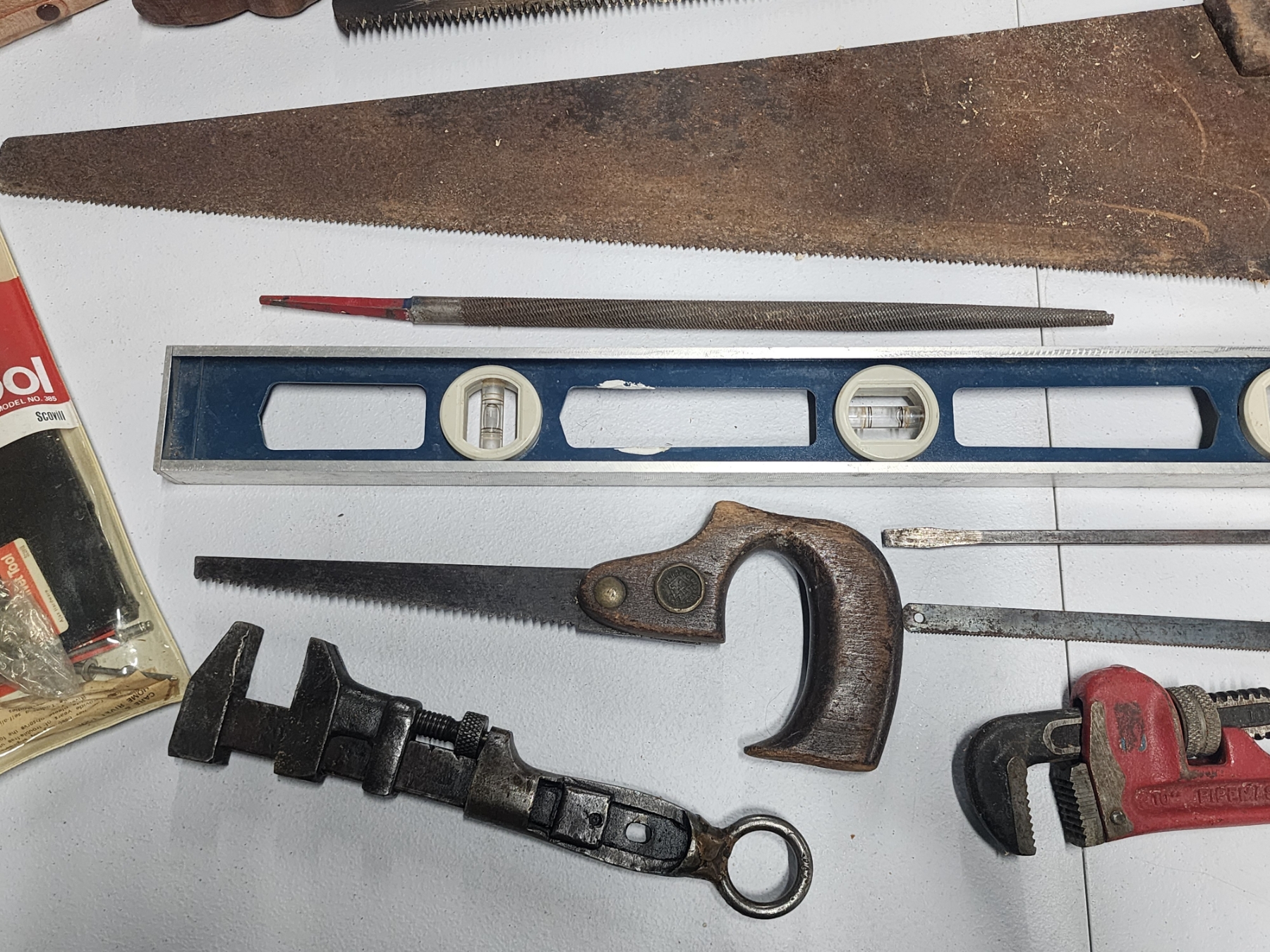 Assorted Tools Including Saws, Levels, Tin Snips, Pipe Wrenches, & More - See Photos!