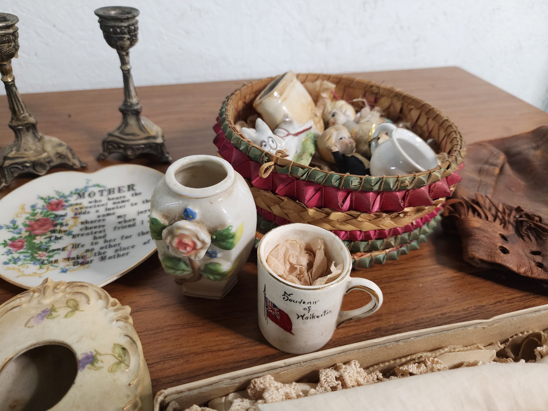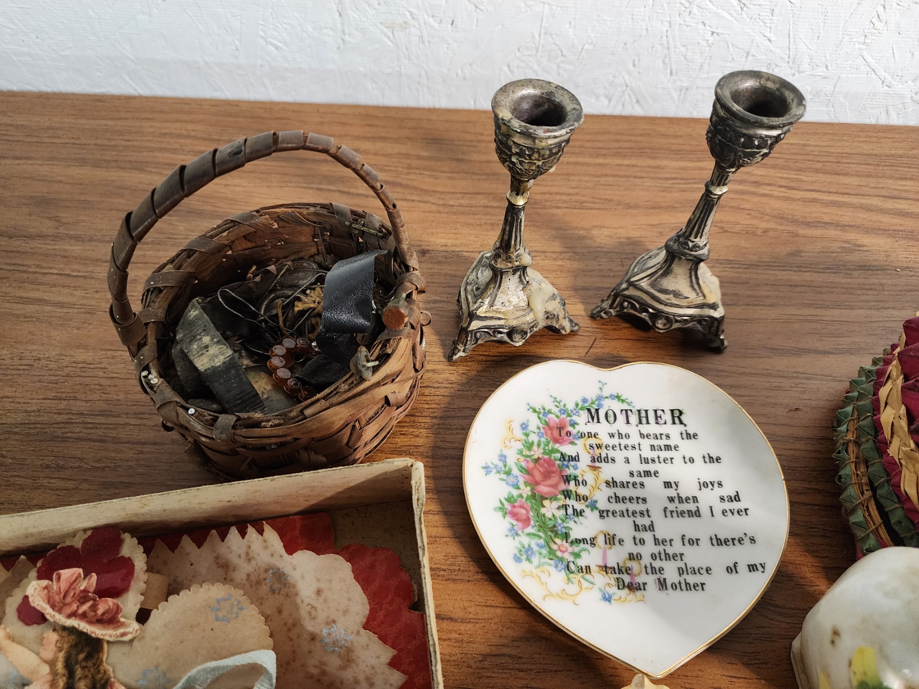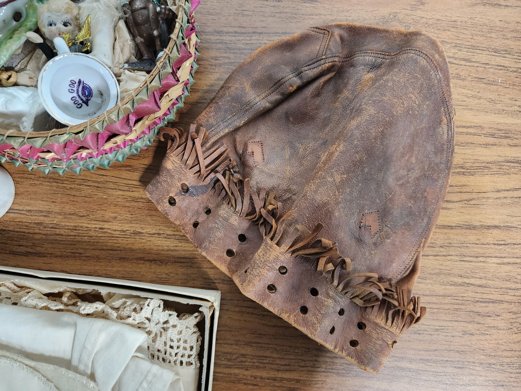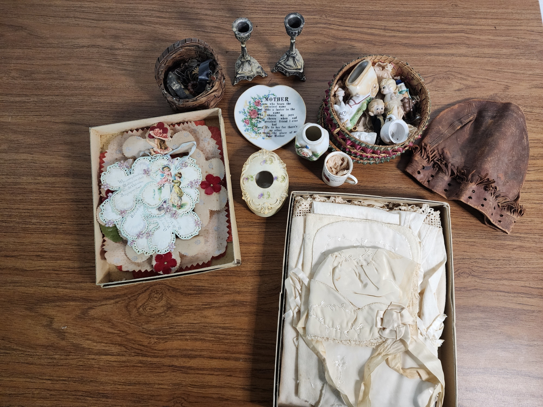 Assorted Vintage Collectibles: Handmade Baby/Doll Clothes, Leather Hat, Candlestick Holders & More!