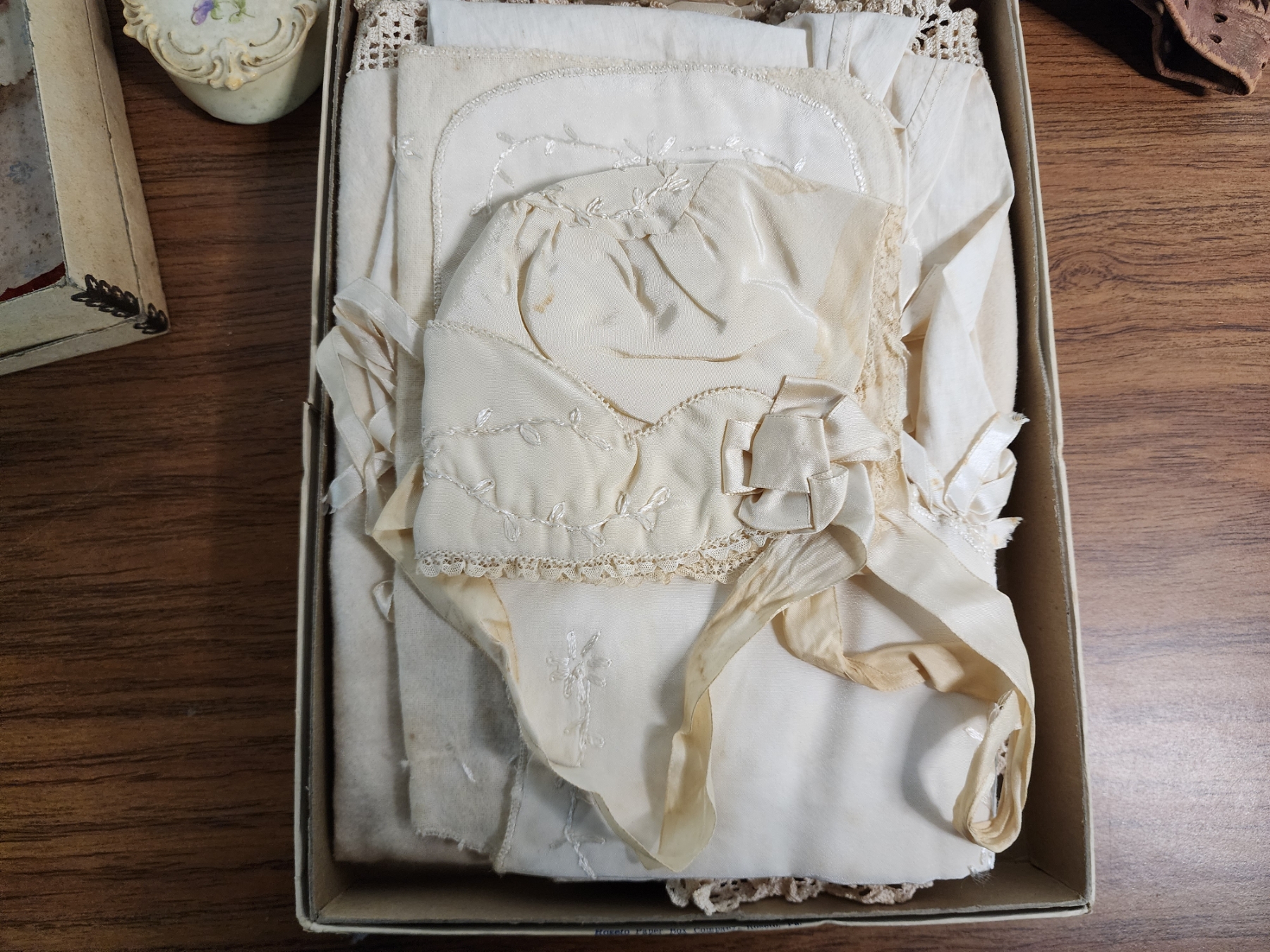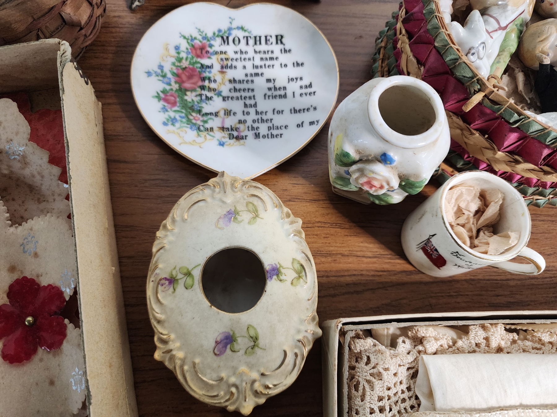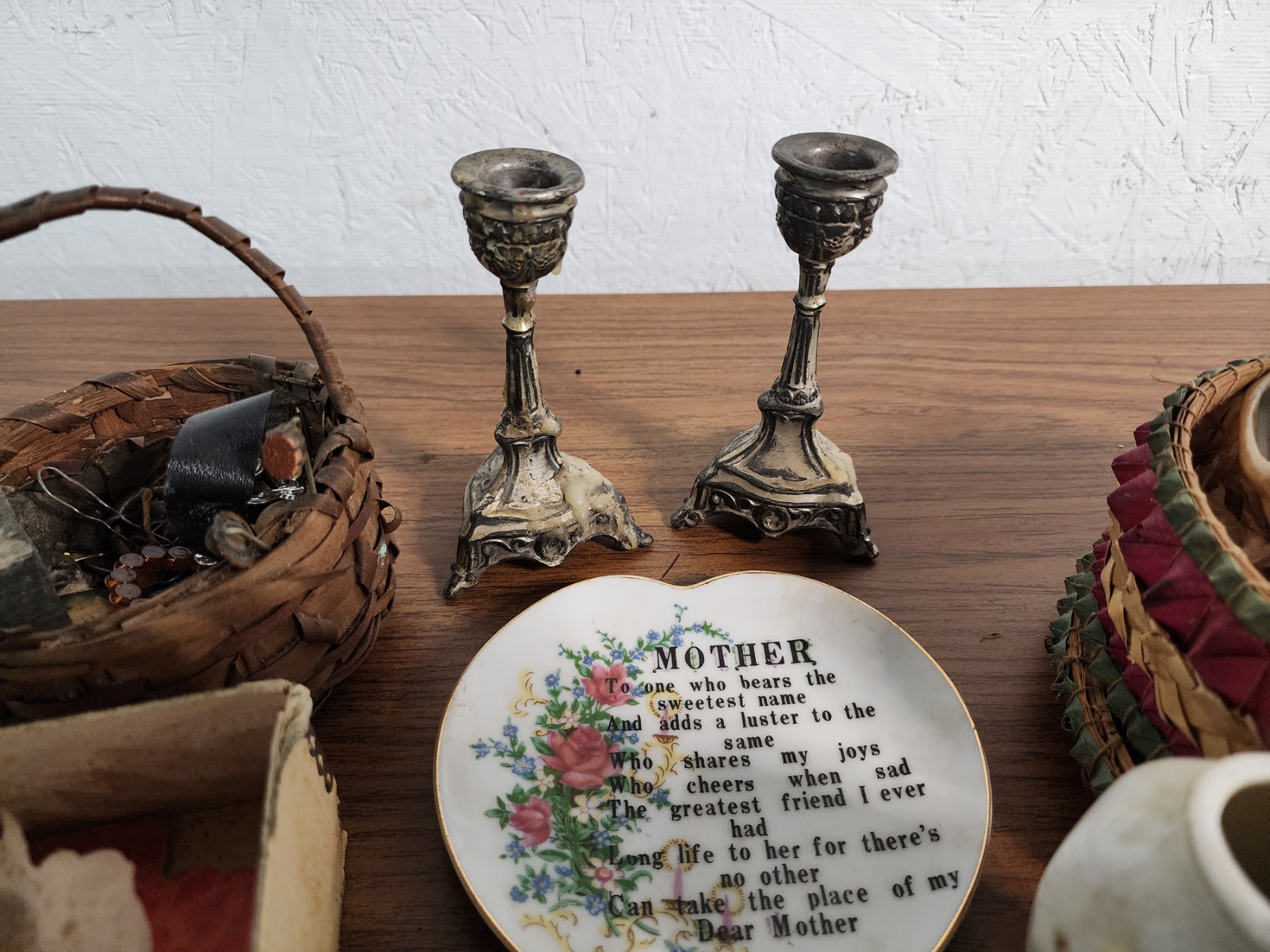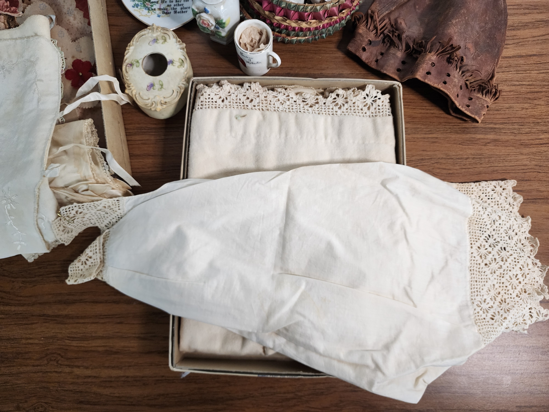 Assorted Vintage Collectibles: Handmade Baby/Doll Clothes, Leather Hat, Candlestick Holders & More!