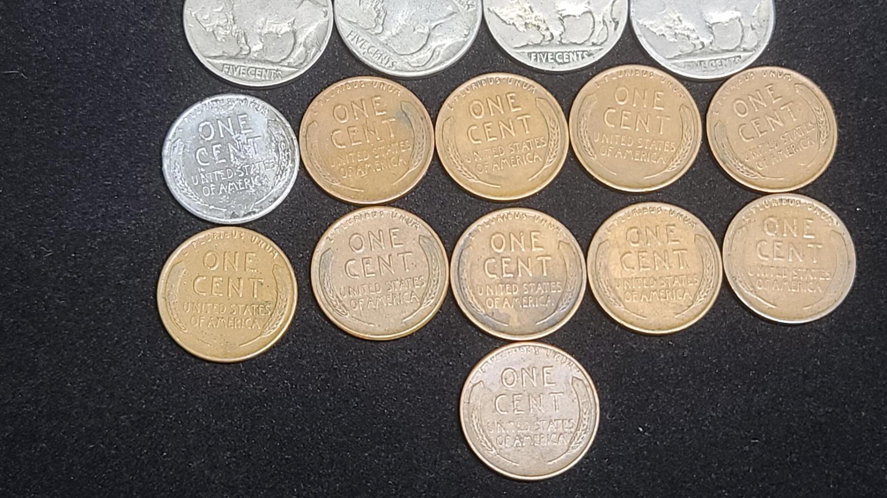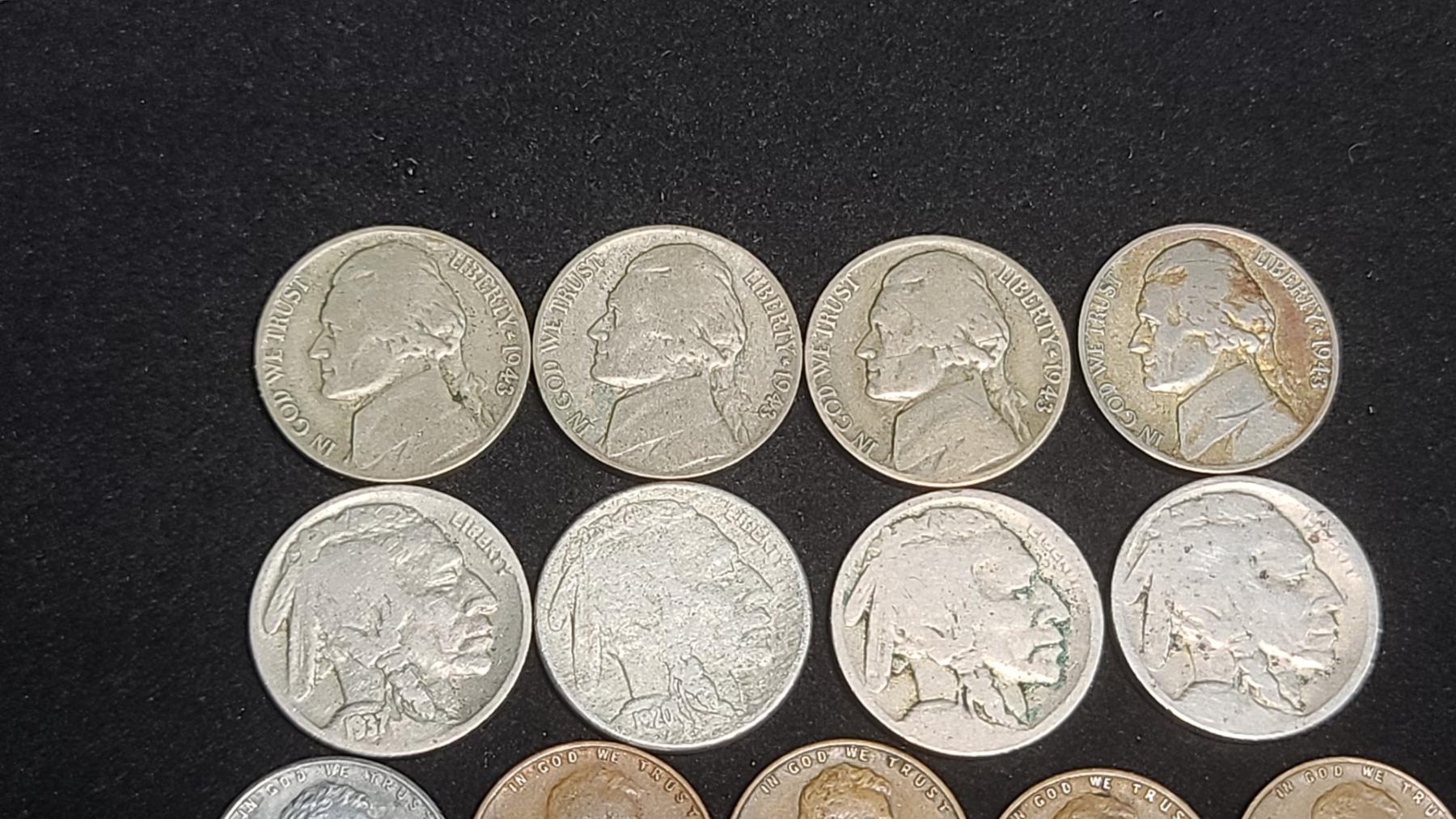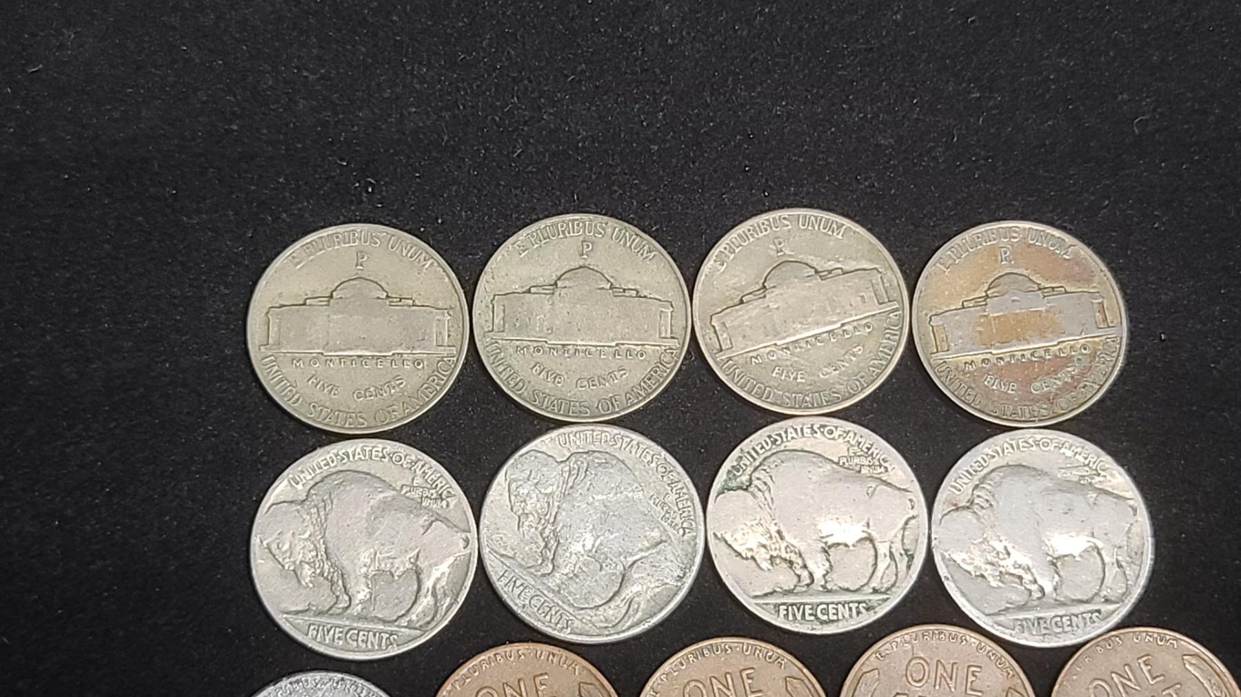 Assorted Years Jefferson 35% Silver War-Time Nickels, Buffalo Nickels & Wheat Pennies - Face Value: $0.51