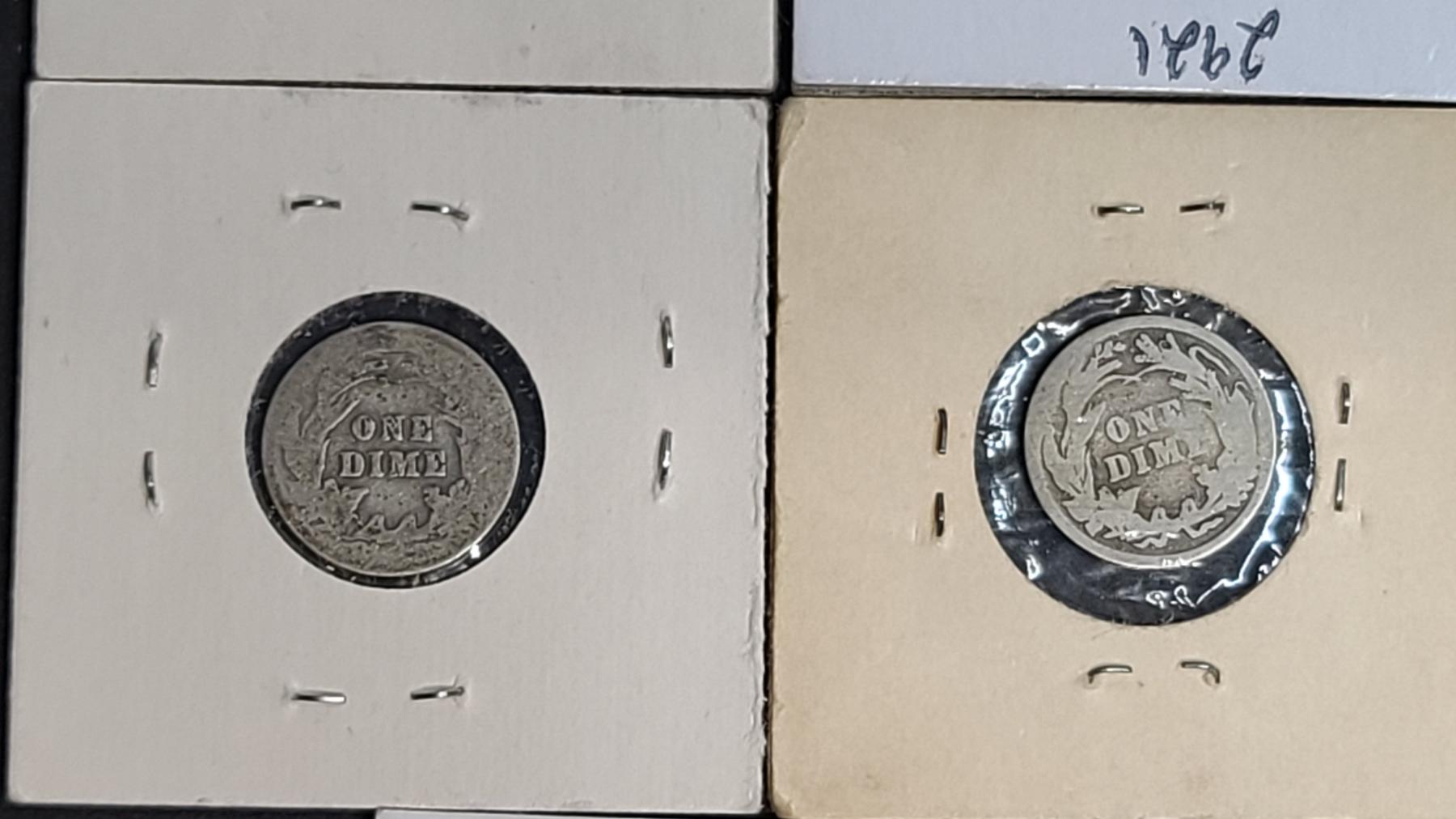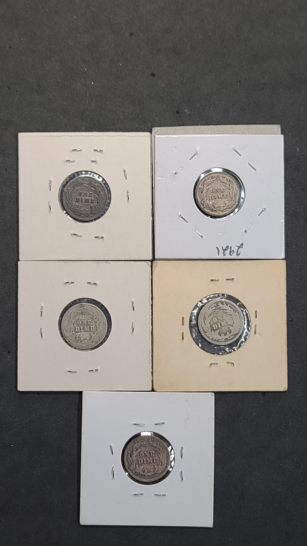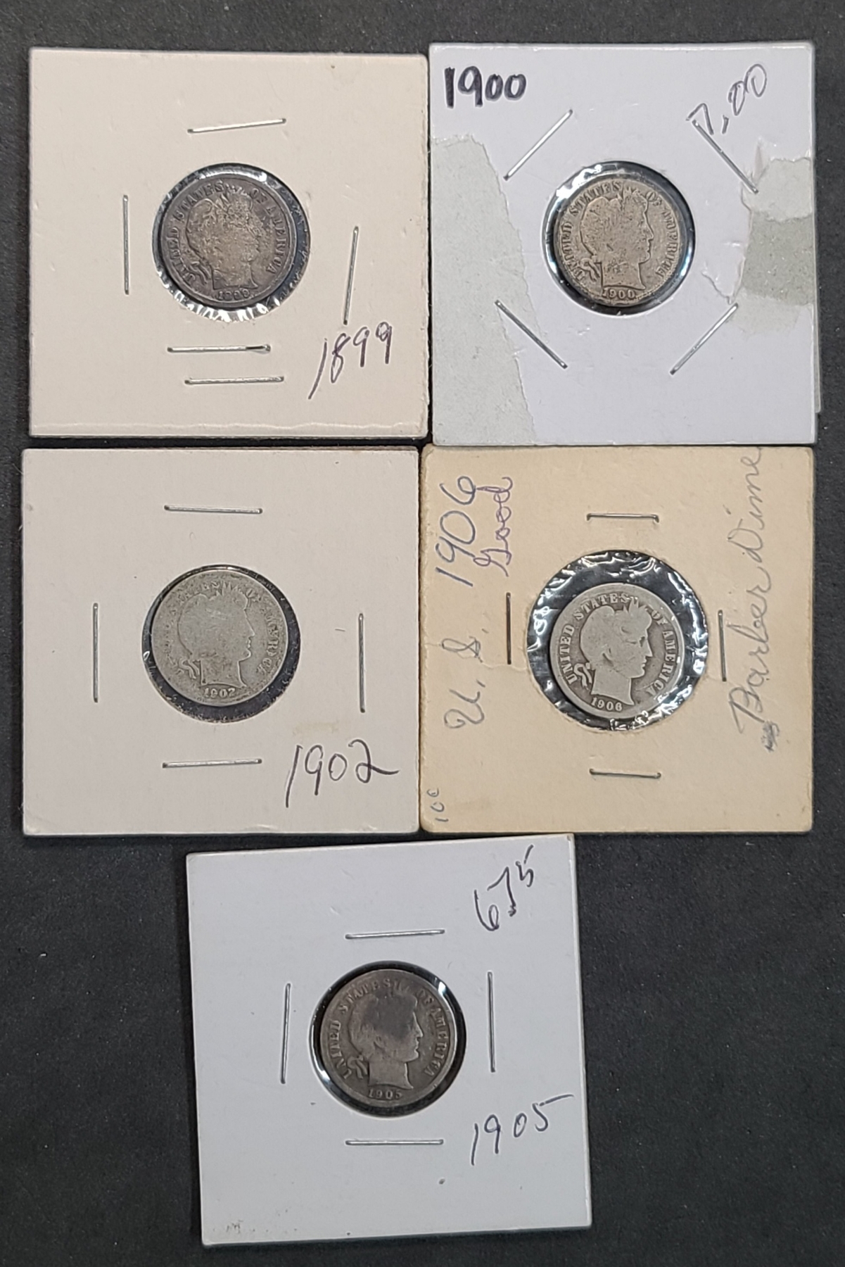 Assorted Years U.S Barber 90% Silver Dimes -1899, 1900, 1902, 1905, 1906 - Face Value: $0.50
