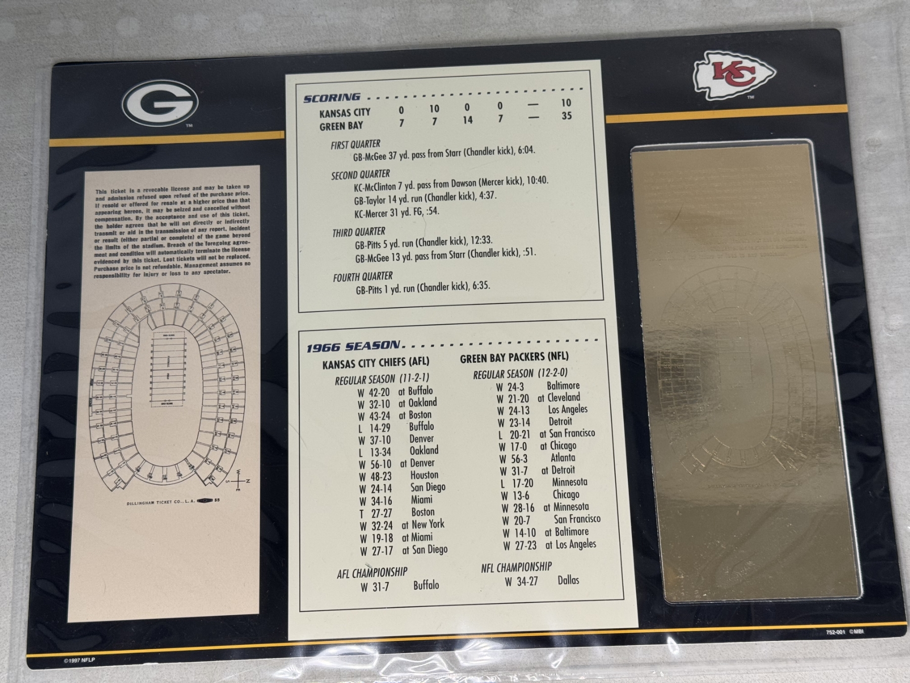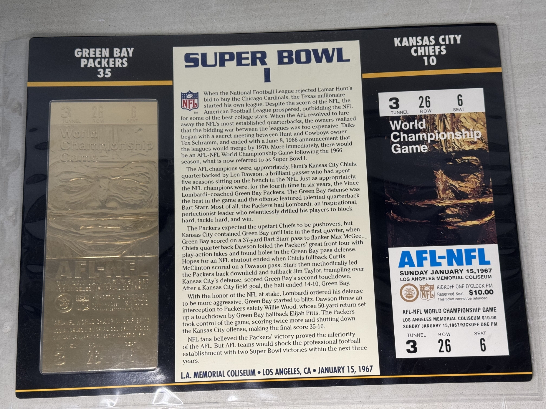 Authentic 1967 Super Bowl I NFL Football Ticket & 24K Gold Plated Ticket - Mint Condition