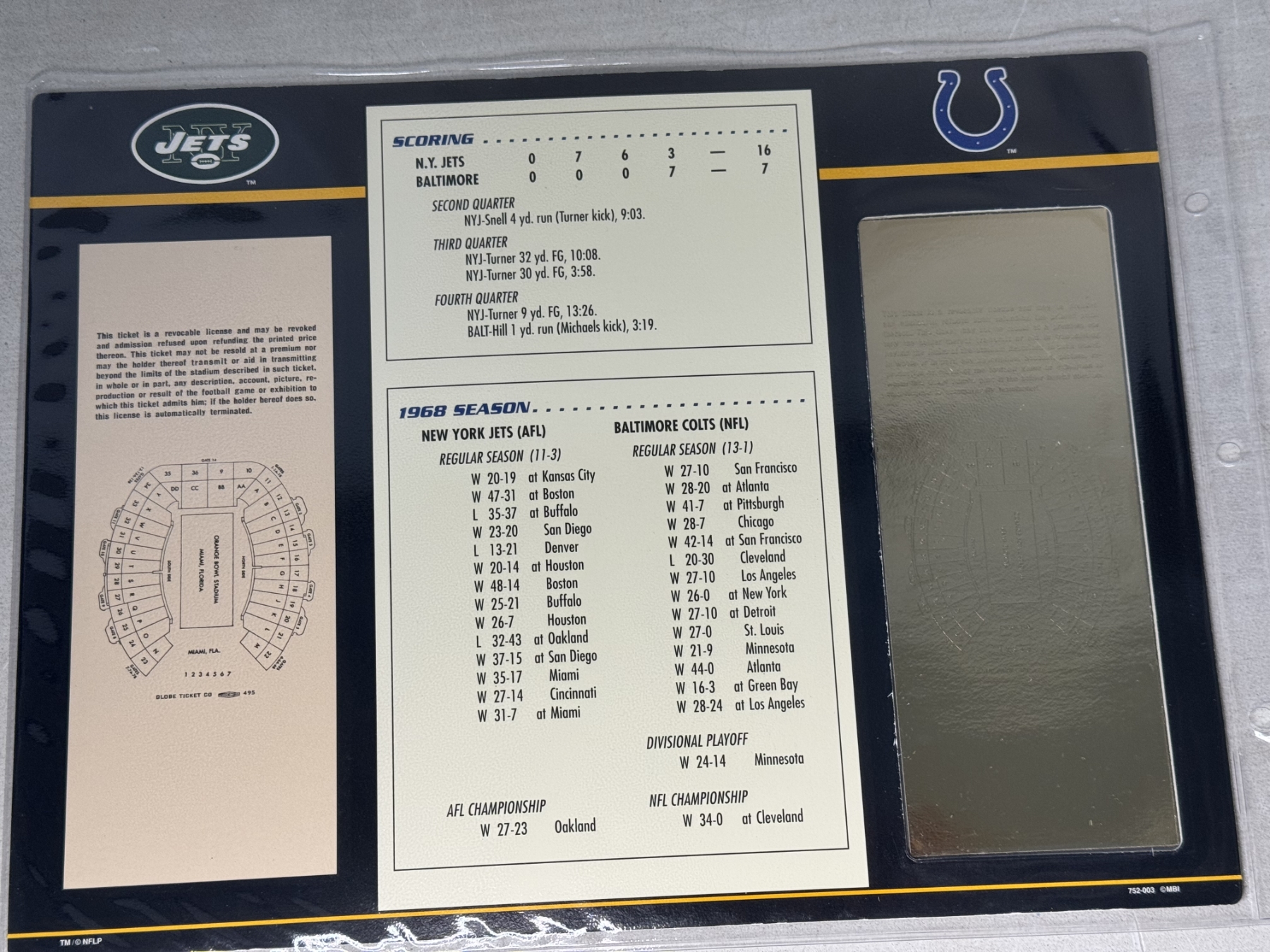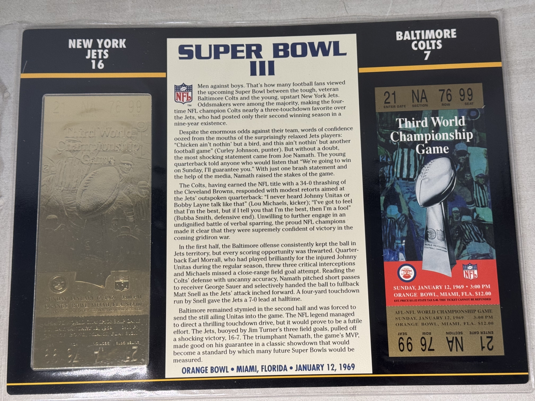 Authentic 1969 Super Bowl III NFL Football Ticket & 24K Gold Plated Ticket - Mint Condition