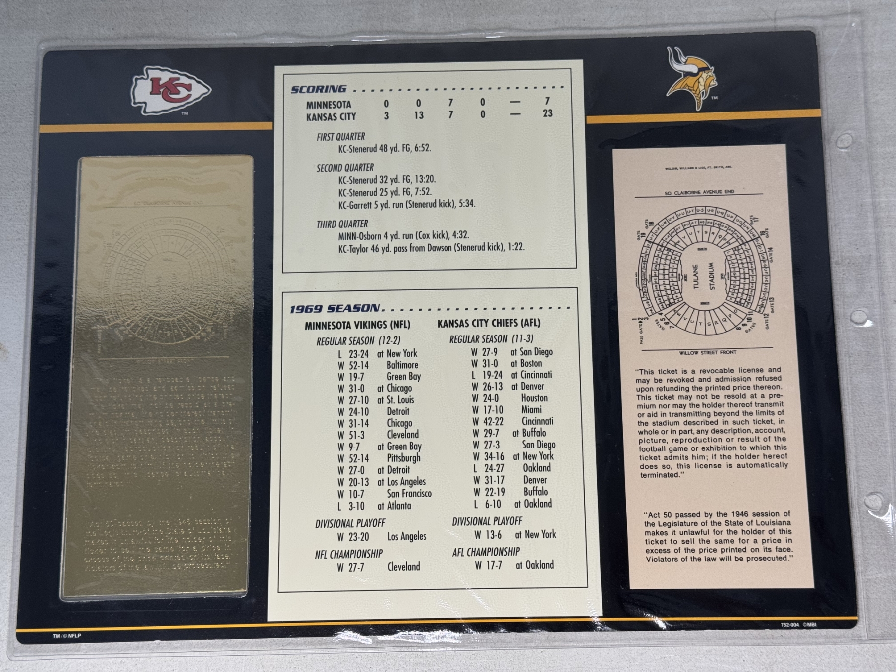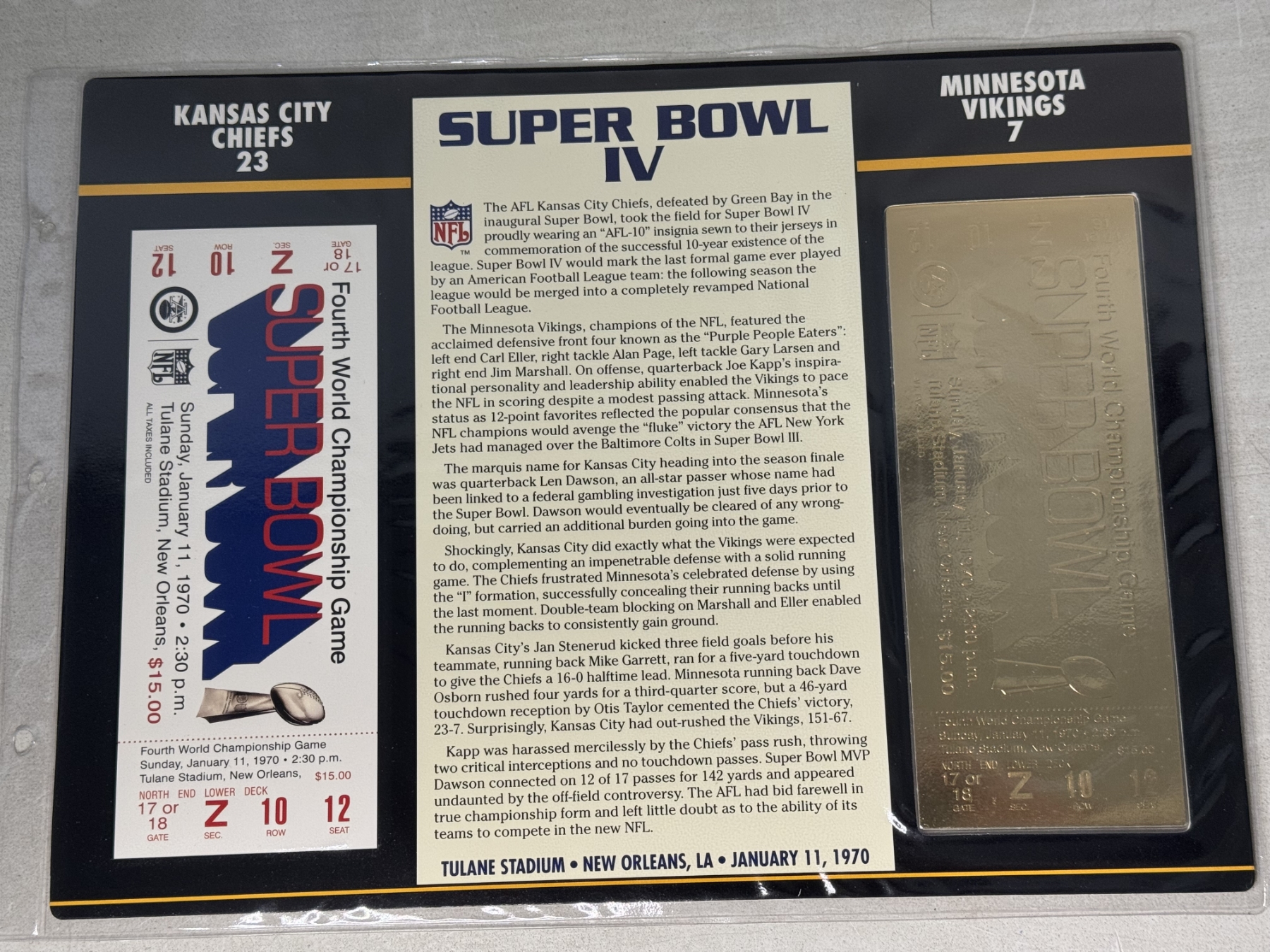 Authentic 1970 Super Bowl IV NFL Football Ticket & 24K Gold Plated Ticket - Mint Condition