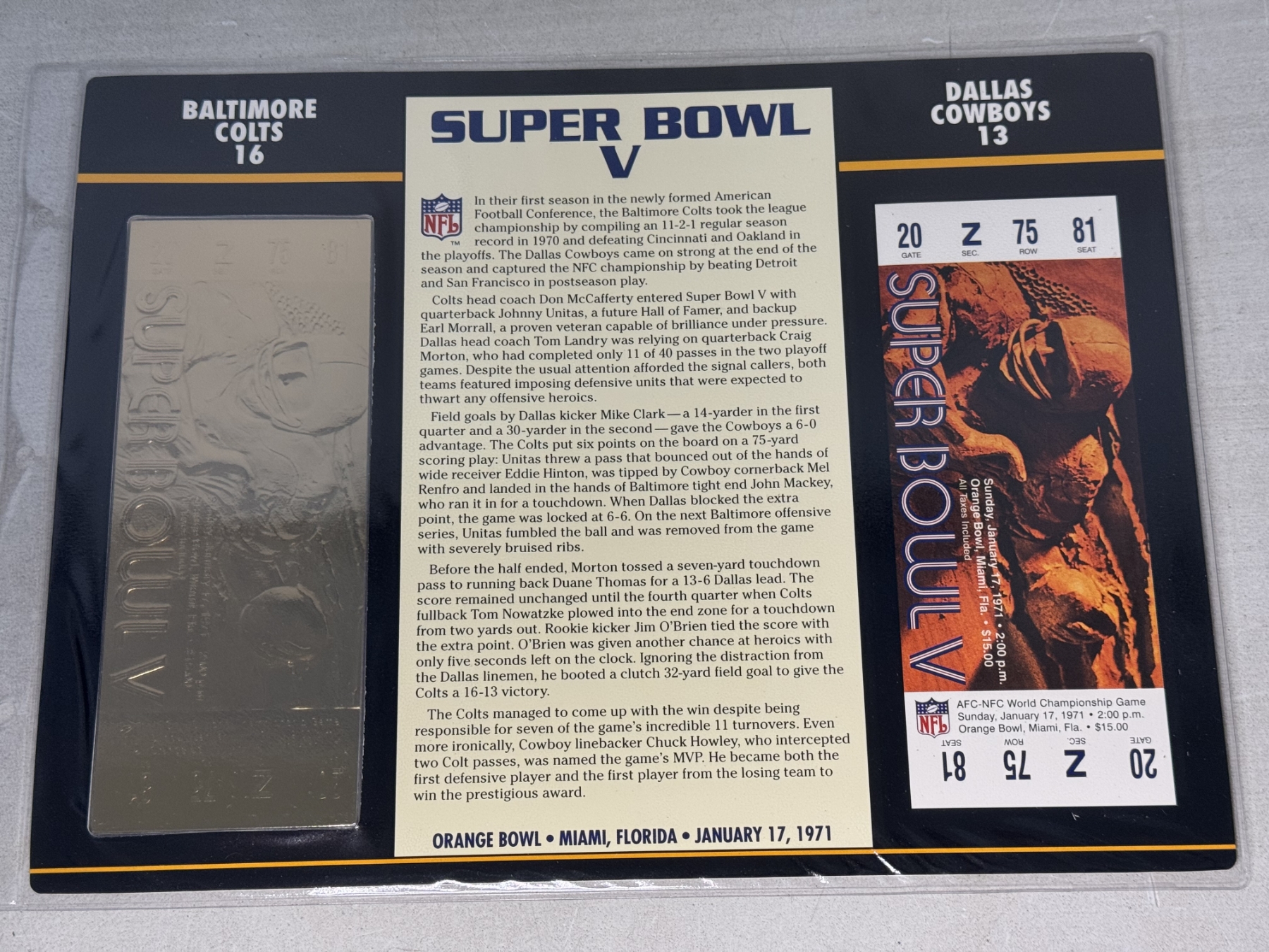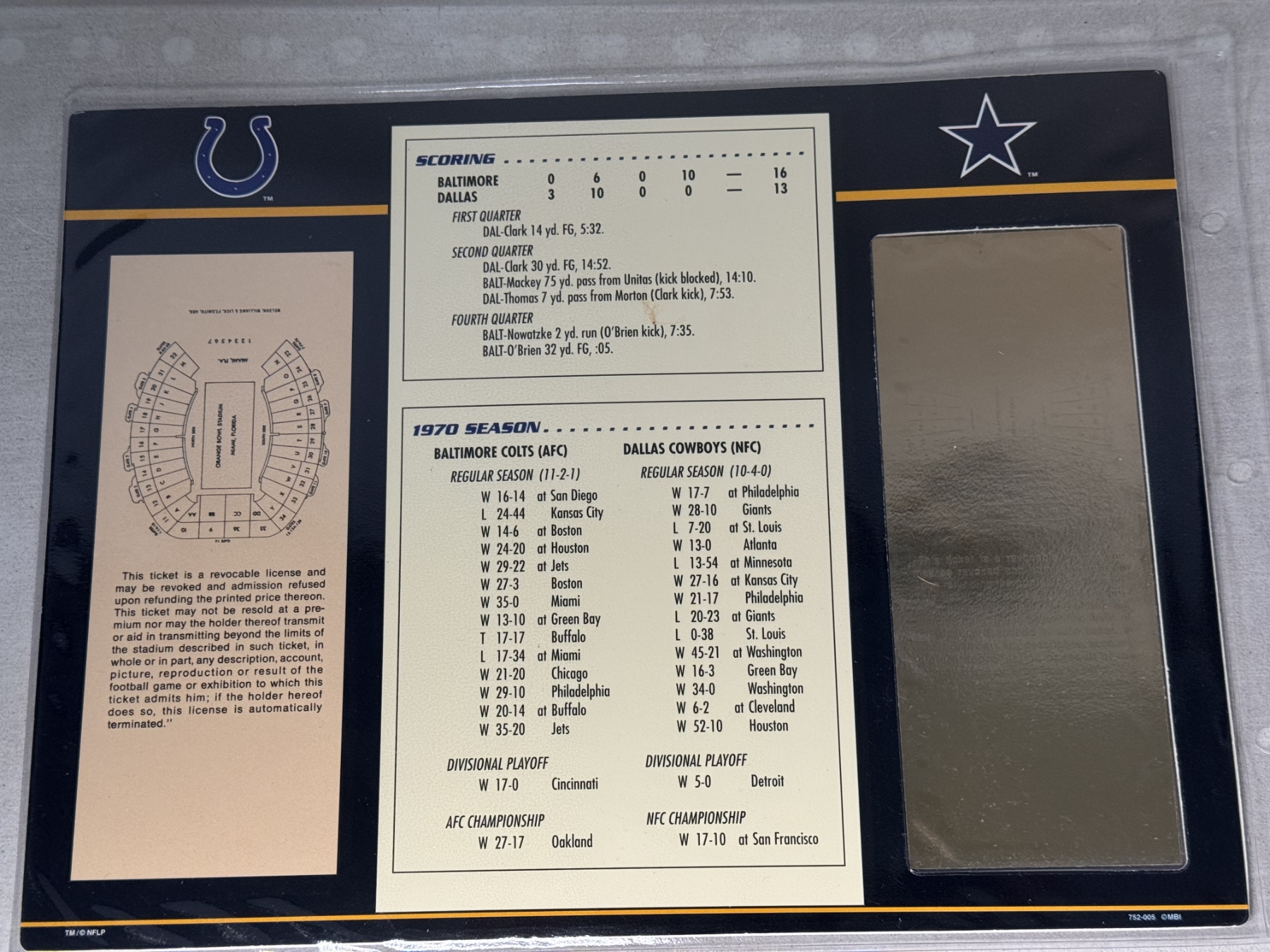 Authentic 1971 Super Bowl V NFL Football Ticket & 24K Gold Plated Ticket - Mint Condition