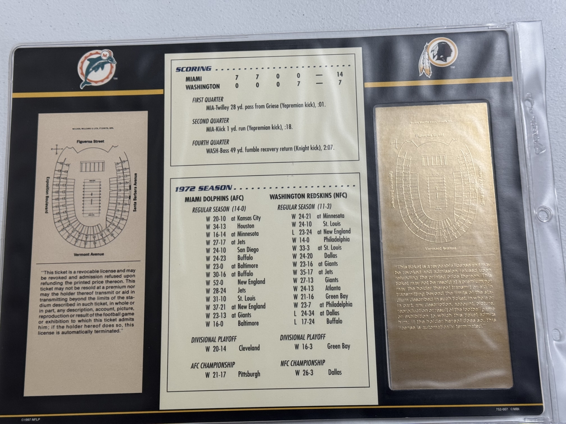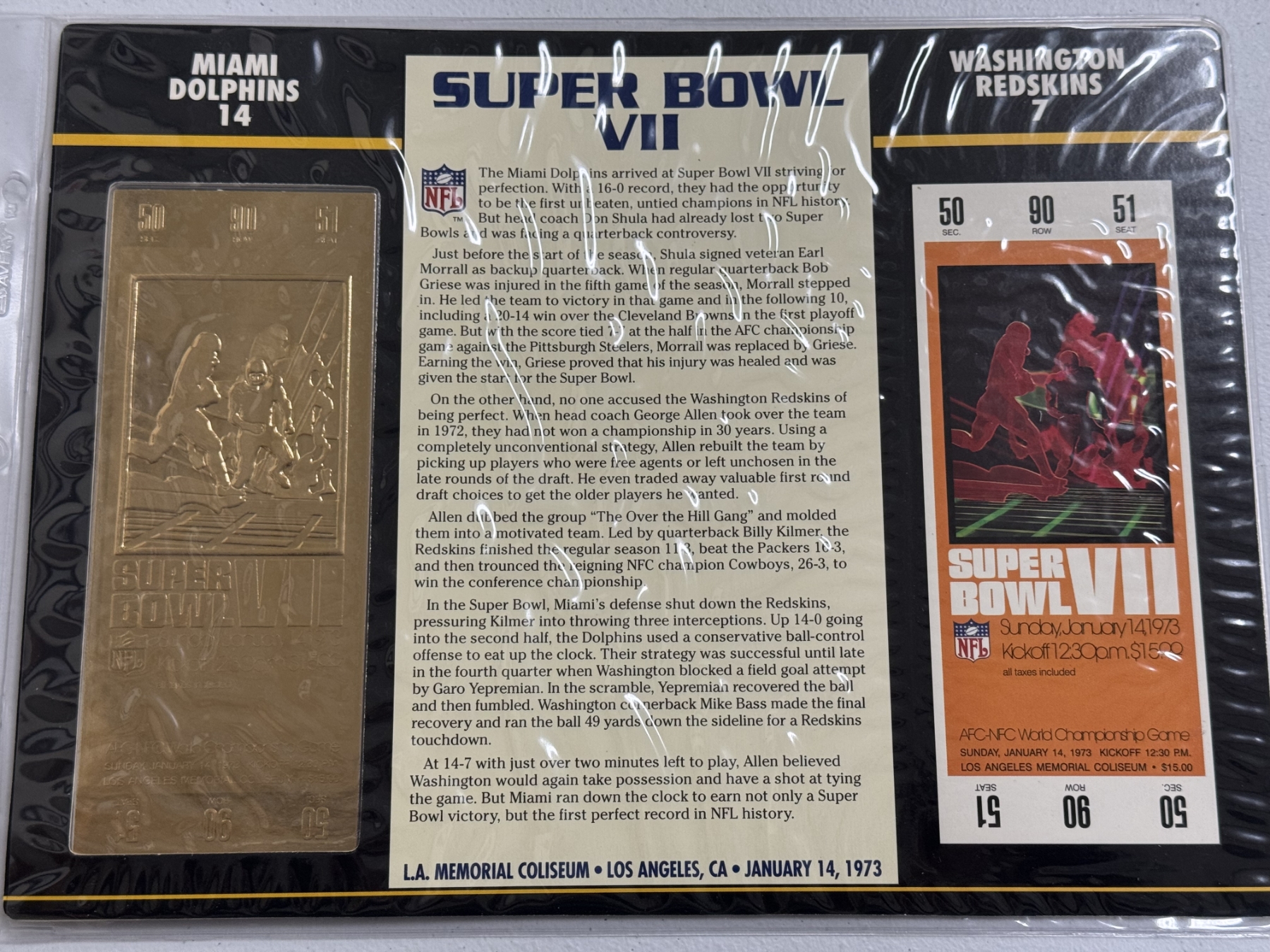 Authentic 1973 Super Bowl VII NFL Football Ticket & 24K Gold Plated Ticket - Mint Condition