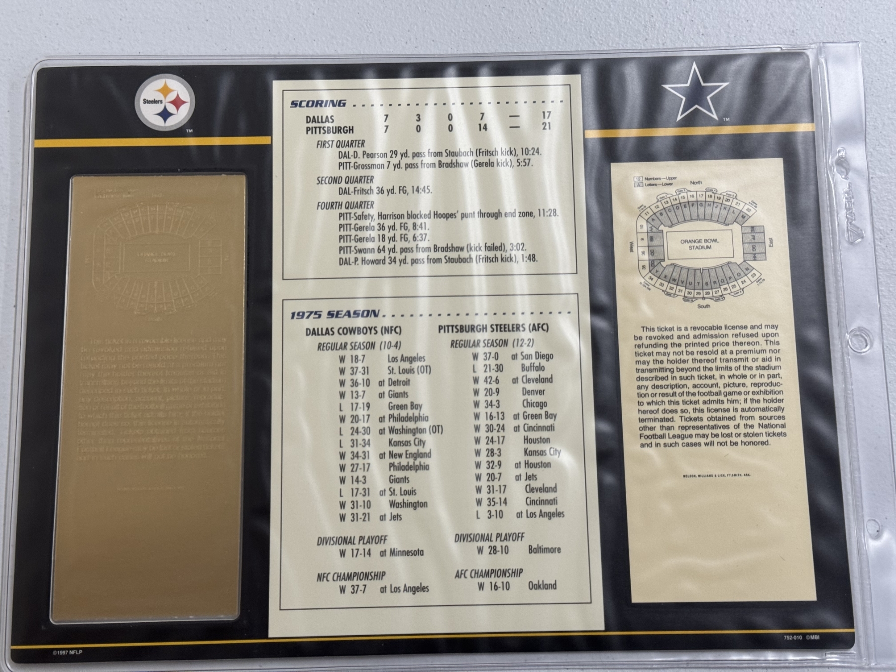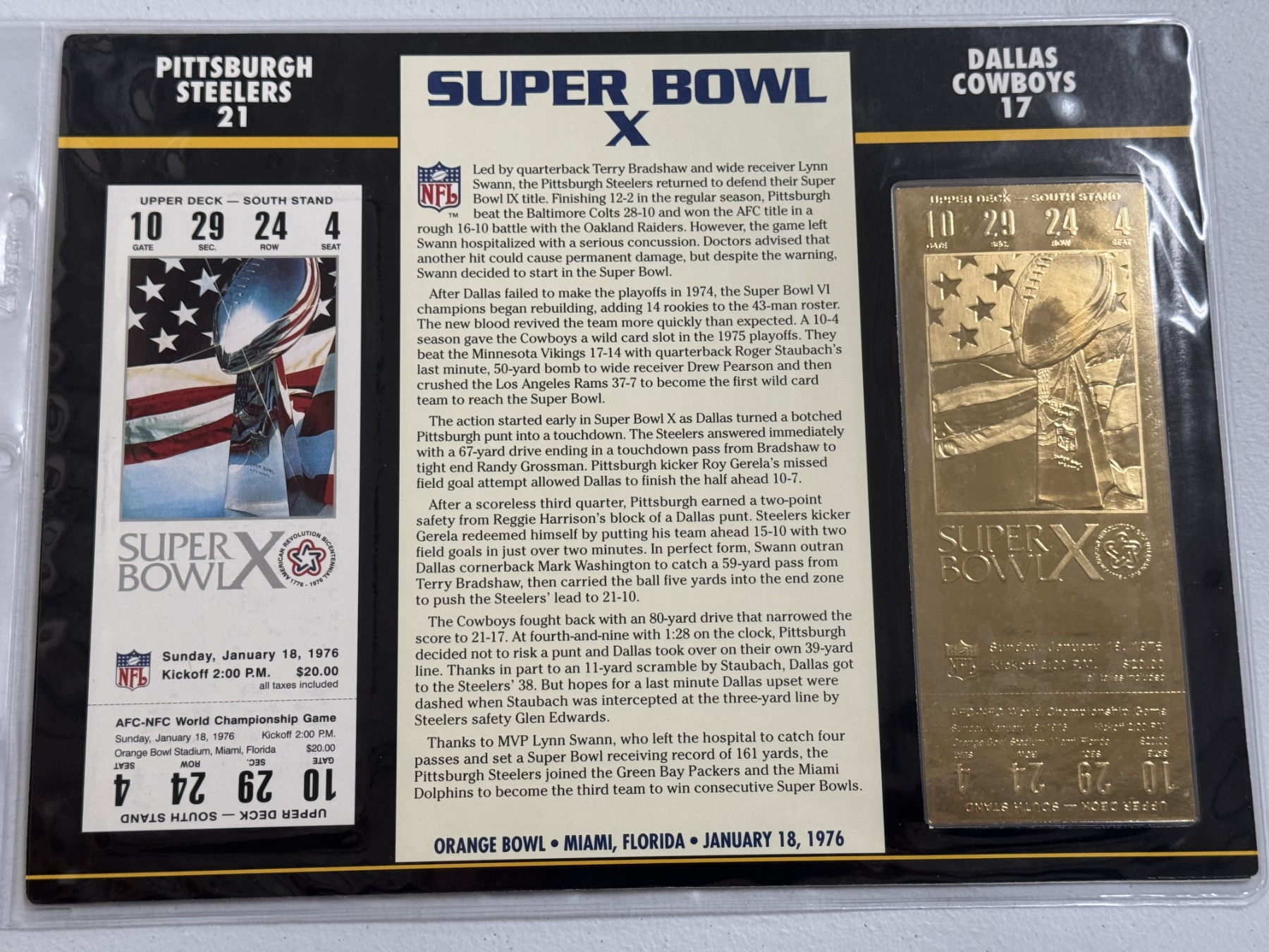 Authentic 1976 Super Bowl X NFL Football Ticket & 24K Gold Plated Ticket - Mint Condition