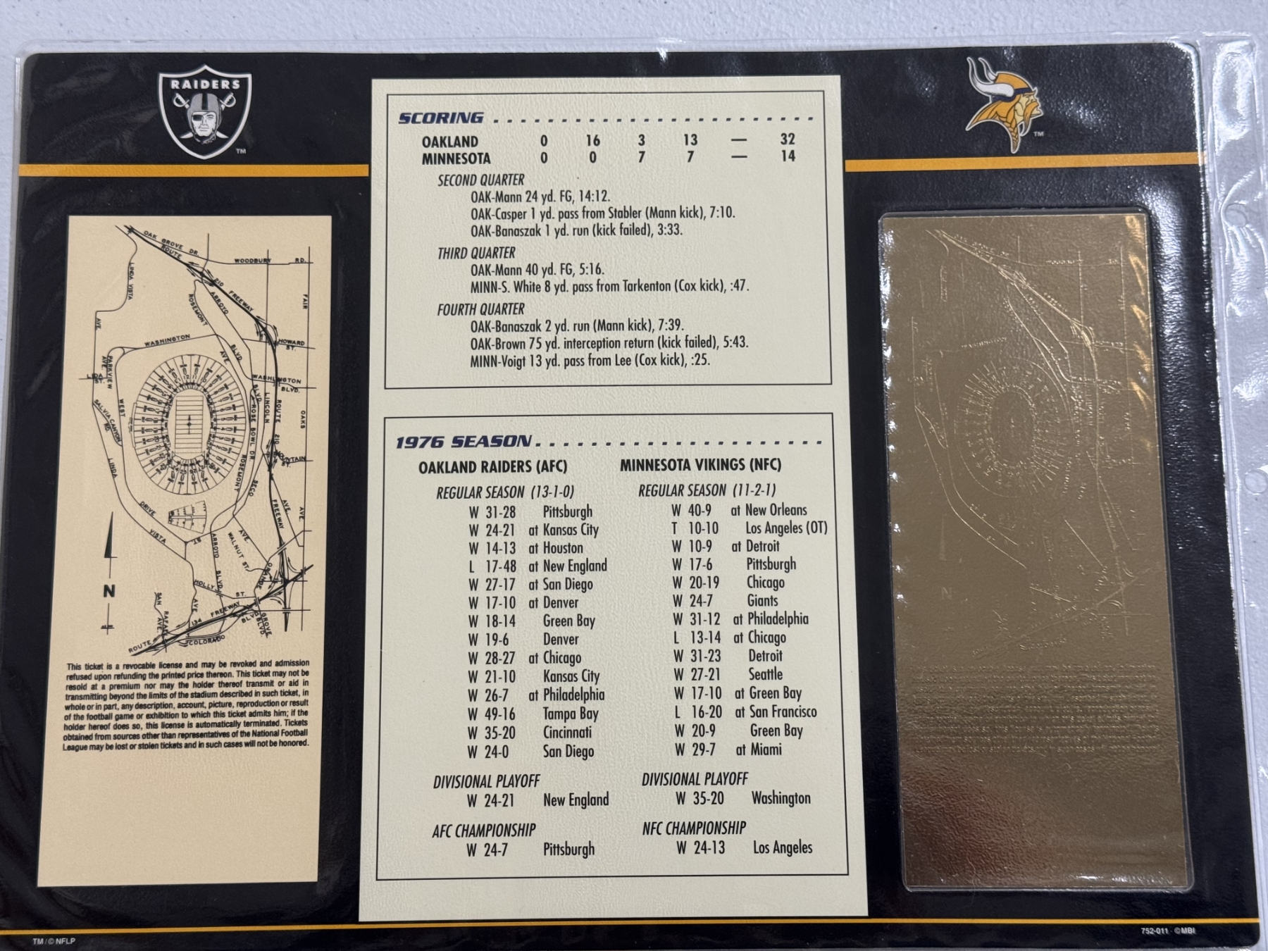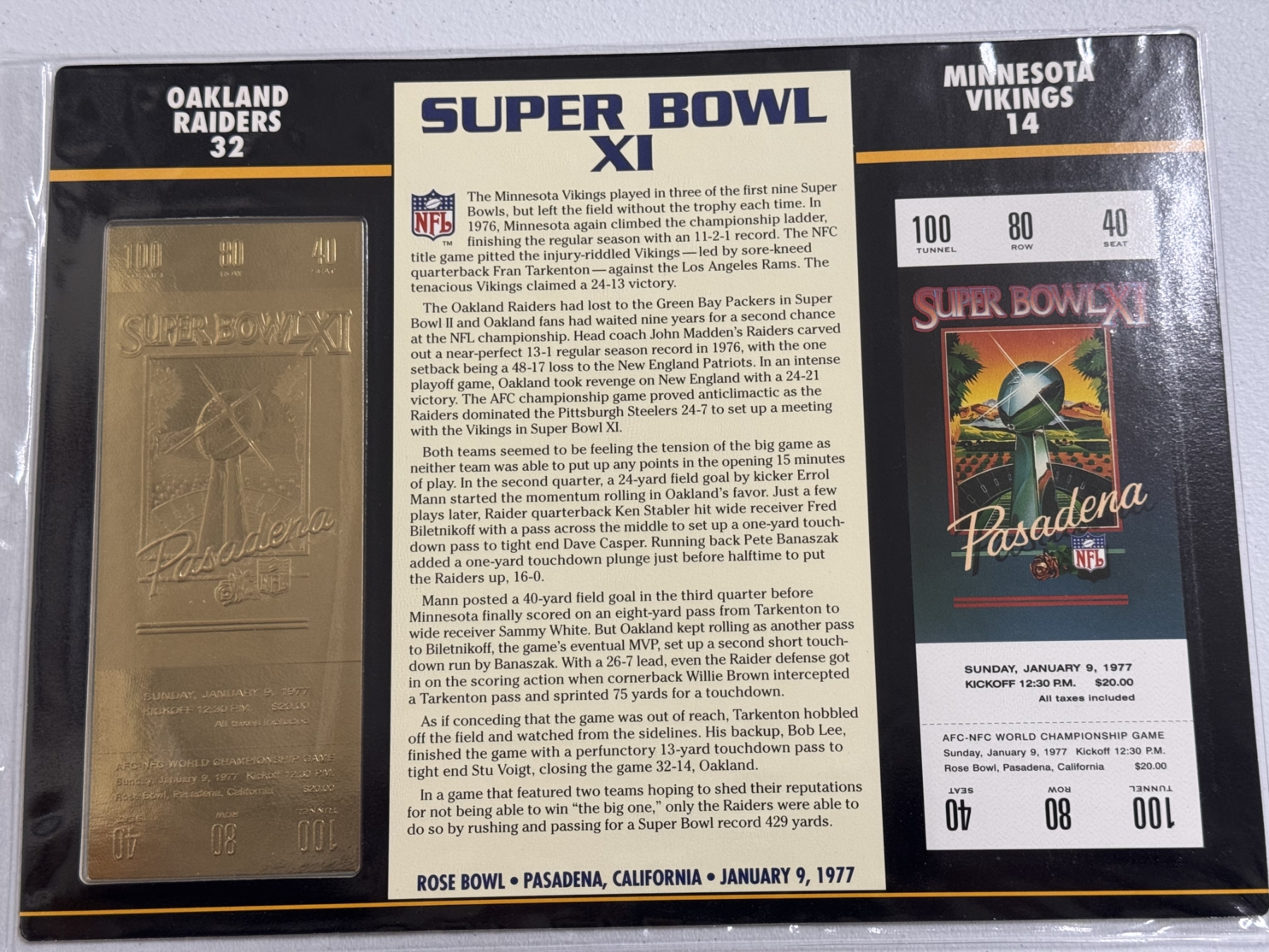 Authentic 1977 Super Bowl XI NFL Football Ticket & 24K Gold Plated Ticket - Mint Condition