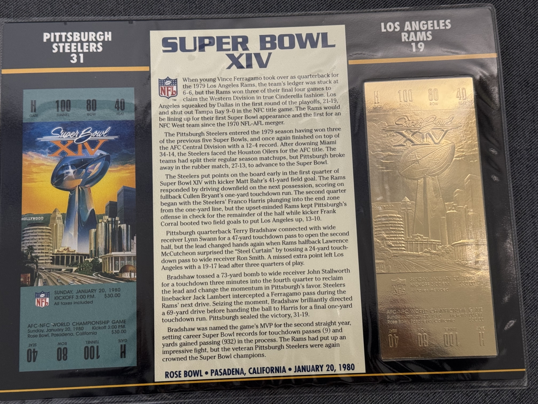 Authentic 1980 Super Bowl XIV NFL Football Ticket & 24K Gold Plated Ticket - Mint Condition