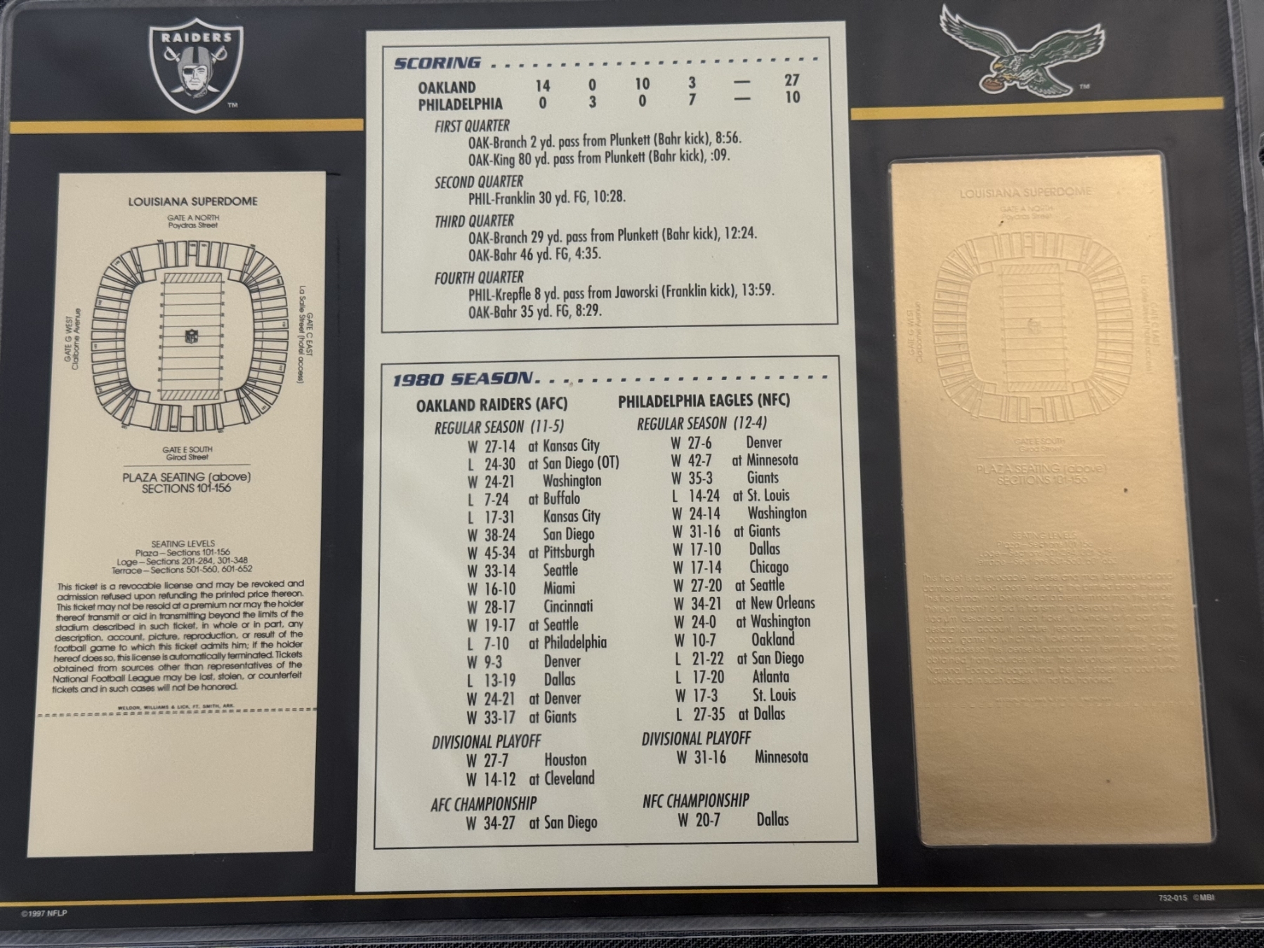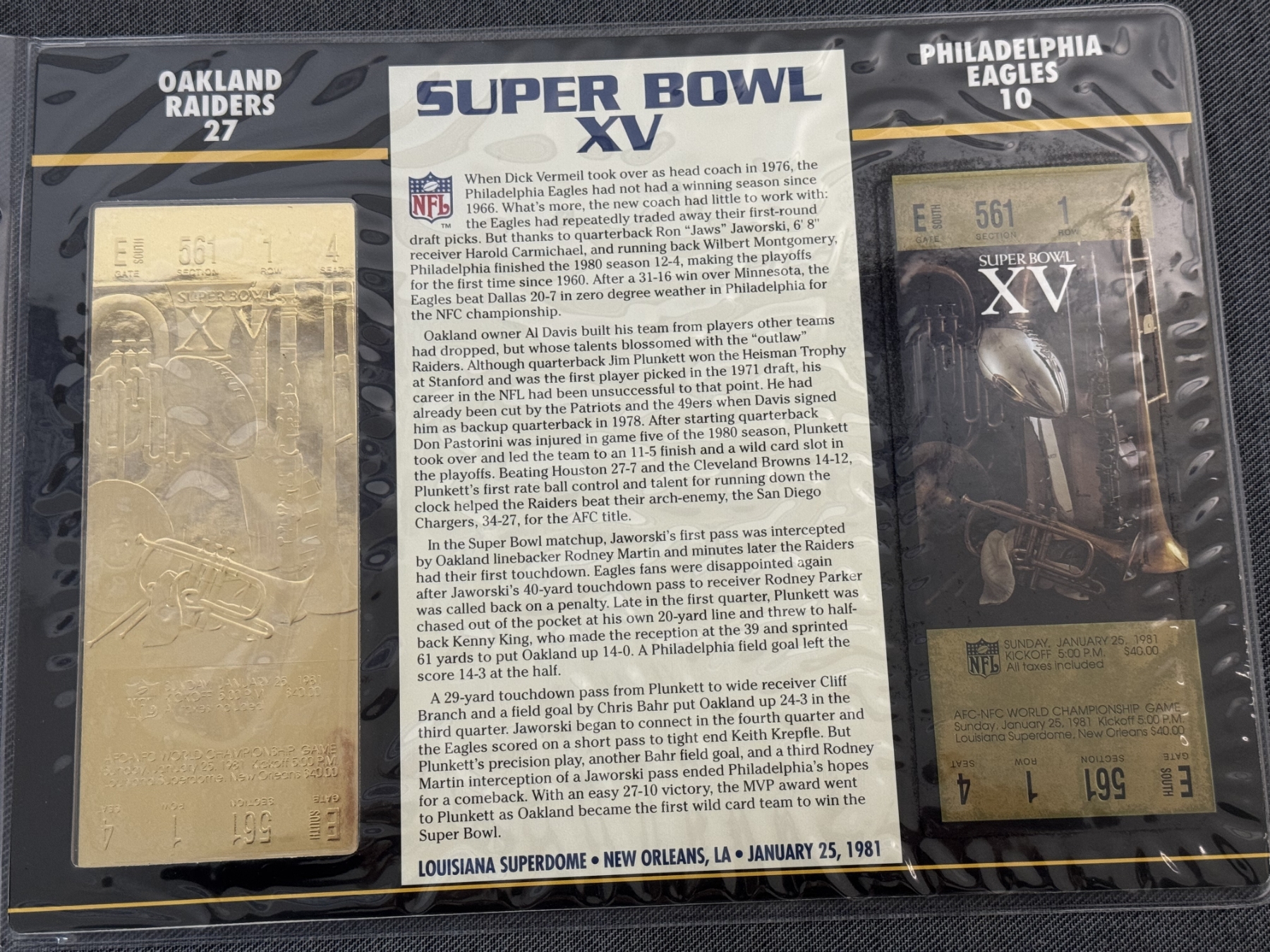 Authentic 1981 Super Bowl XV NFL Football Ticket & 24K Gold Plated Ticket - Mint Condition