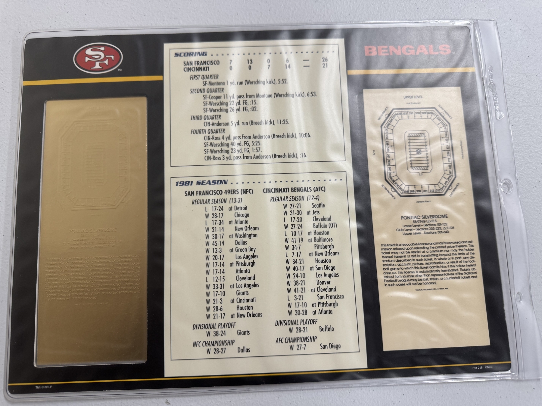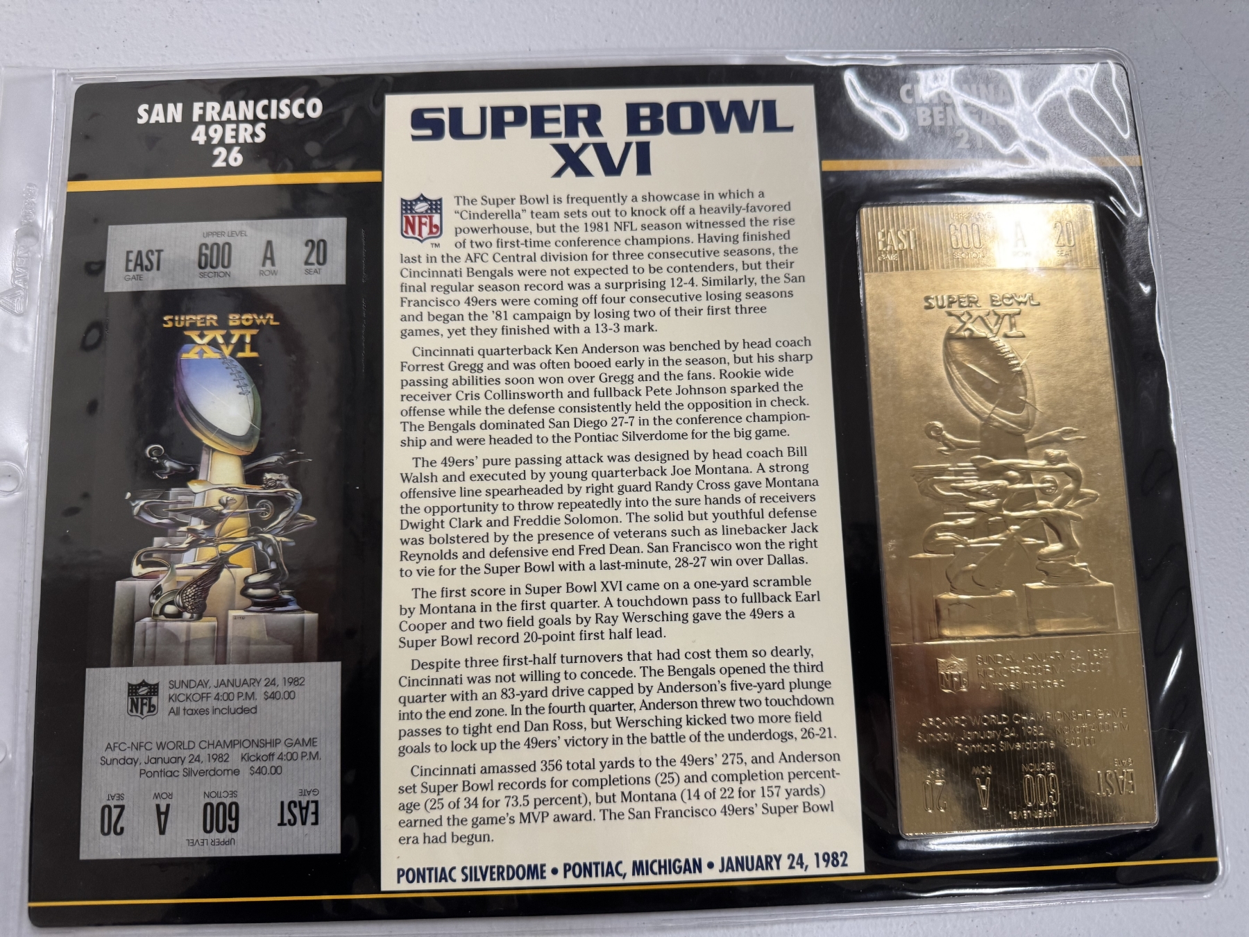 Authentic 1982 Super Bowl XVI NFL Football Ticket & 24K Gold Plated Ticket - Mint Condition