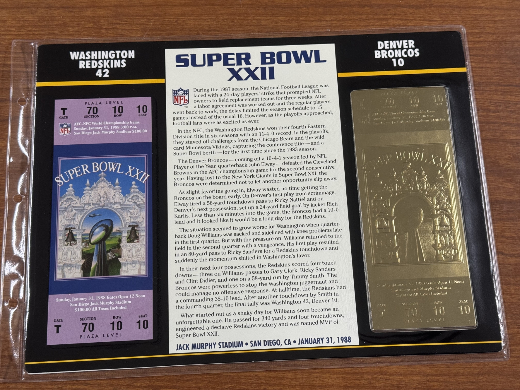 Authentic 1988 Super Bowl XXII NFL Football Ticket & 24K Gold Plated Ticket - Mint Condition