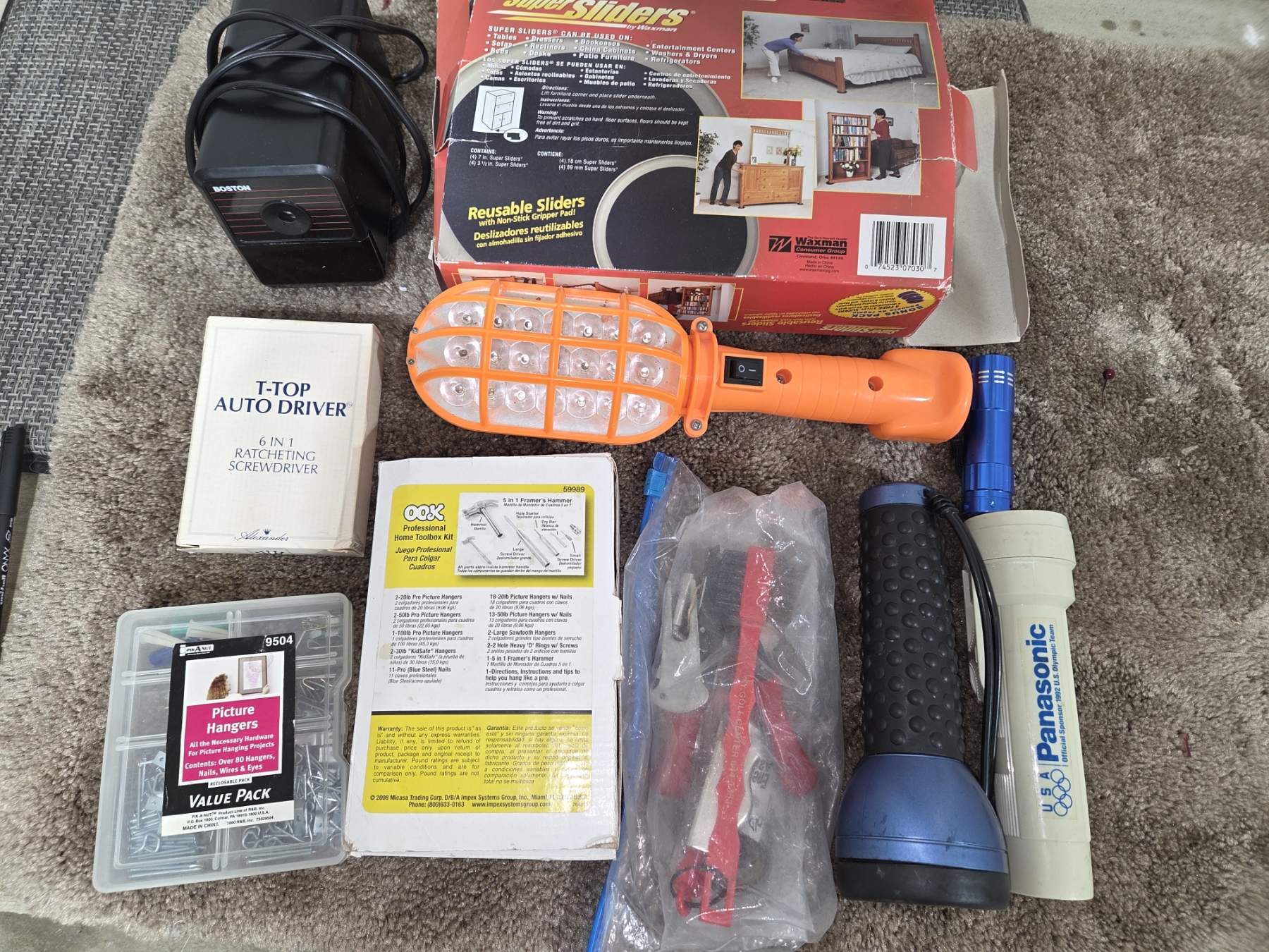 Awesome Group Of Home Essentials, Flashlights, Furniture Sliders, Picture Hangers, Garden Tools, Electric Pencil Sharpener. & More!