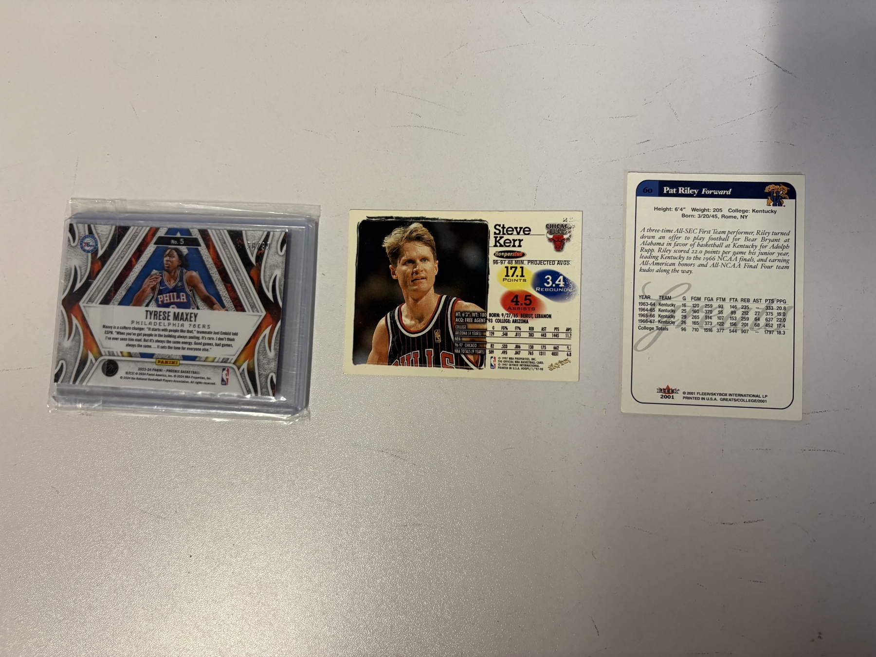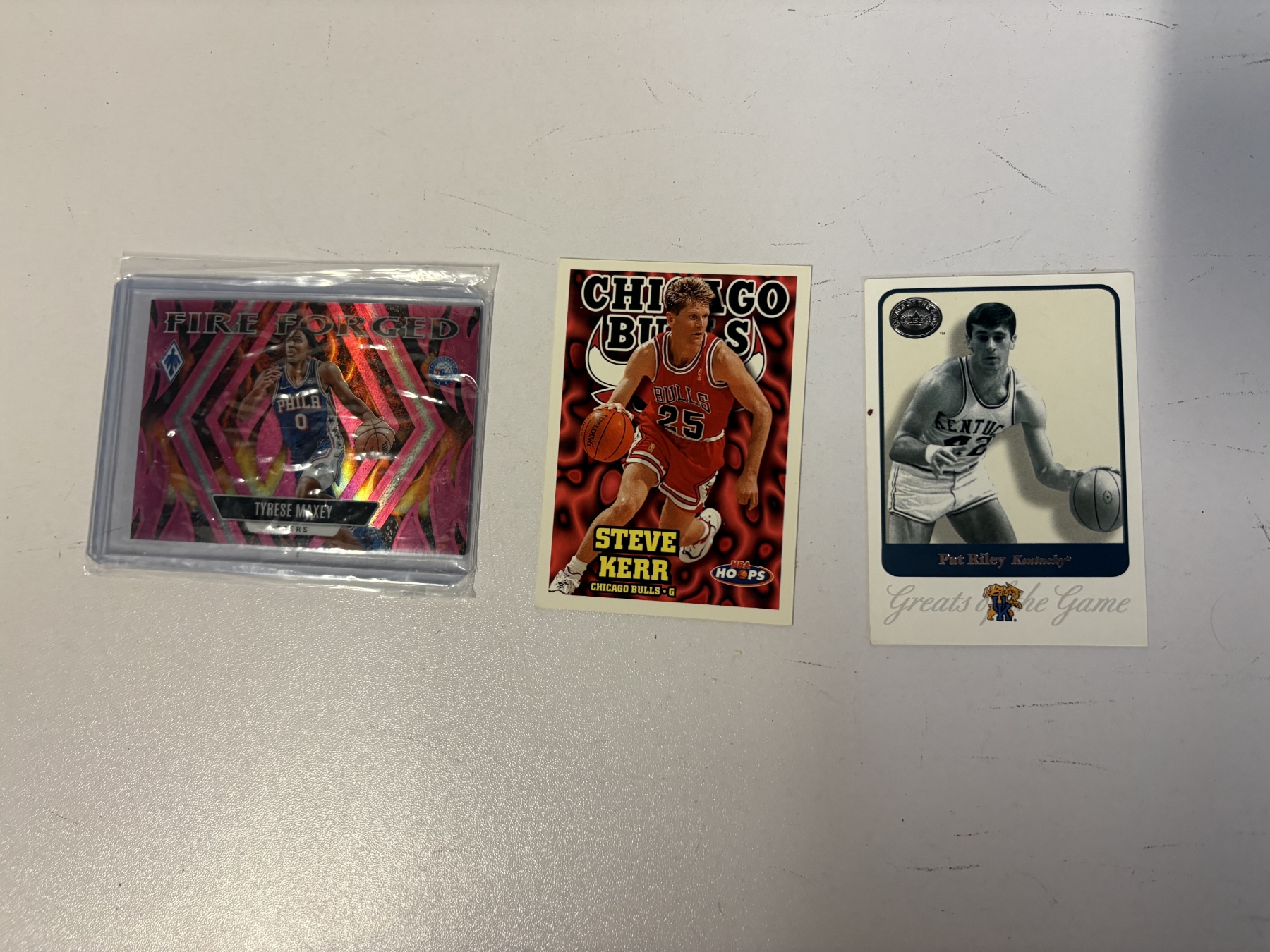Basketball Cards - 3 Cards - Fire Forged - Tyrese Maxey - Philadelphia 76ers - Steve Kerr - Chicago Bulls - Pat Riley - Kentucky - Fleer 2001 - NBA Hoops 1997 - 2023-24 Panini
