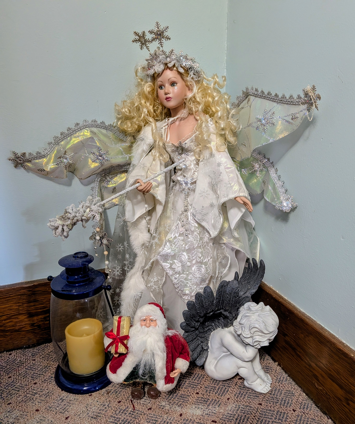 Beautiful 20" Collectors Angel Doll, Sitting Resin Angel, Metal Lantern, And Santa Doll