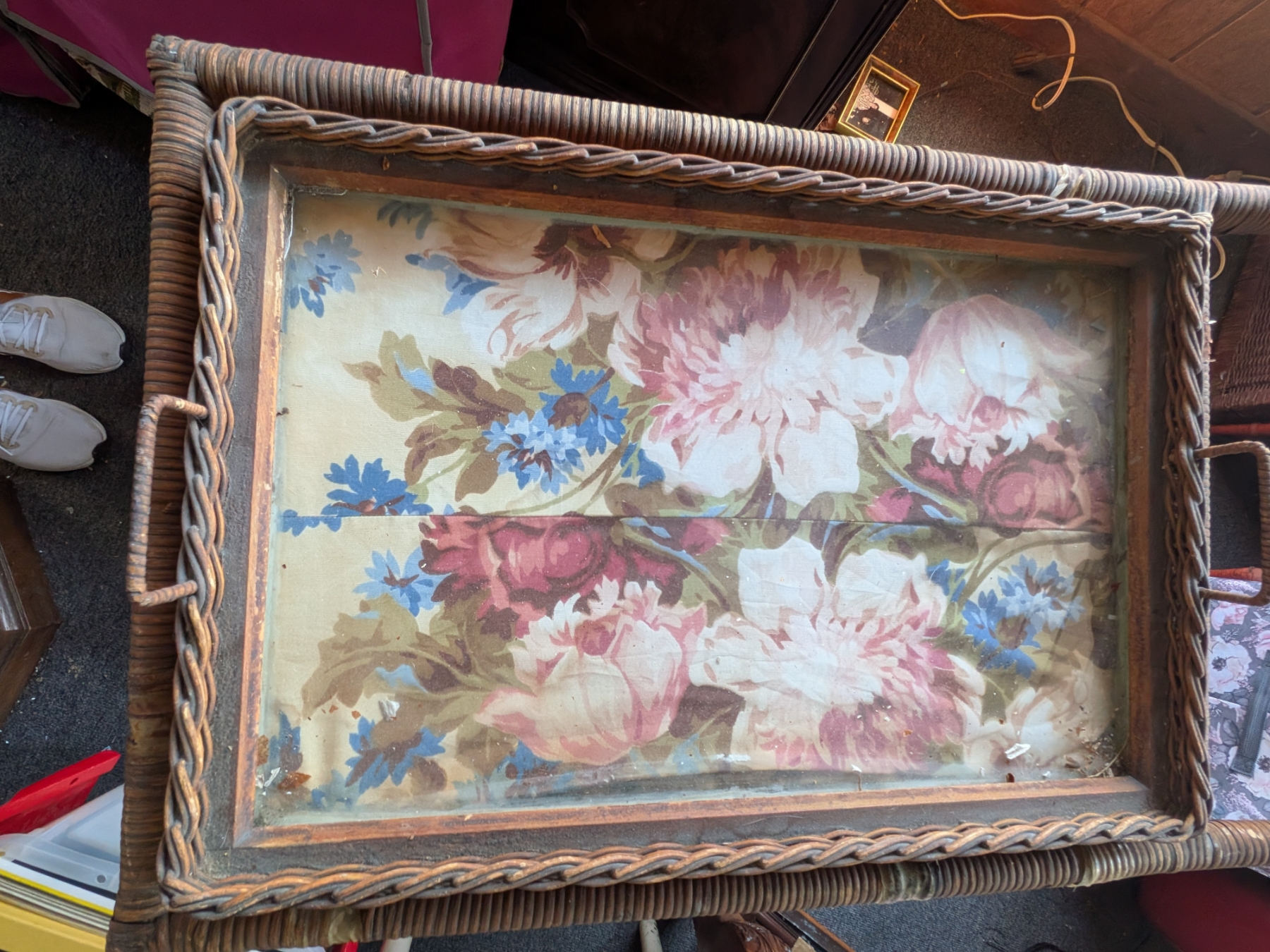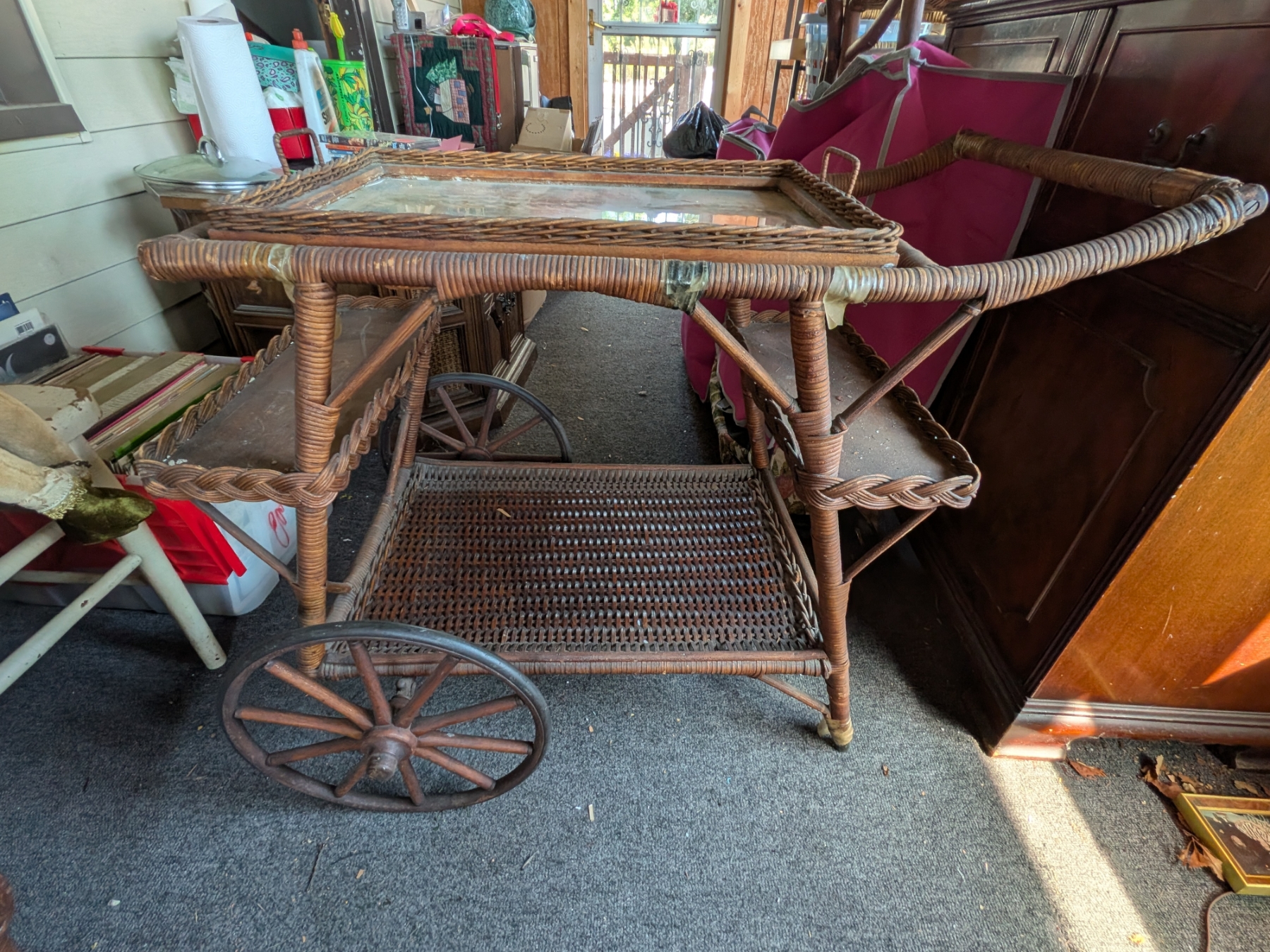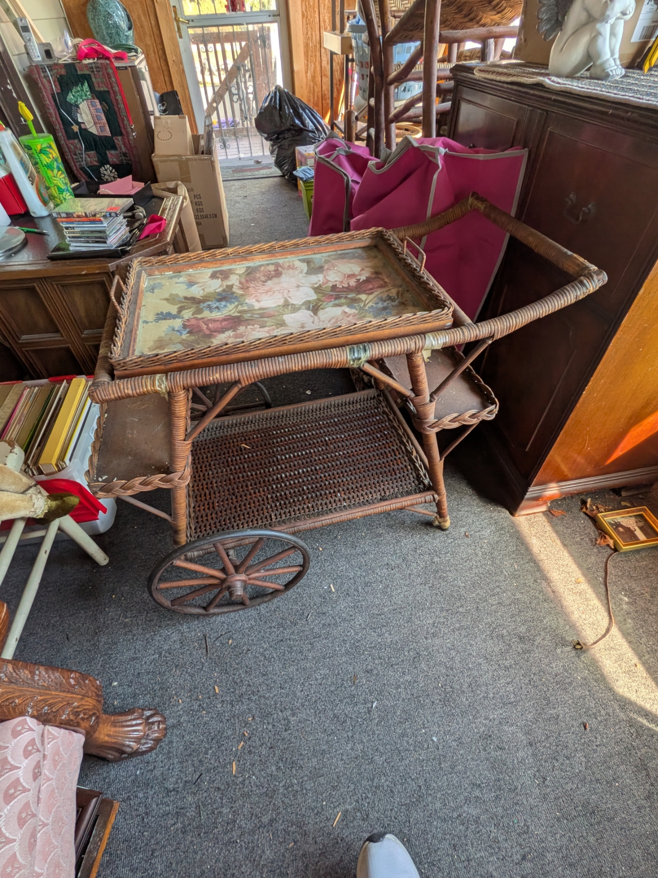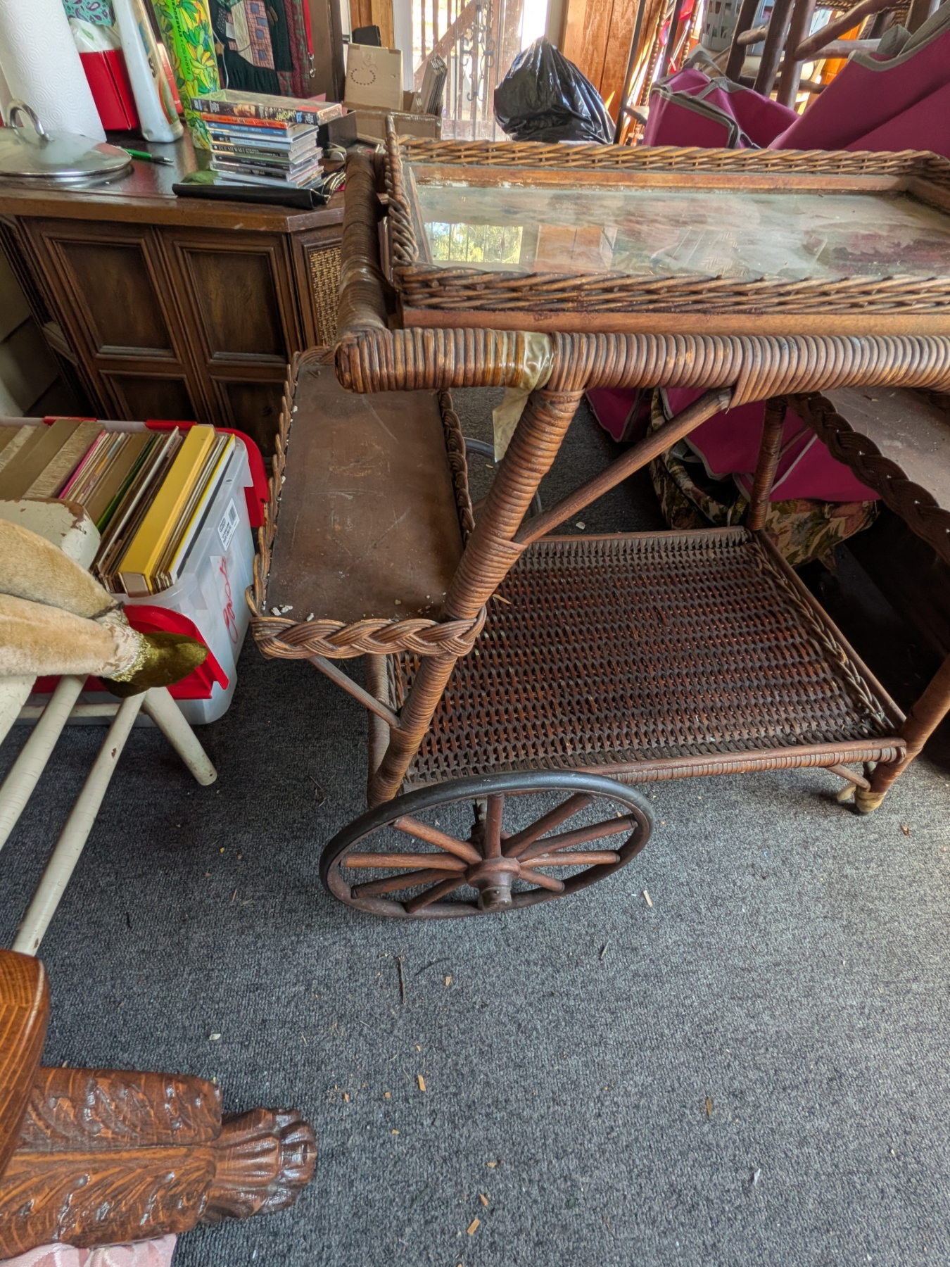 Beautiful Wicker Tea Cart With Floral Glass Top