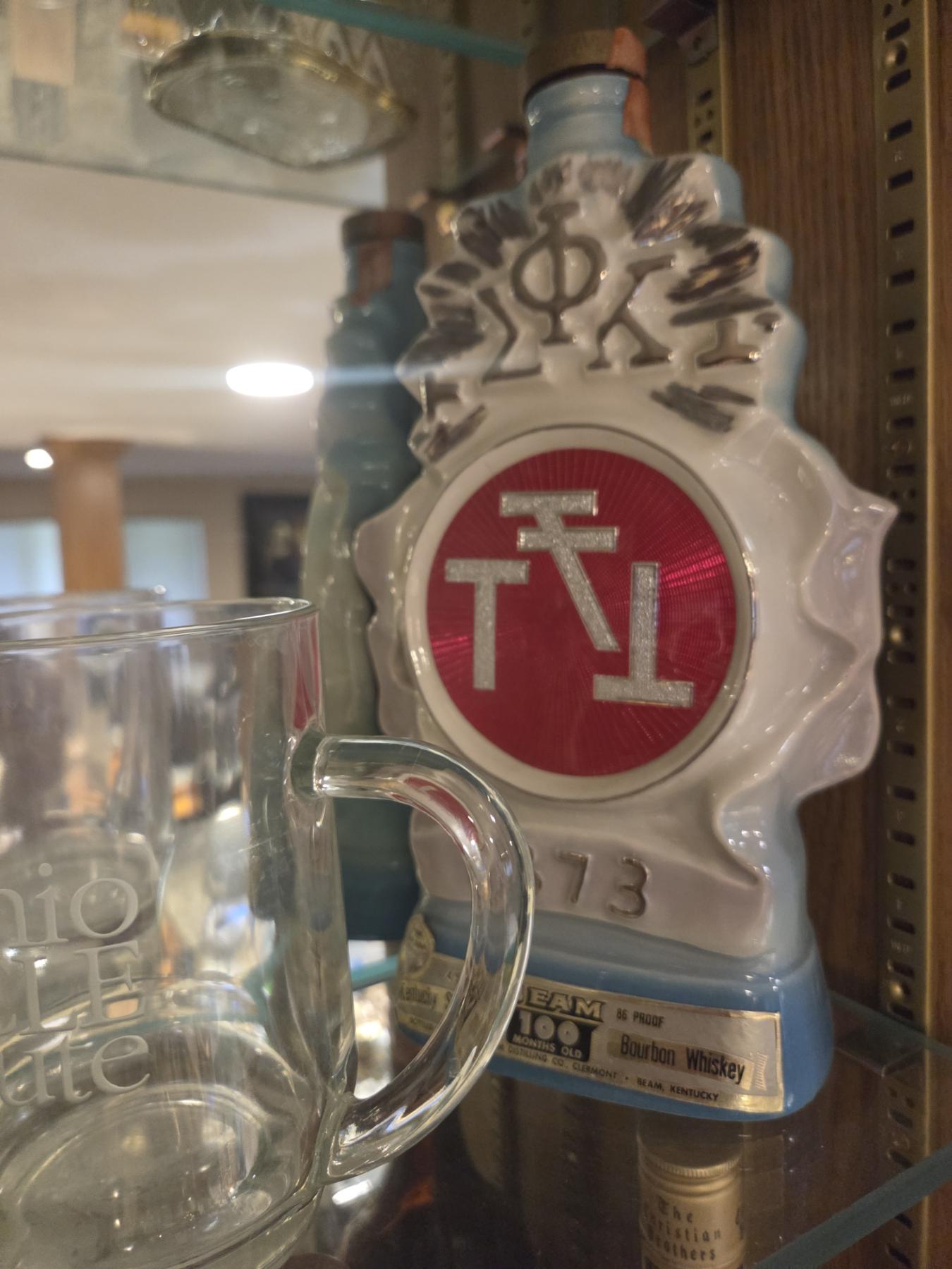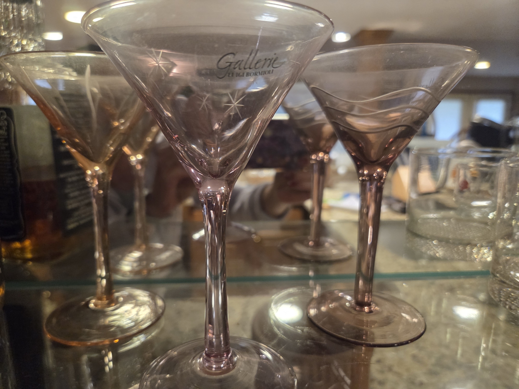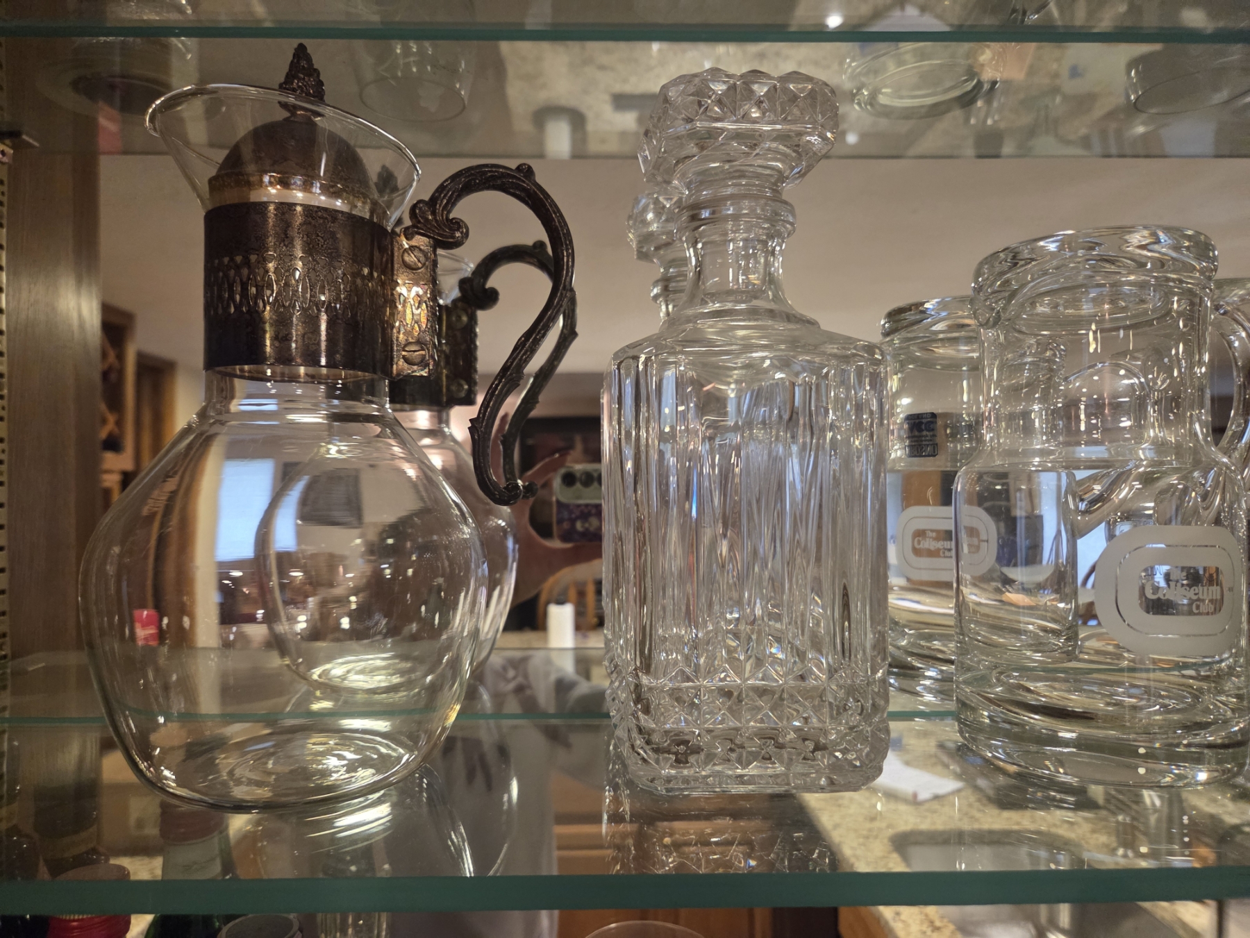 Bormioli Martini Glasses, Glass & Silver Wine Carafe, Crystal Bourbon Decanter, Assorted Bar Glasses, Vintage Jim Beam Bottle