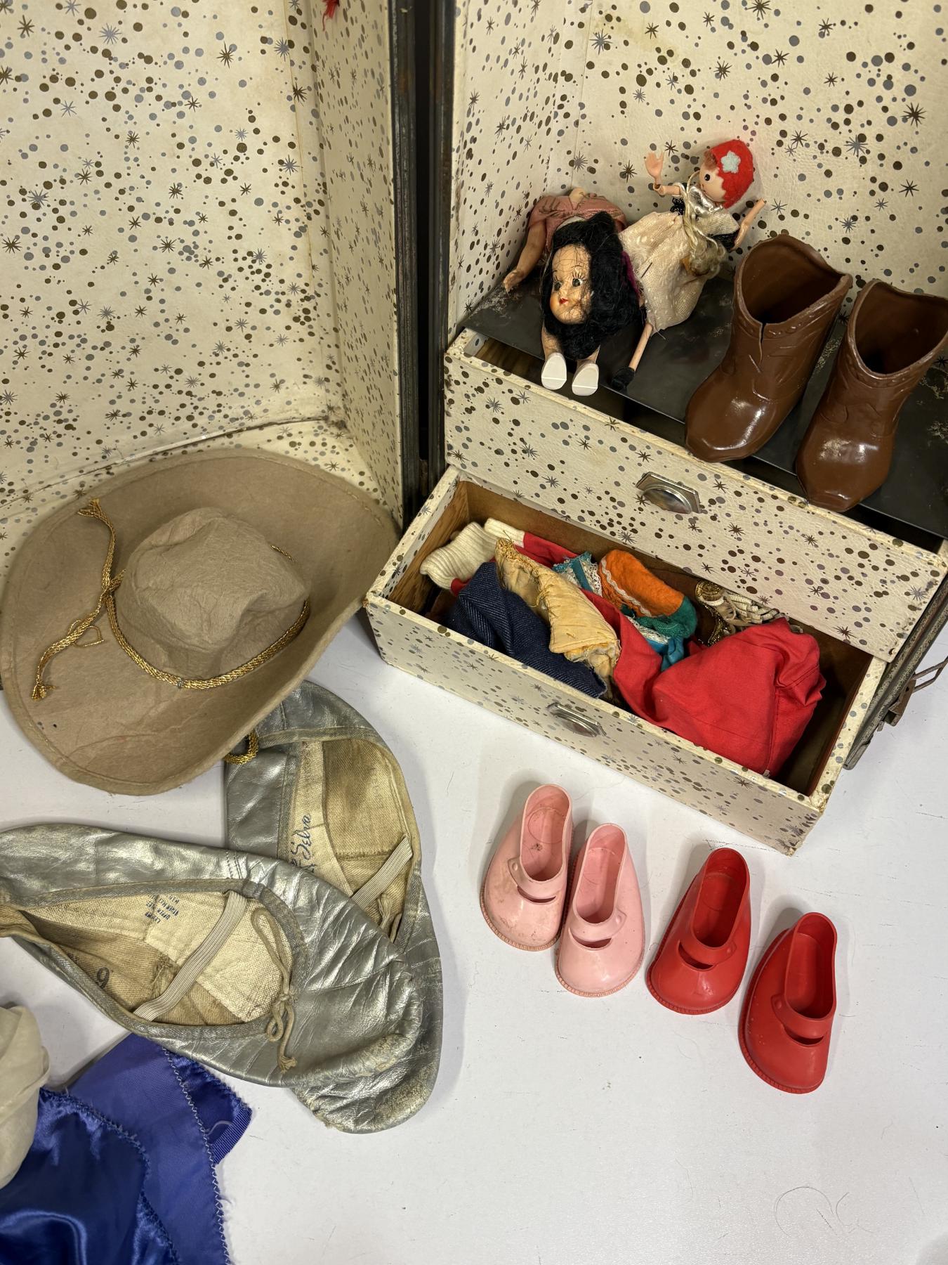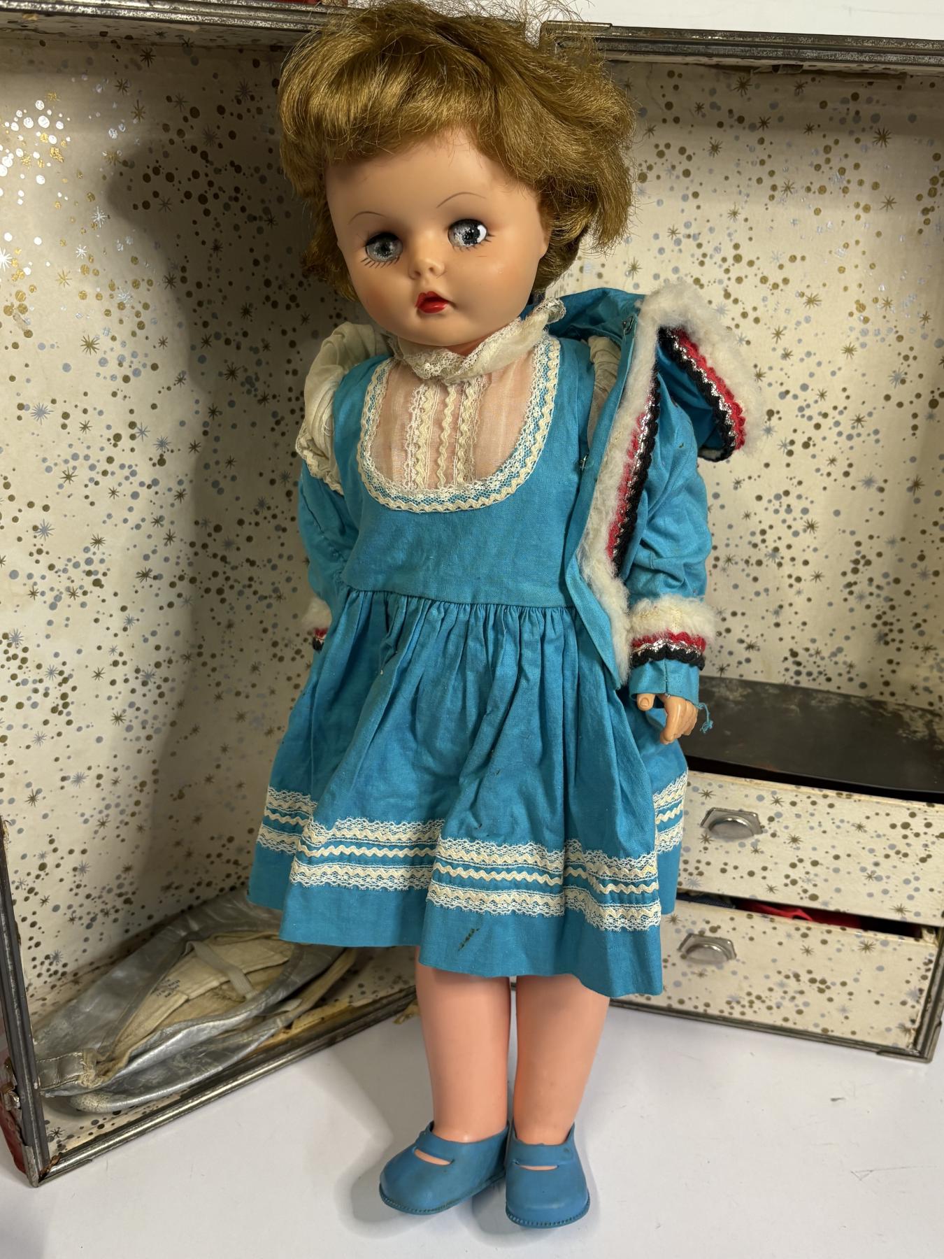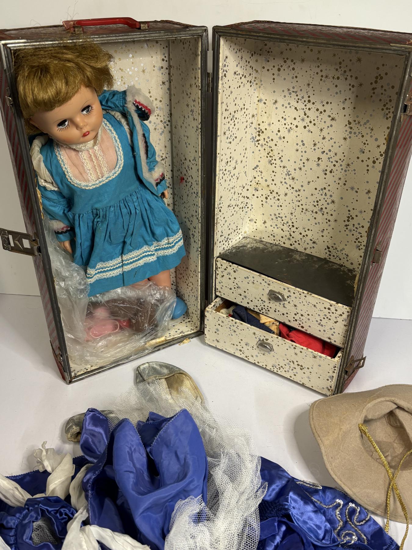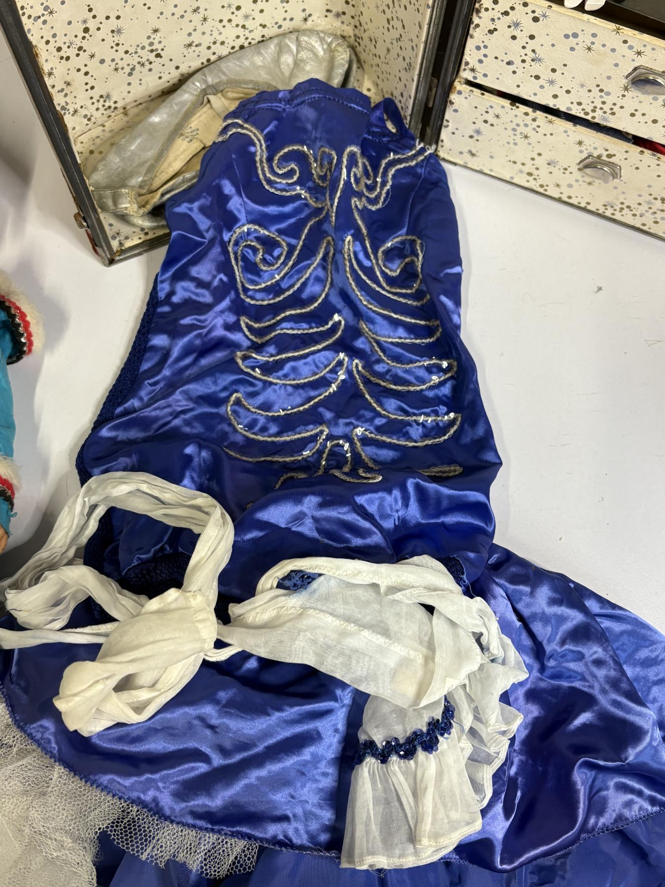 Box with Doll - Doll Clothing - Hat - Blue Skirt and Shirt with Ballet Shoes - Doll Shoes