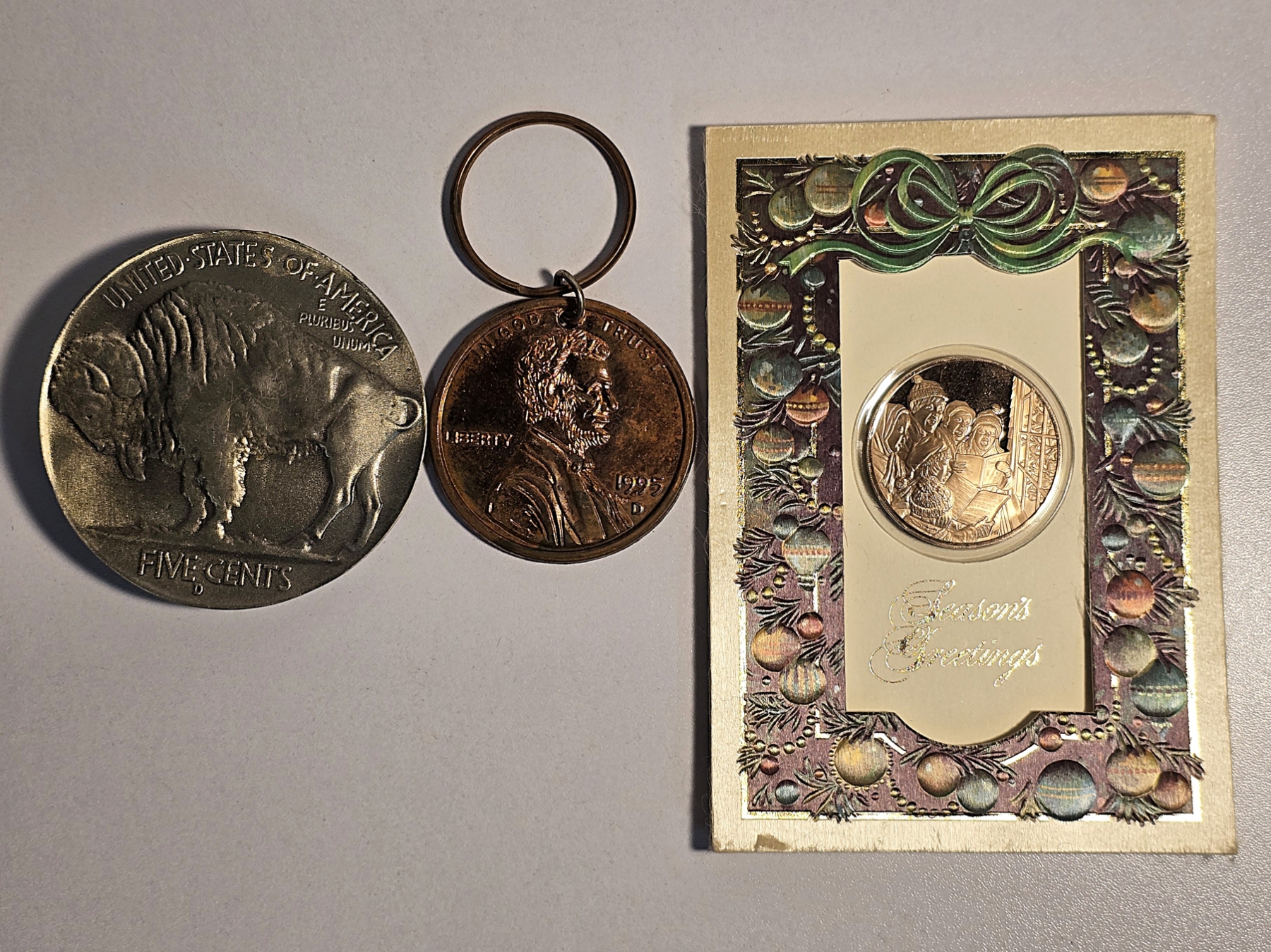 Buffalo Nickel Belt Buckle (3"), Penny Key Chain (2") & Seasons Greeting Commemorative Round (1.5")