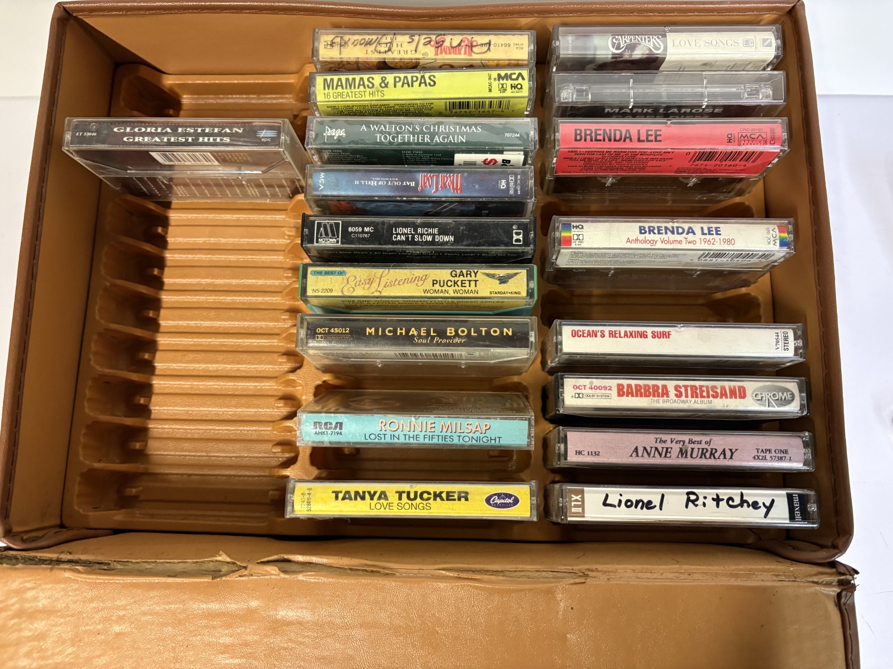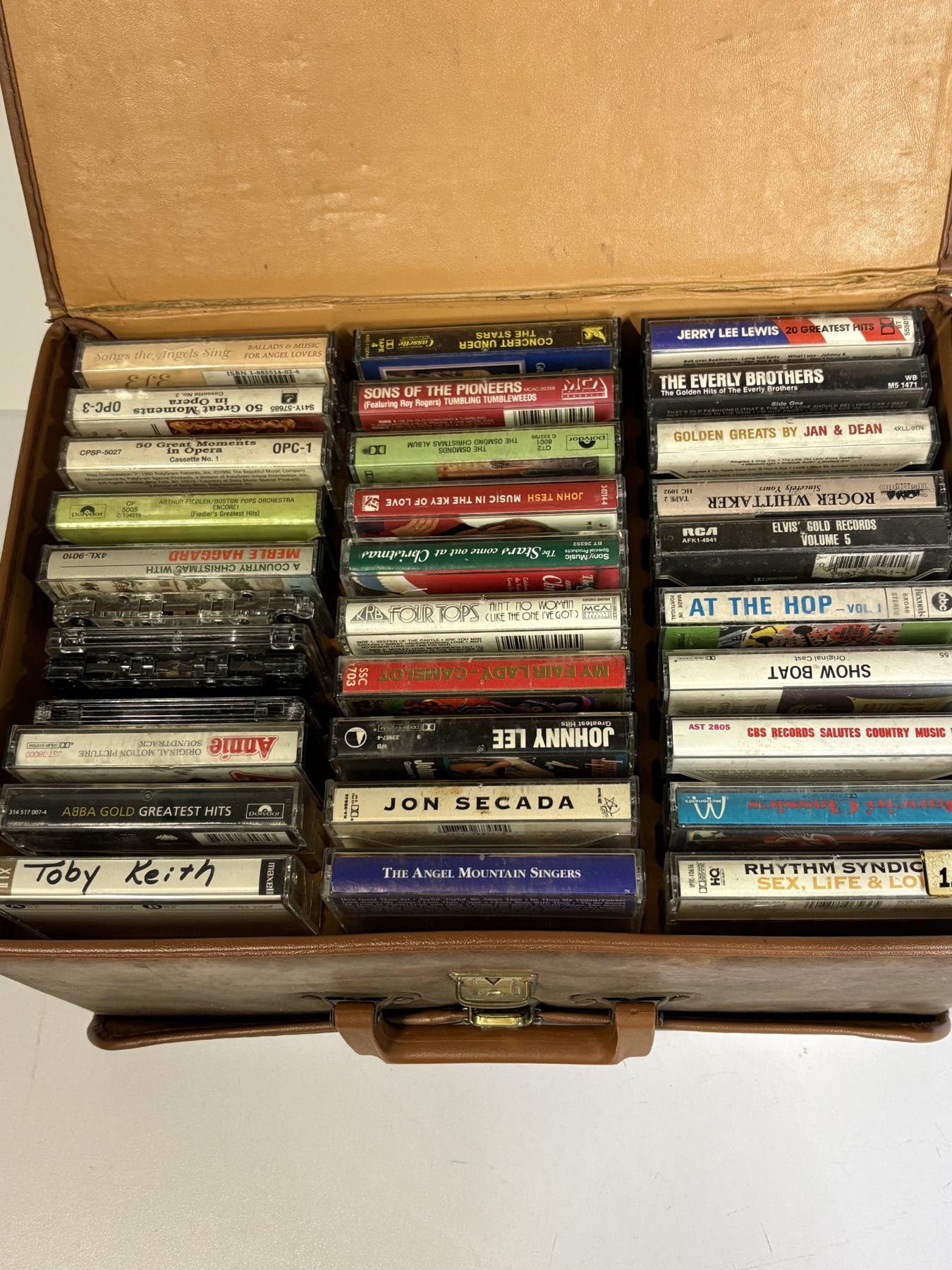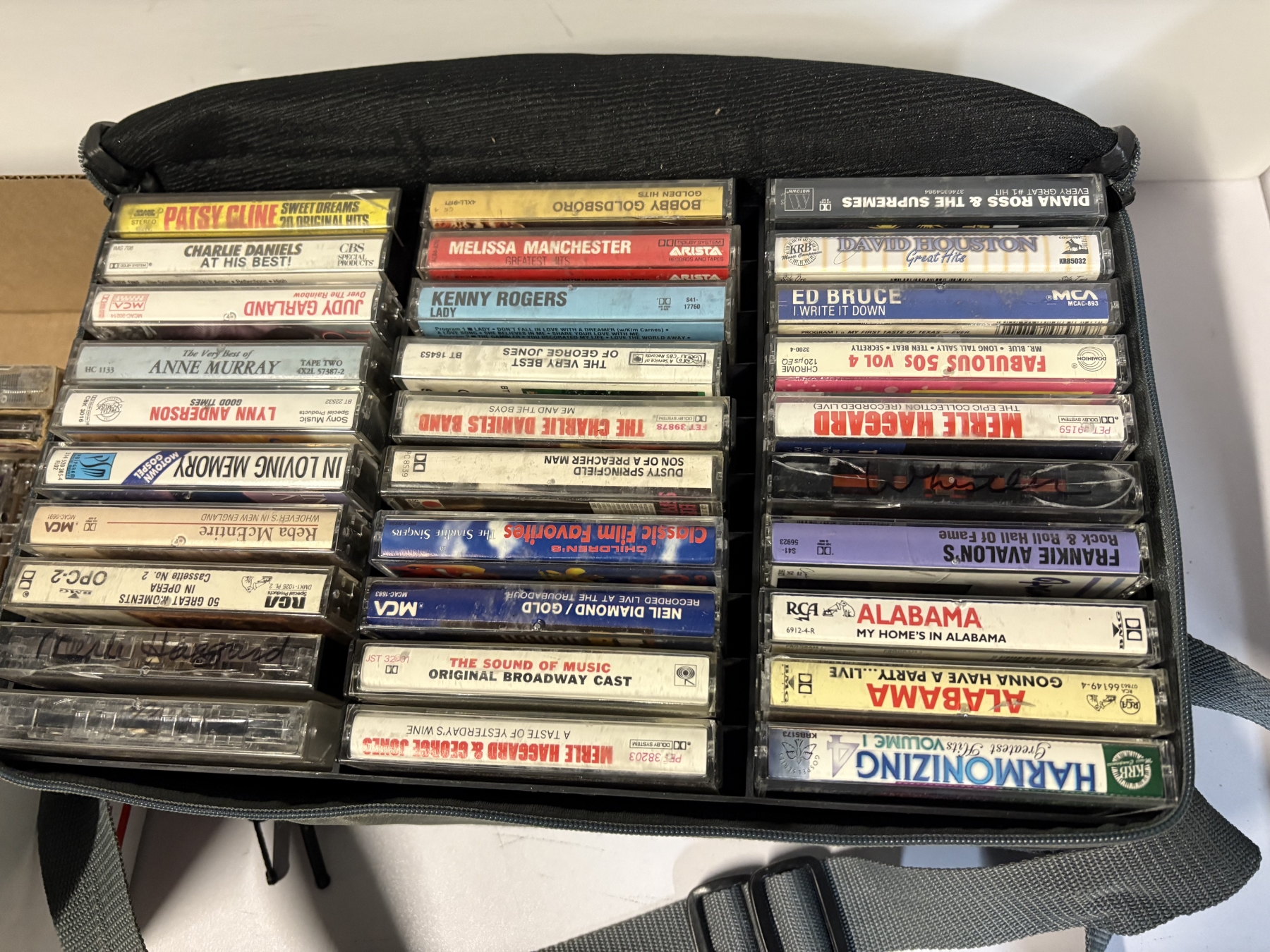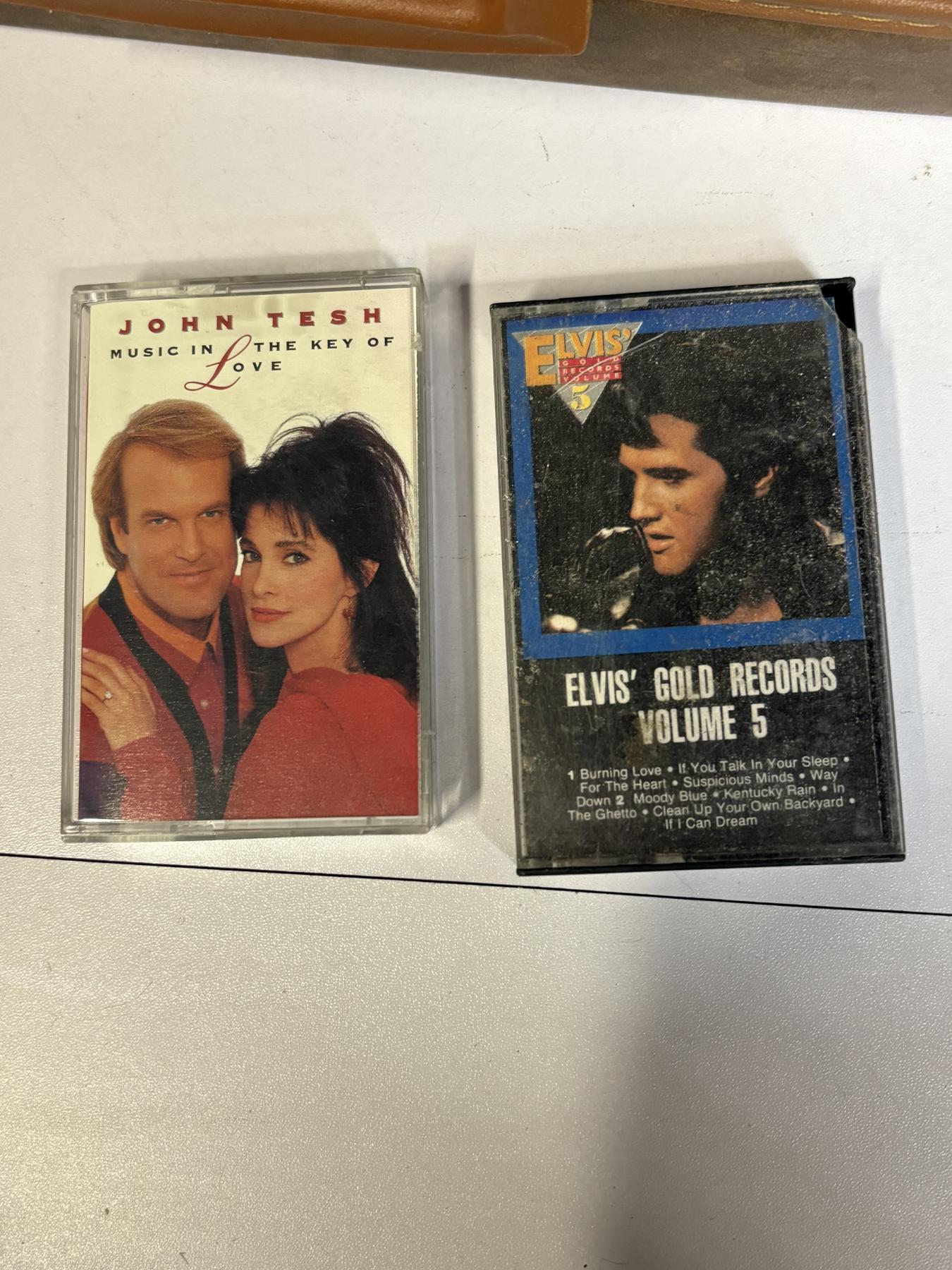 Cassette Player & Case of Cassettes - Emerson Brand - Double Sided Brown Case - Various Cassettes - Jerry Lee Lewis - Johnny Lee - Elvis' Gold Records Vol 5 - Van Halen - George Jones - Last Photo is Cassette Boxes ONLY (7)- No Cassettes inside