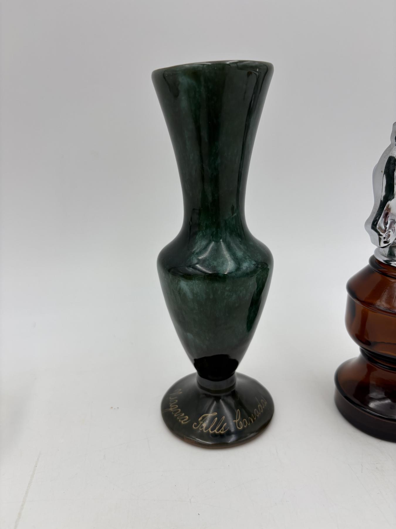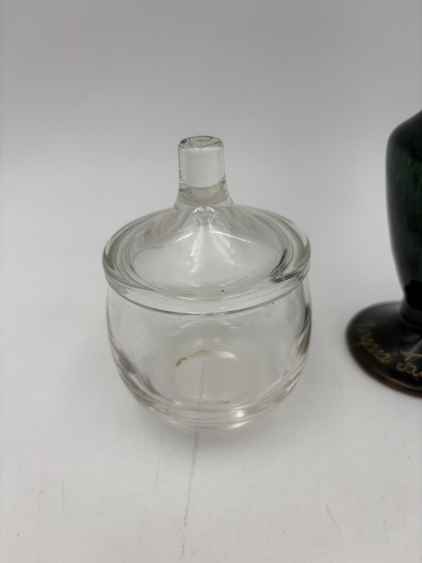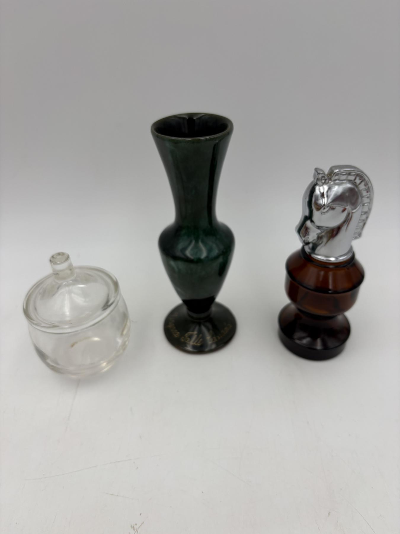 Clear glass jar with lid - Roly poly style 4 inches tall with lid - Niagara Falls Canada Green drip glaze vase 7 inches tall - Avon Chess Piece After Shave Bottle - 6 inches tall - empty bottle