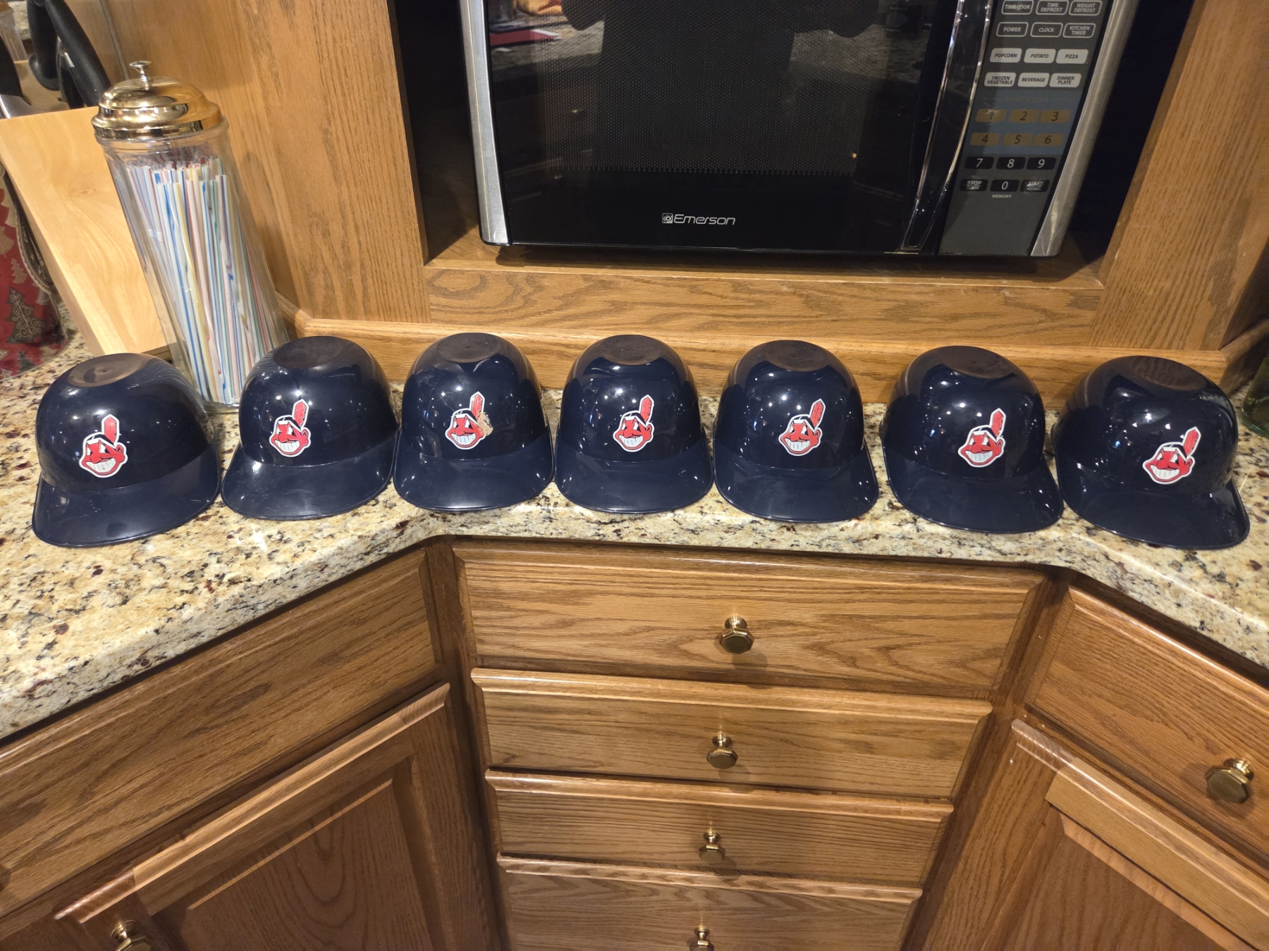 Collectable Jacobs Field Wall Clock & 7 Mini Indians Helmets Great Addition To Your Collection