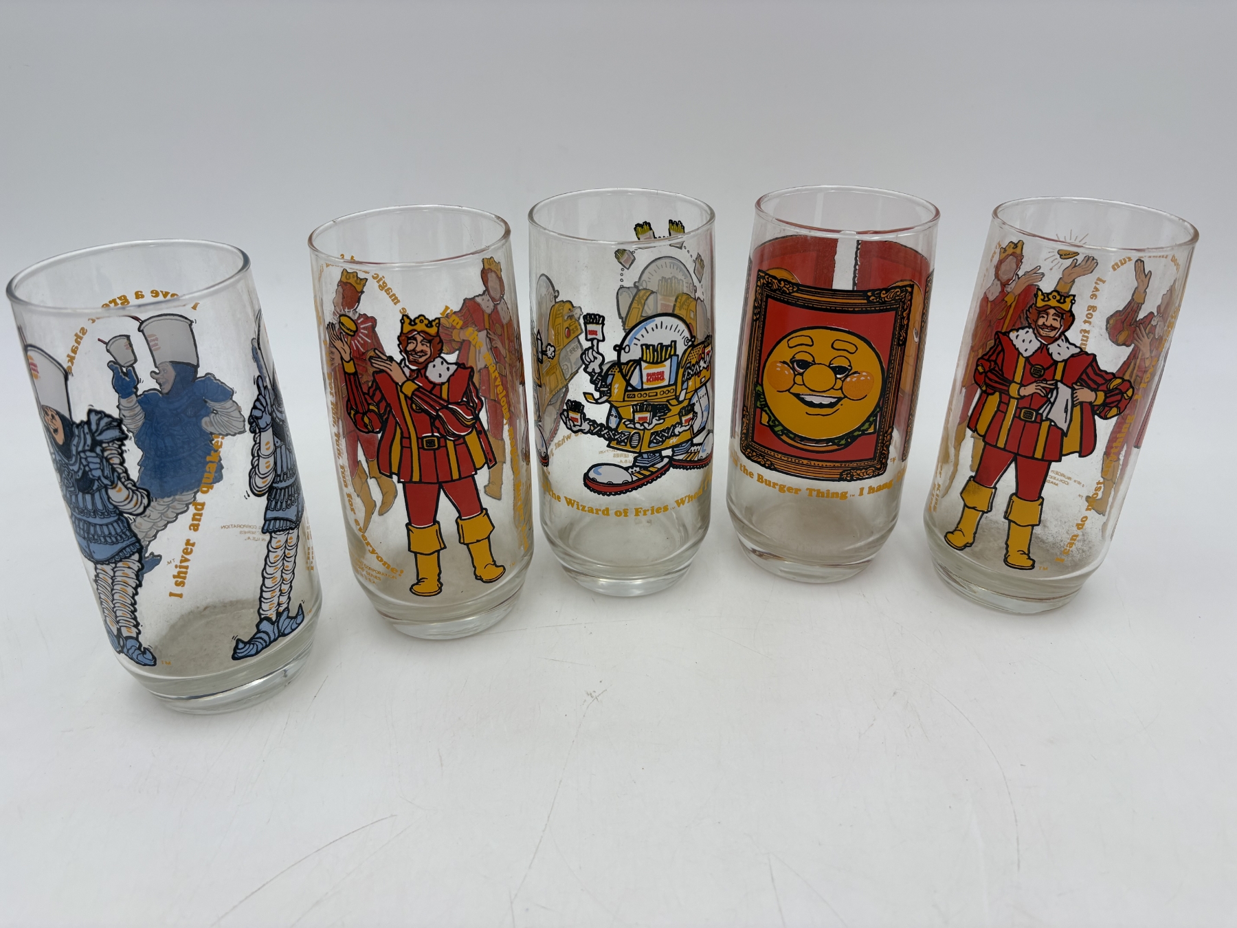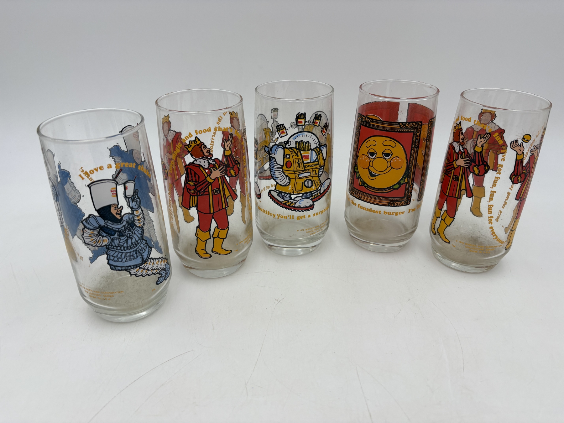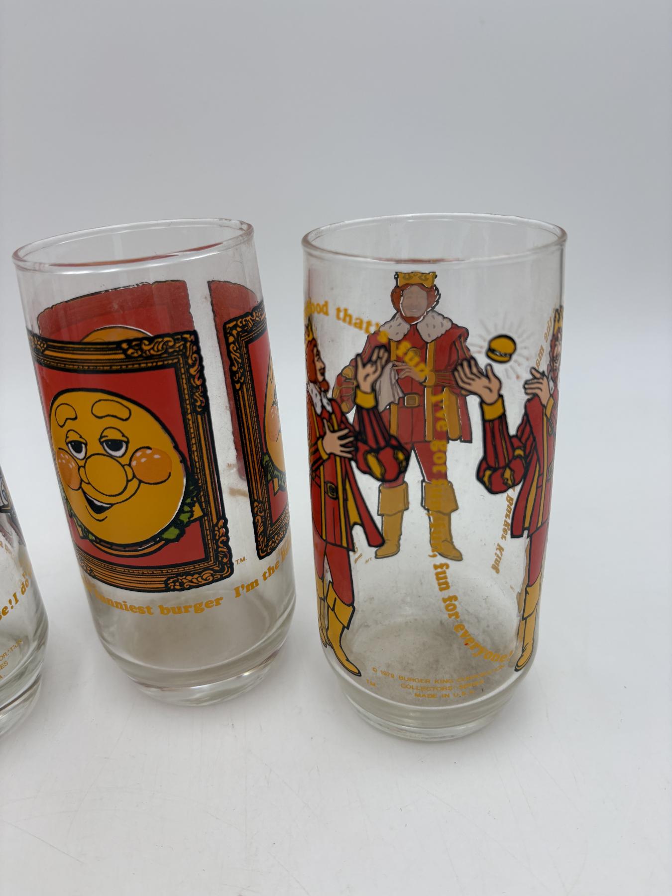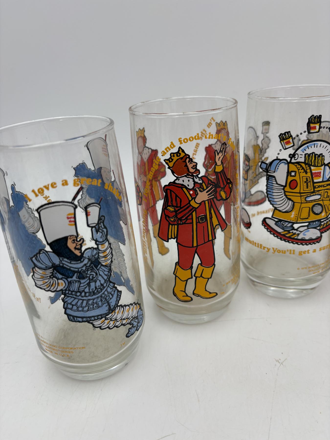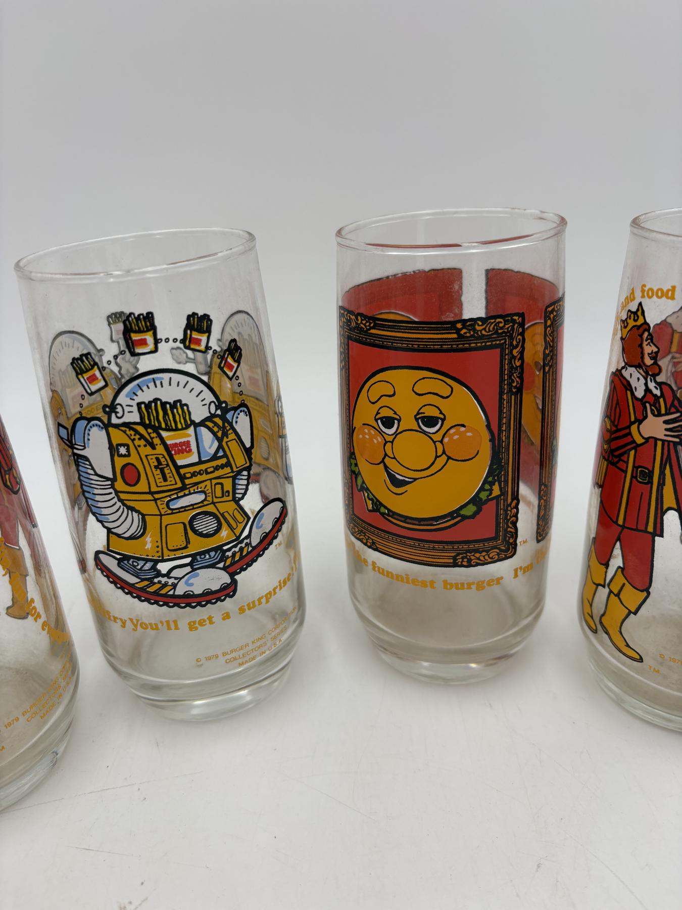 Collectible Burger King Glasses - 5 Total - King - 1979 - Collector's Series - BK Corporation - Burger King - Wizard of Fries - Funniest Burger