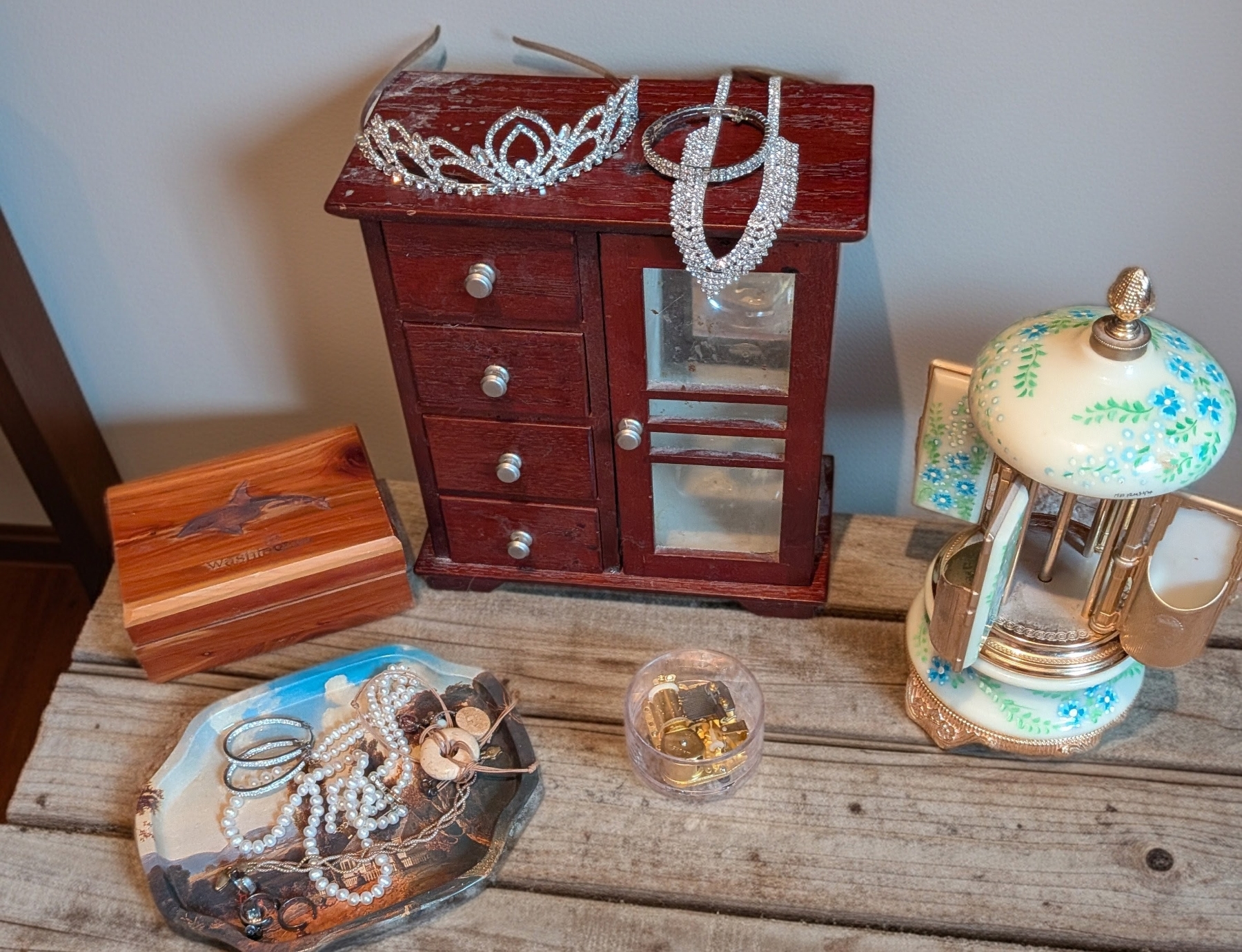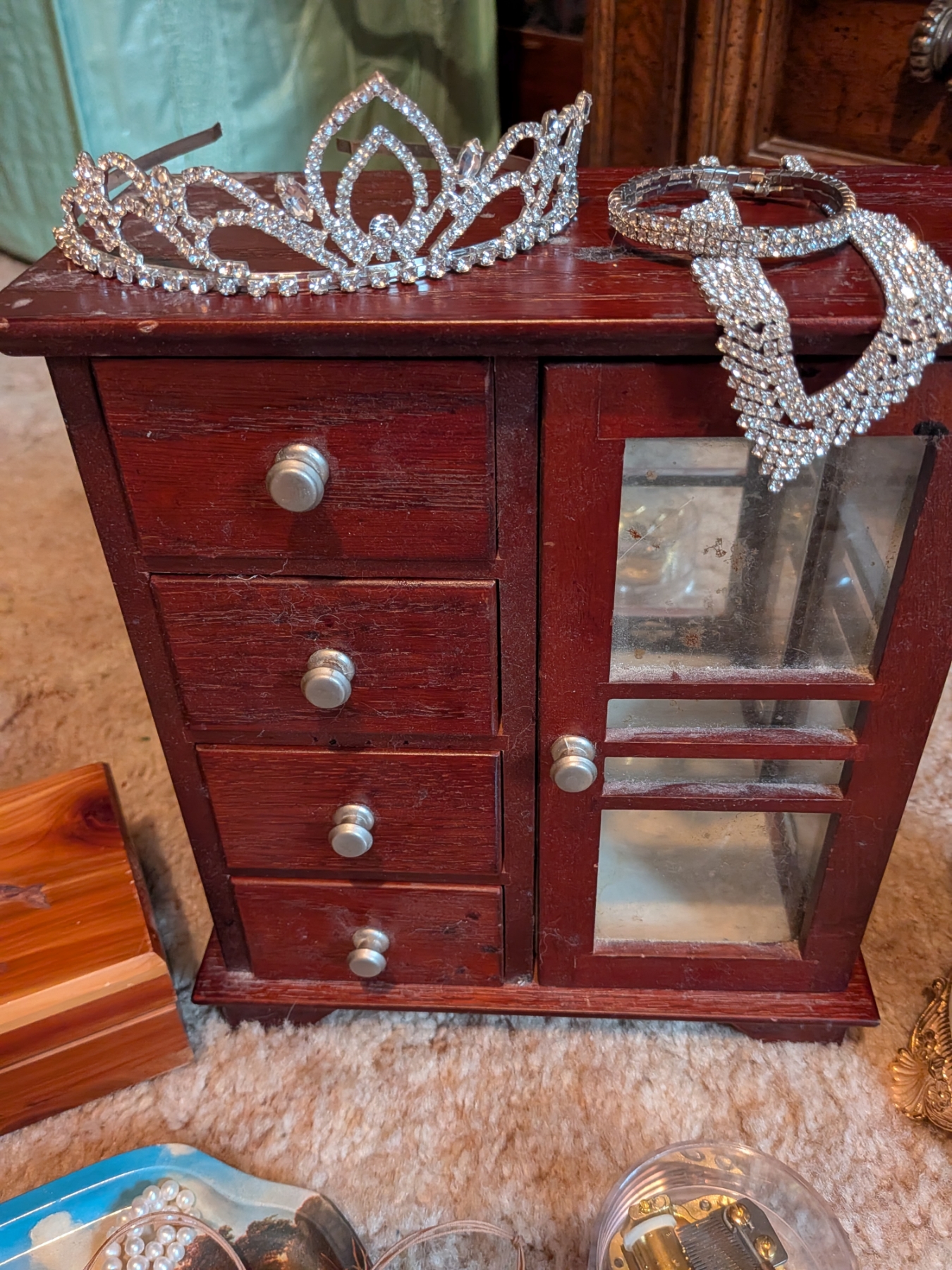 Costume Jewelry With Boxes, Beautiful Lipstick Keeper, Tiara, Bracelet & More
