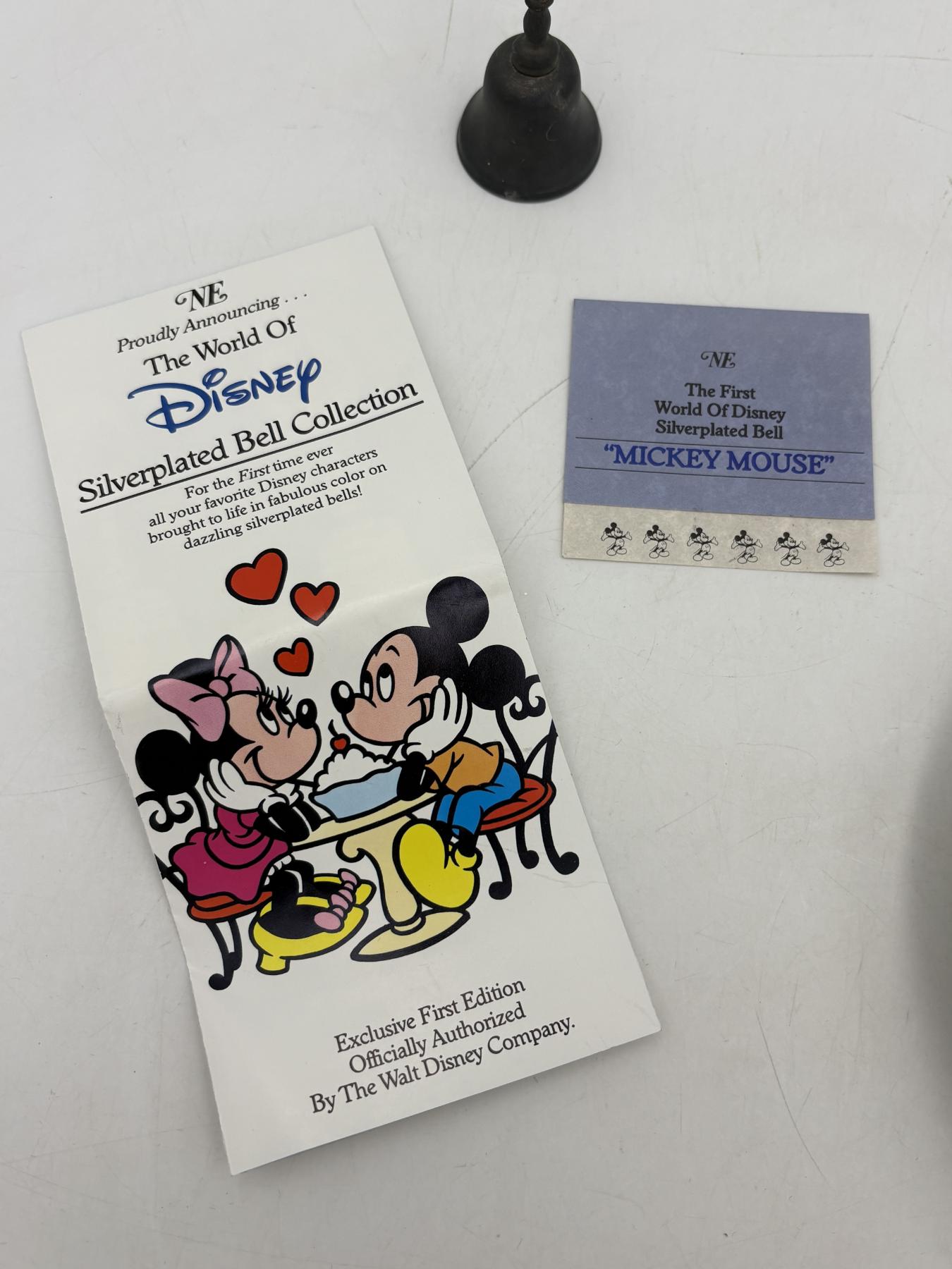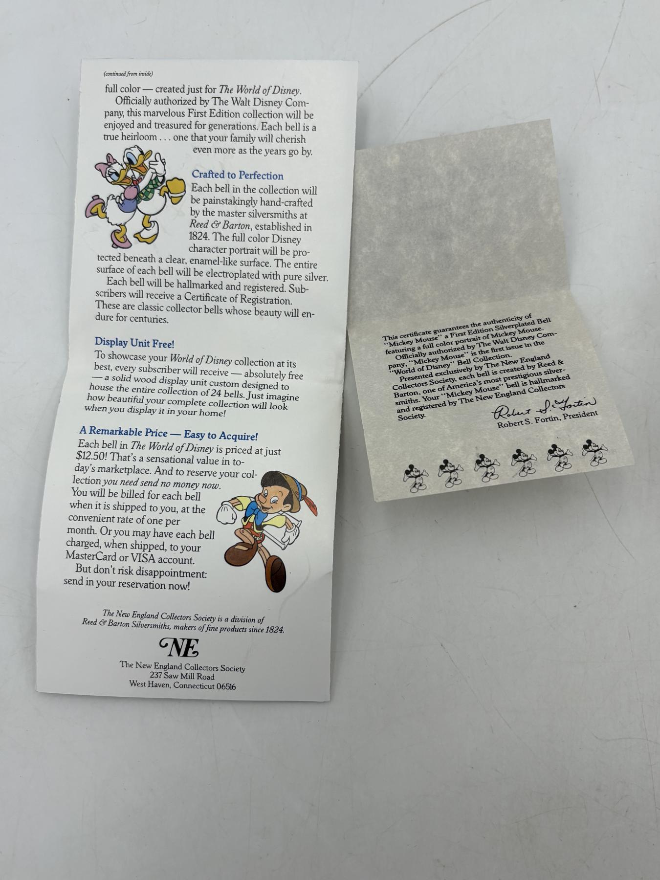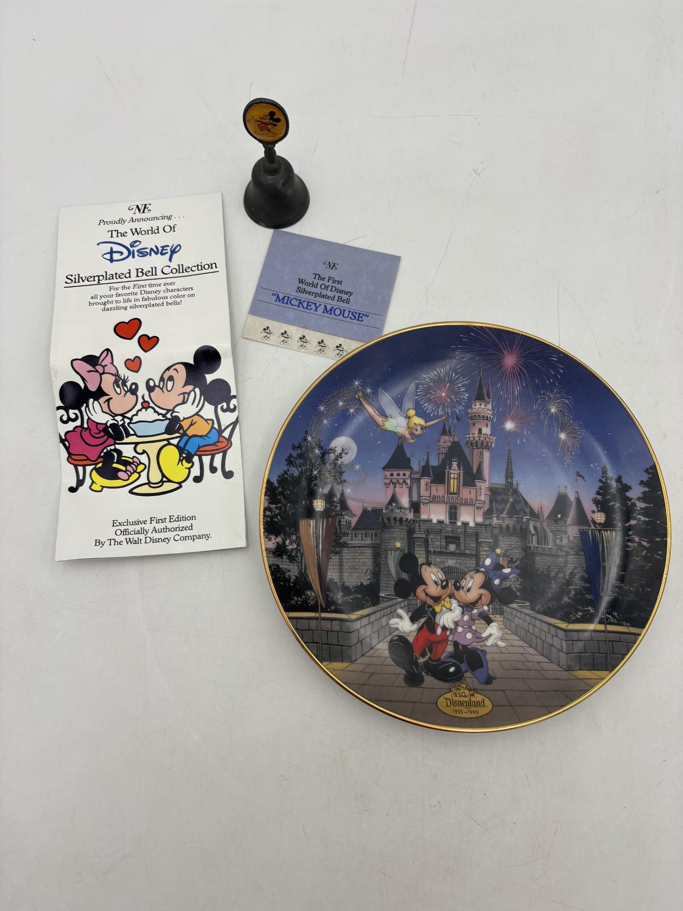 Disney Mickey Mouse Silverplated Bell with Certificate of Authenticity & Mickey Mouse Collectible Plate - Silverplated Bell Collection Paper Authorized by Walt Disney Co. - NE - The first world of Disney Silverplated Bell ~3 inches - Disneyland Plate 1955-1995 Mickey & Minnie Mouse at Sleeping Beauty's Castle - Disney's 40th Anniversary
