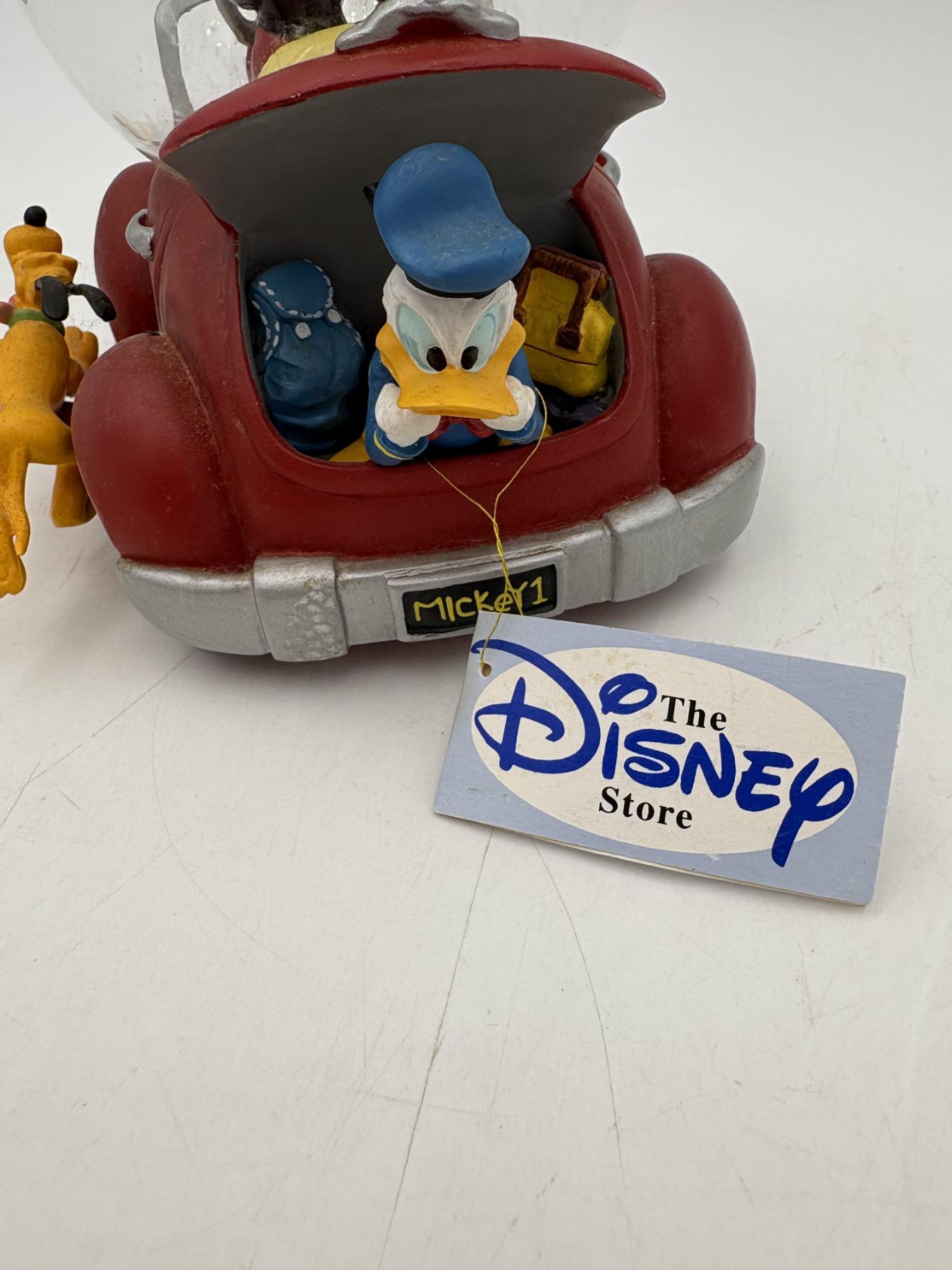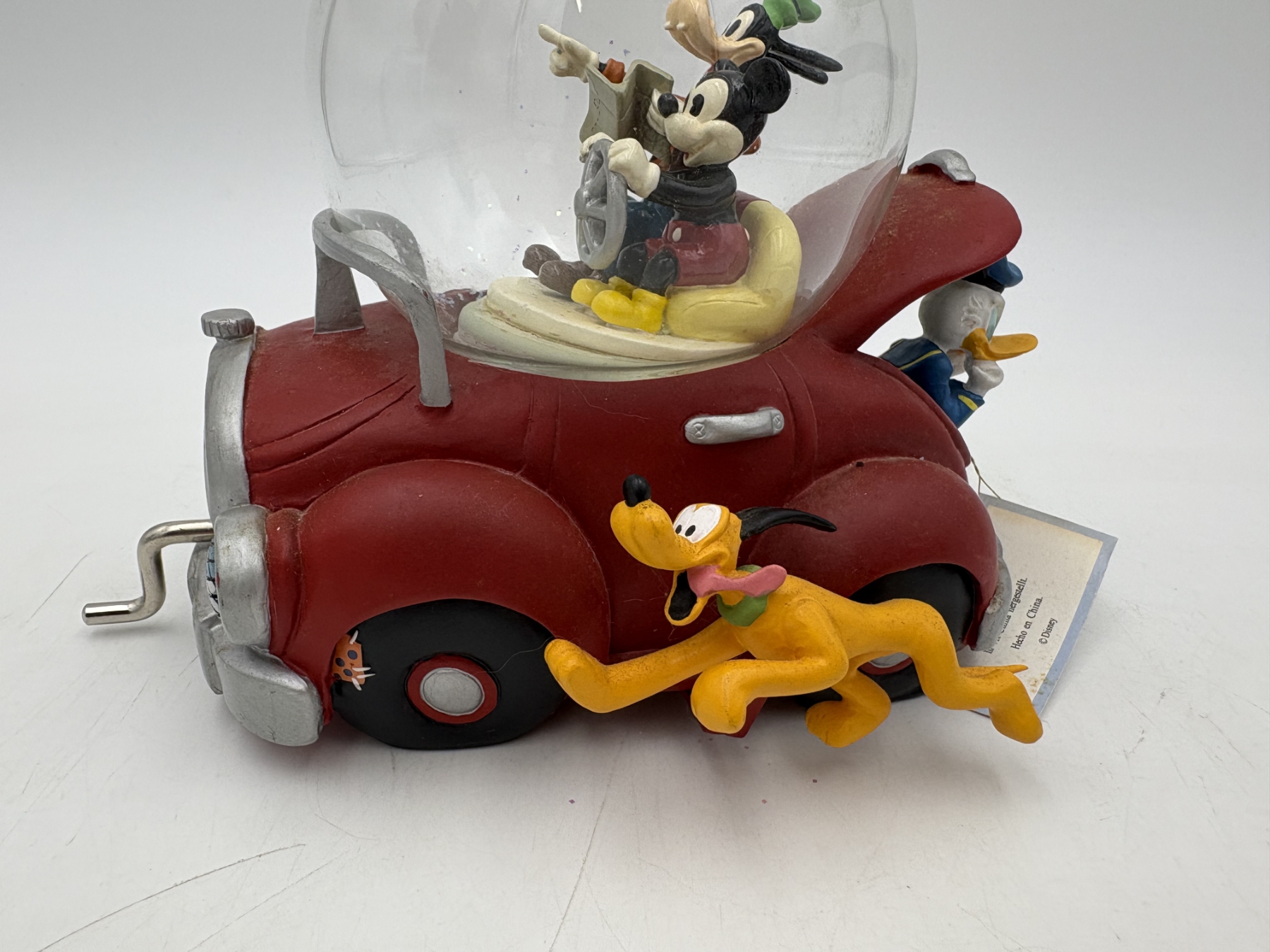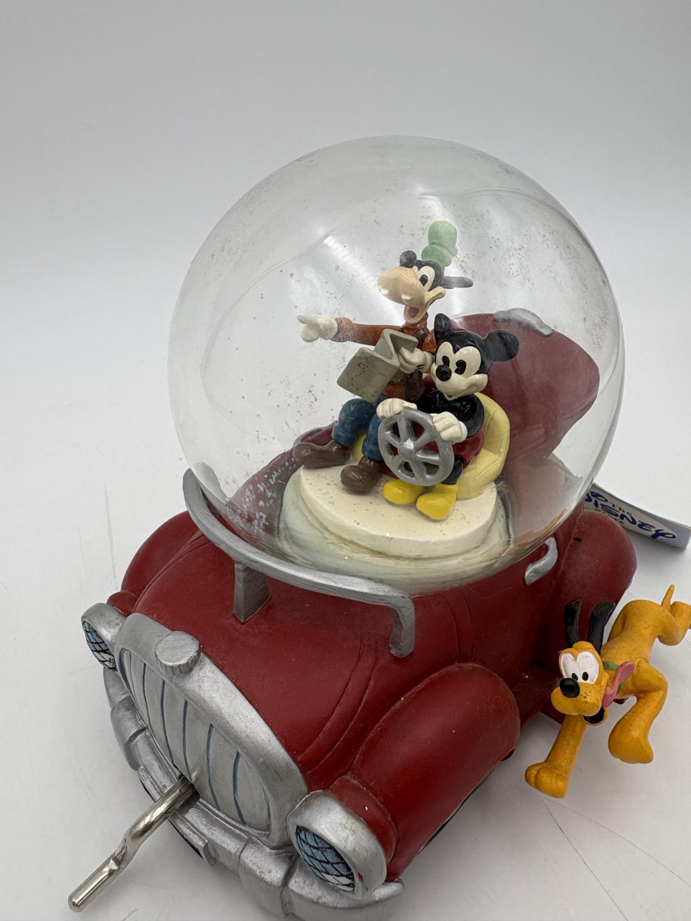 Disney "Zip-A-Dee-Doo-Dah" Musical snow globe ft. Mickey Mouse & Goofy driving a red car - Pluto crank lever on side - Donald Duck in trunk - 7.25 inches tall & 4.5" D - The Disney Store