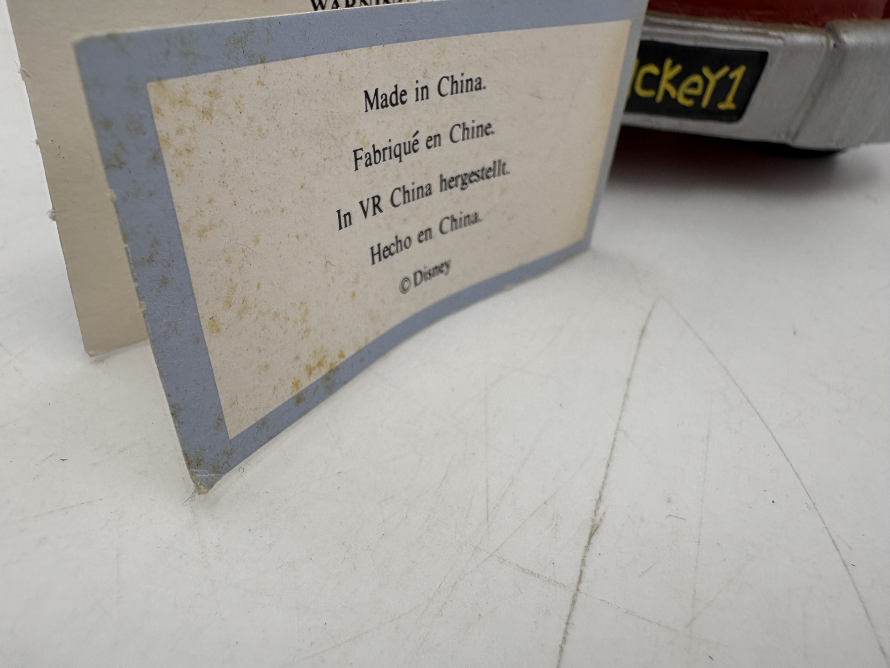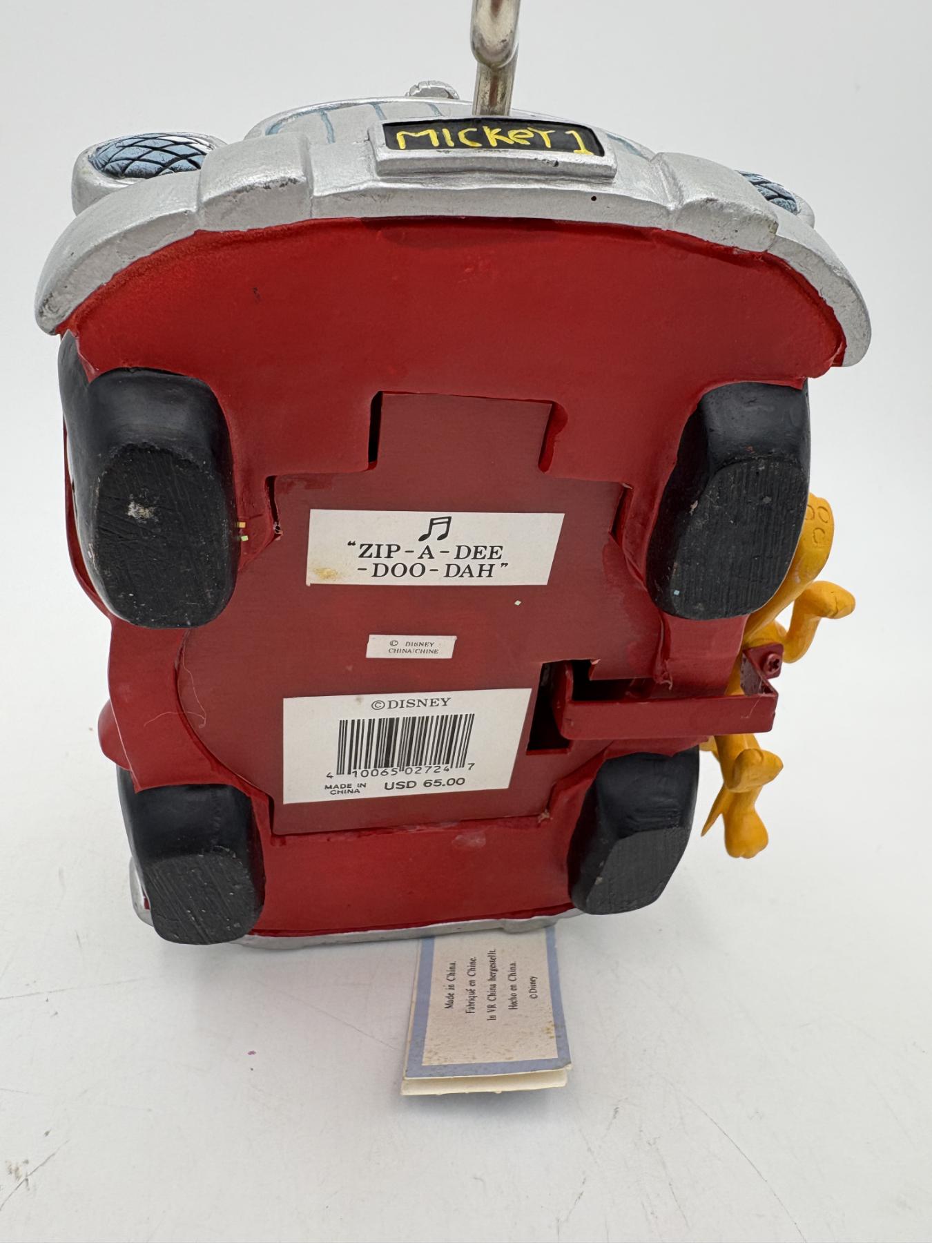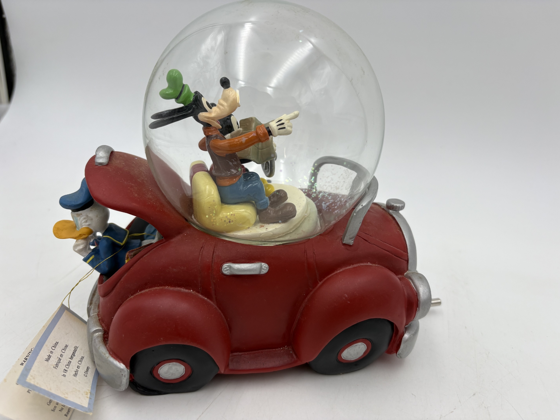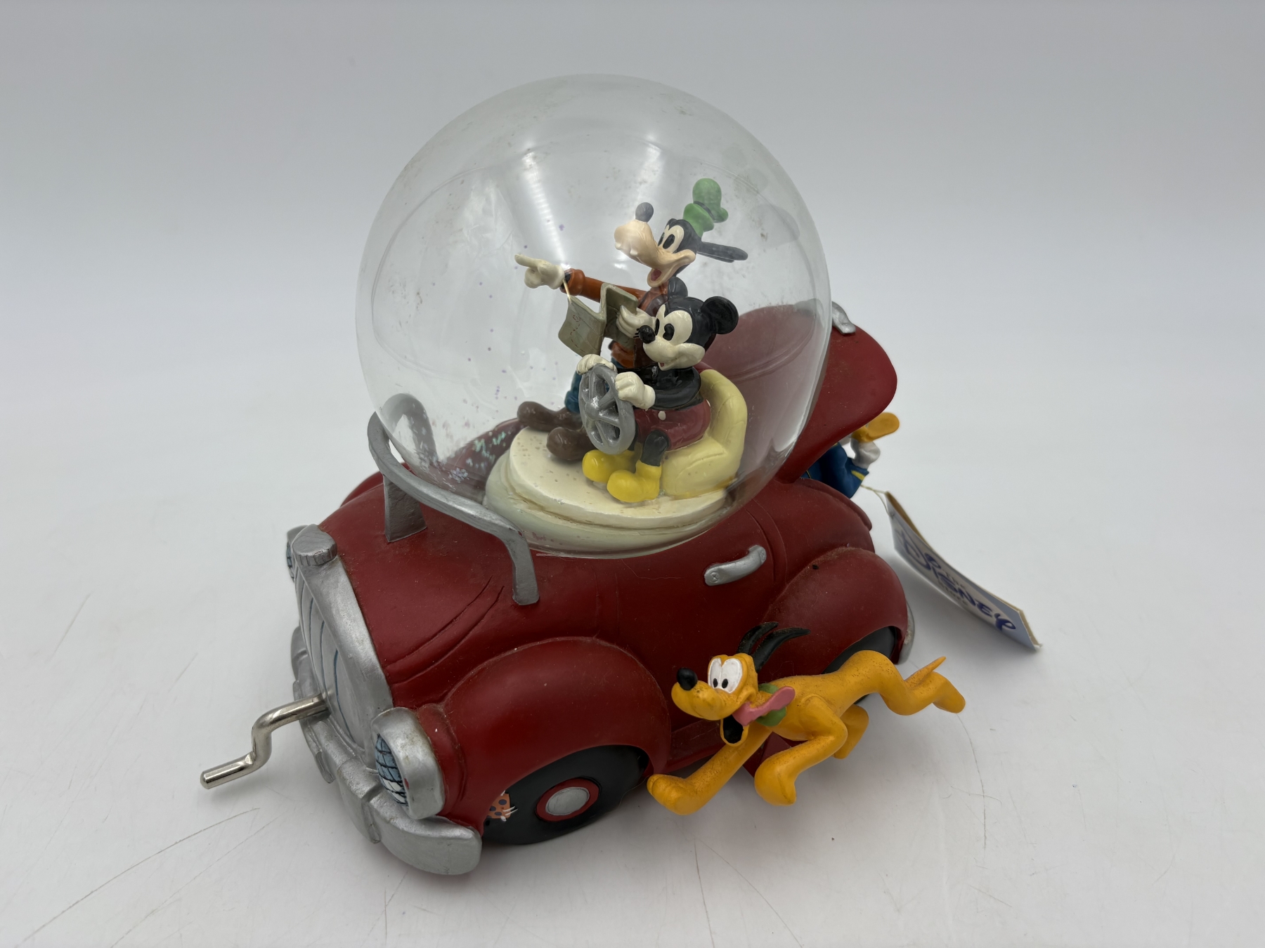 Disney "Zip-A-Dee-Doo-Dah" Musical snow globe ft. Mickey Mouse & Goofy driving a red car - Pluto crank lever on side - Donald Duck in trunk - 7.25 inches tall & 4.5" D - The Disney Store