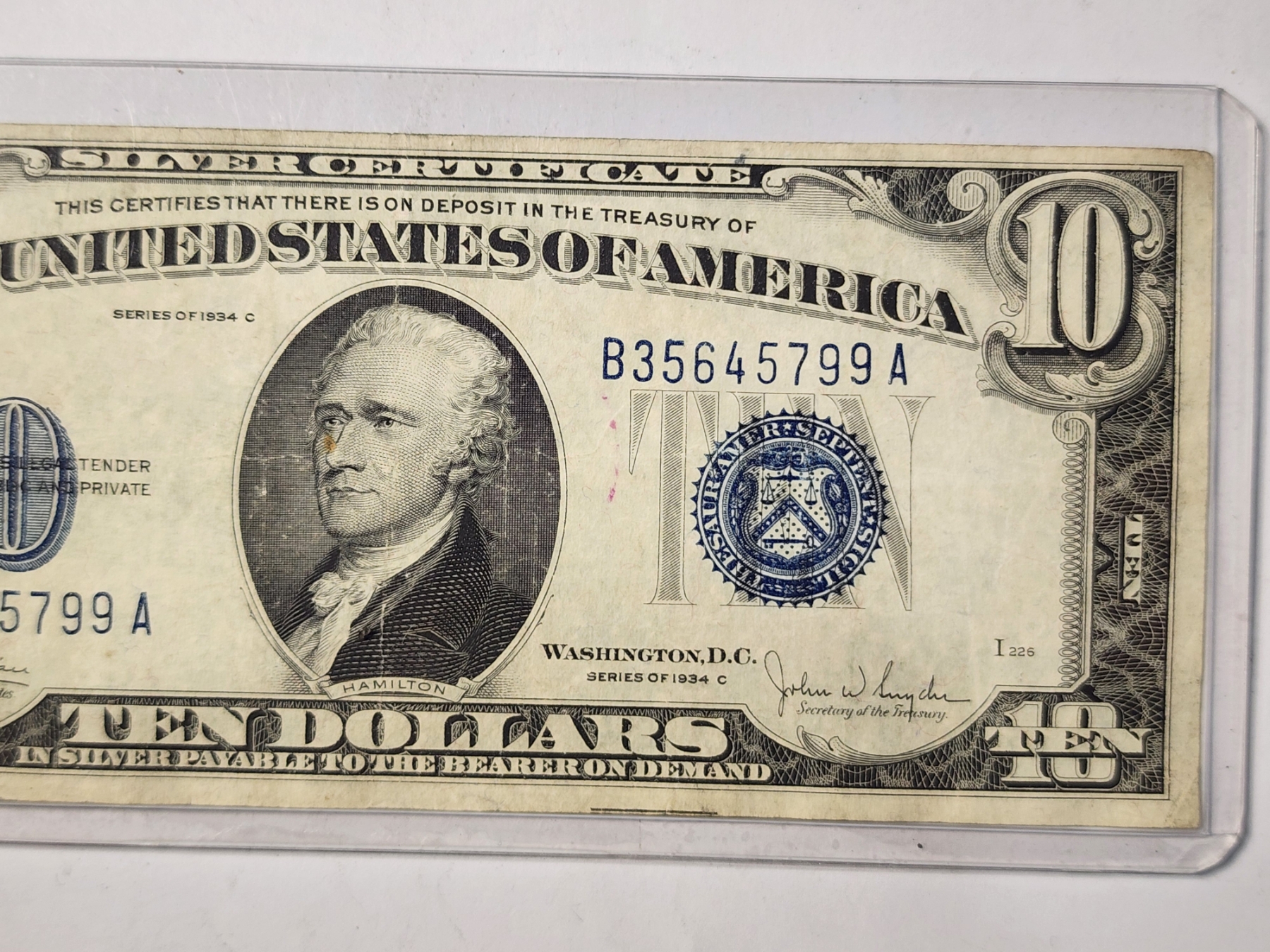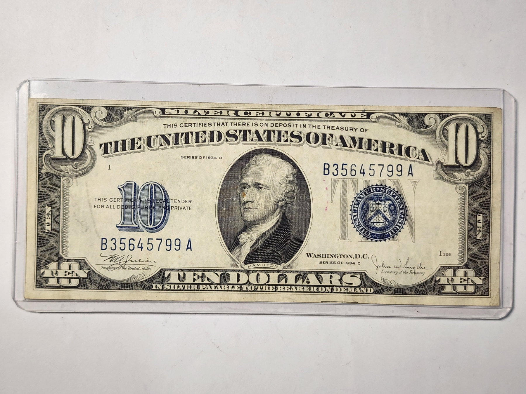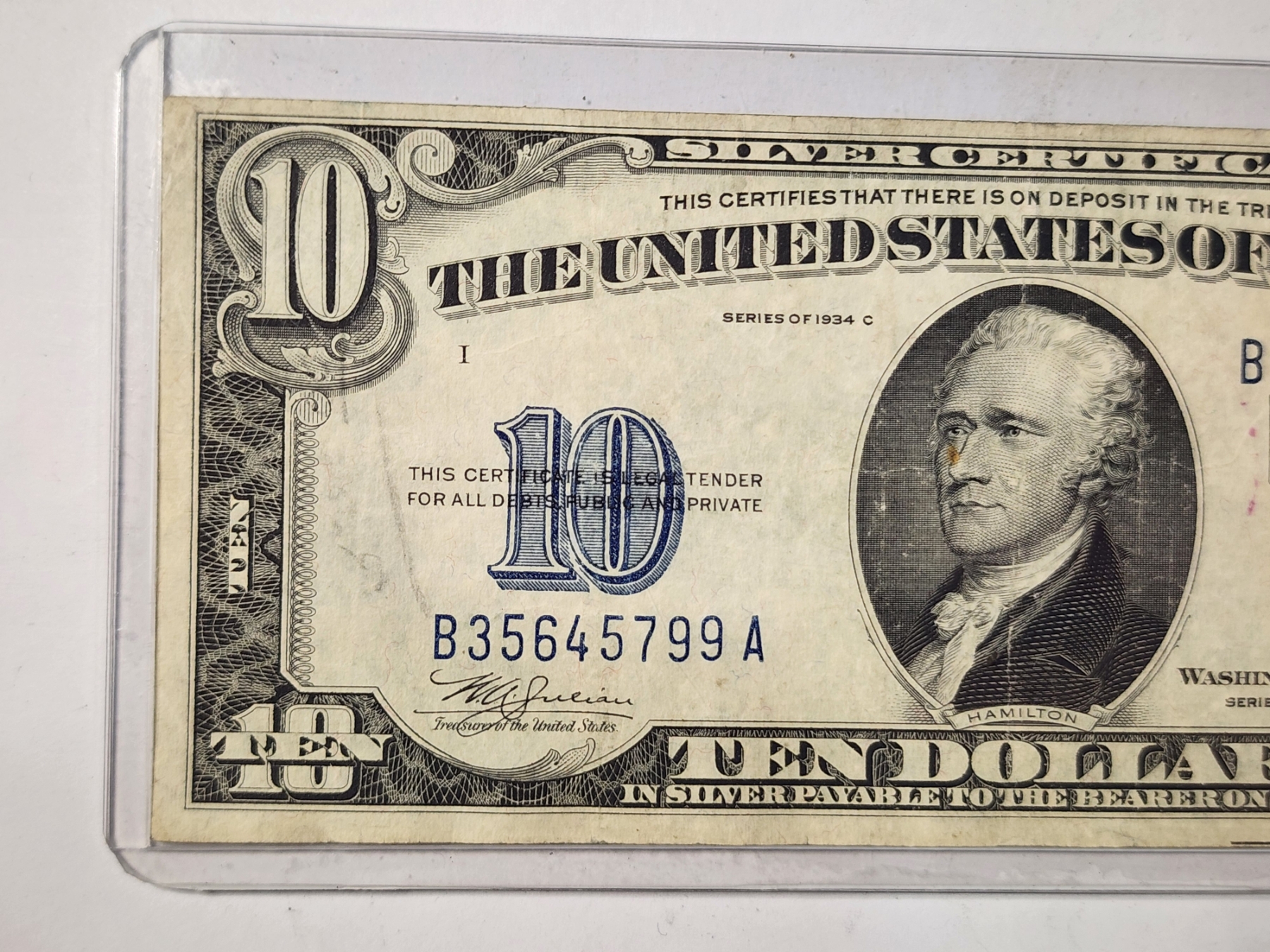 EXCELLENT 1934C $10 Blue Seal Silver Certificate ~ GREAT NOTE FOR ANY COLLECTOR!