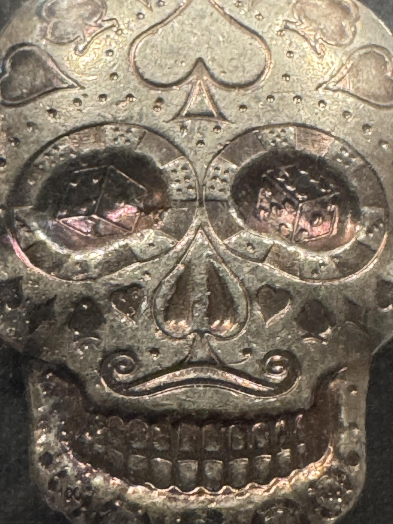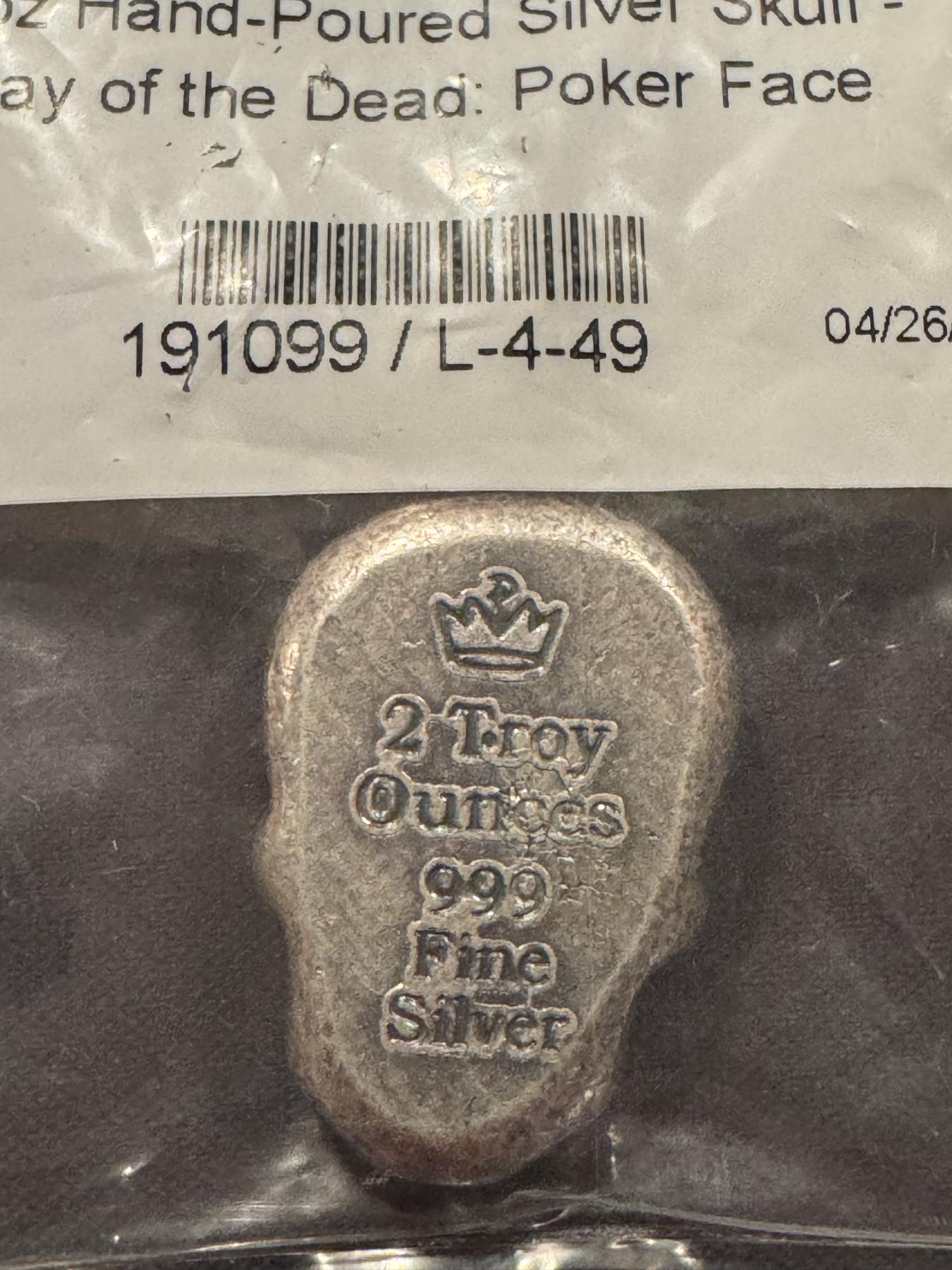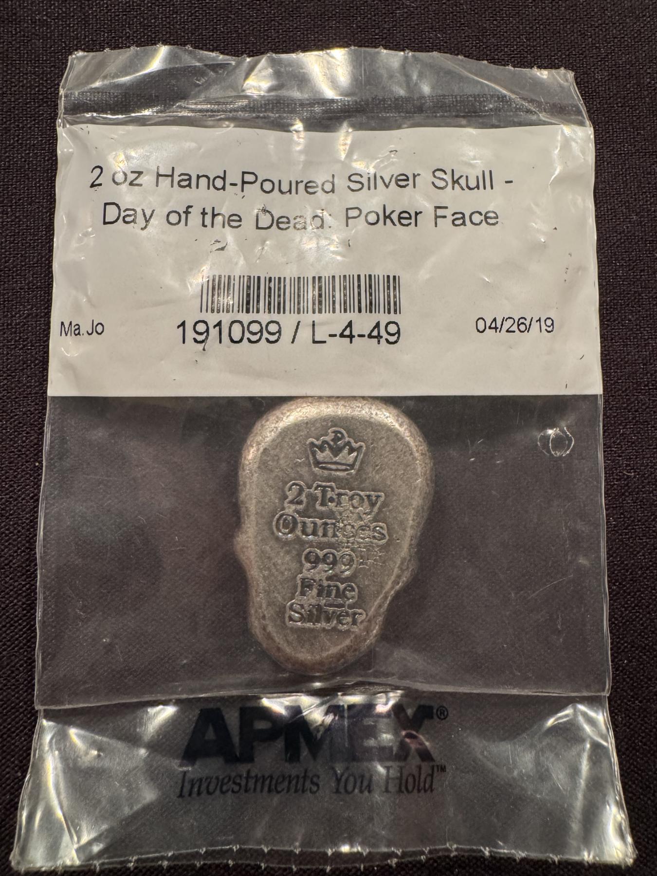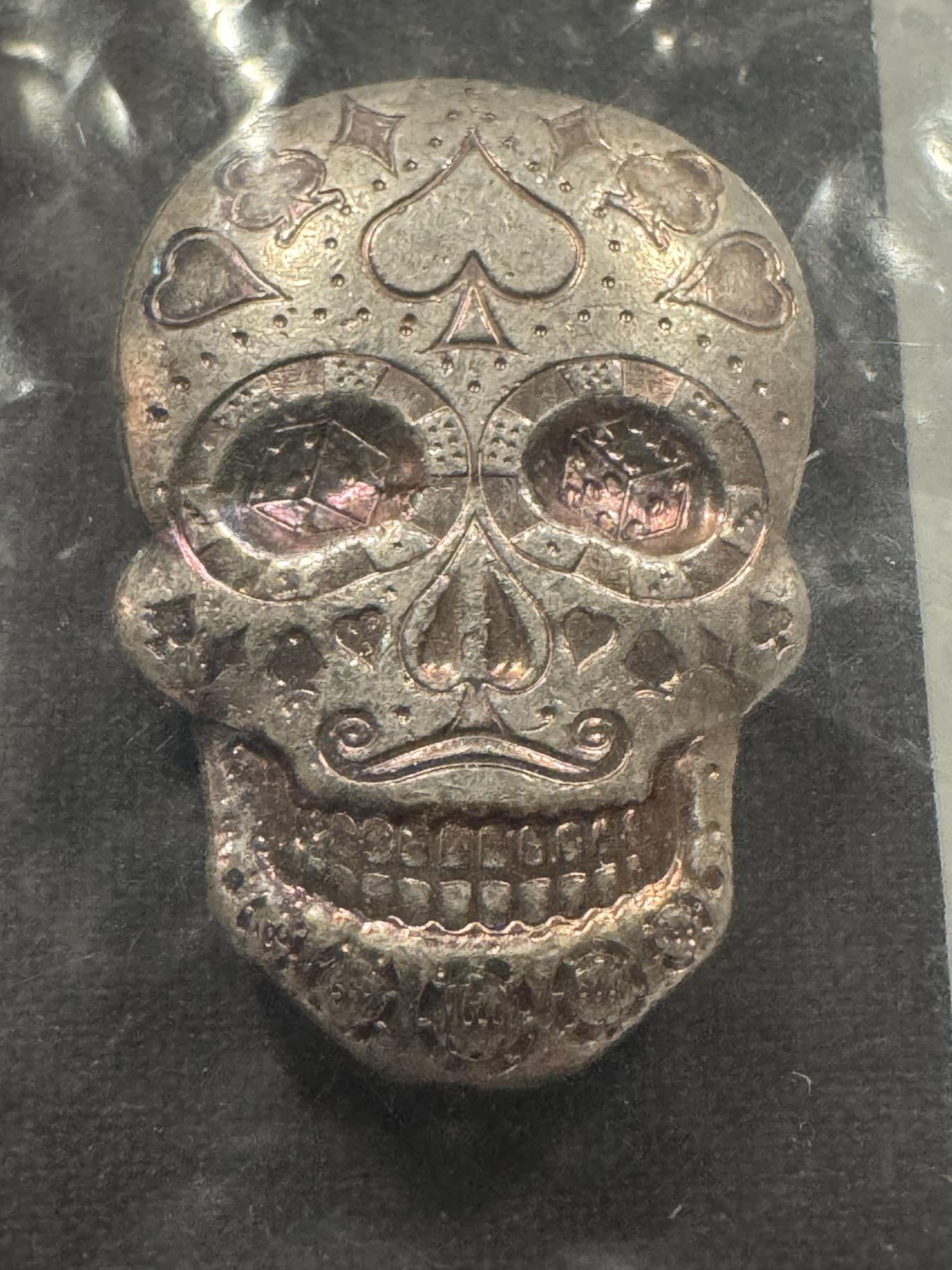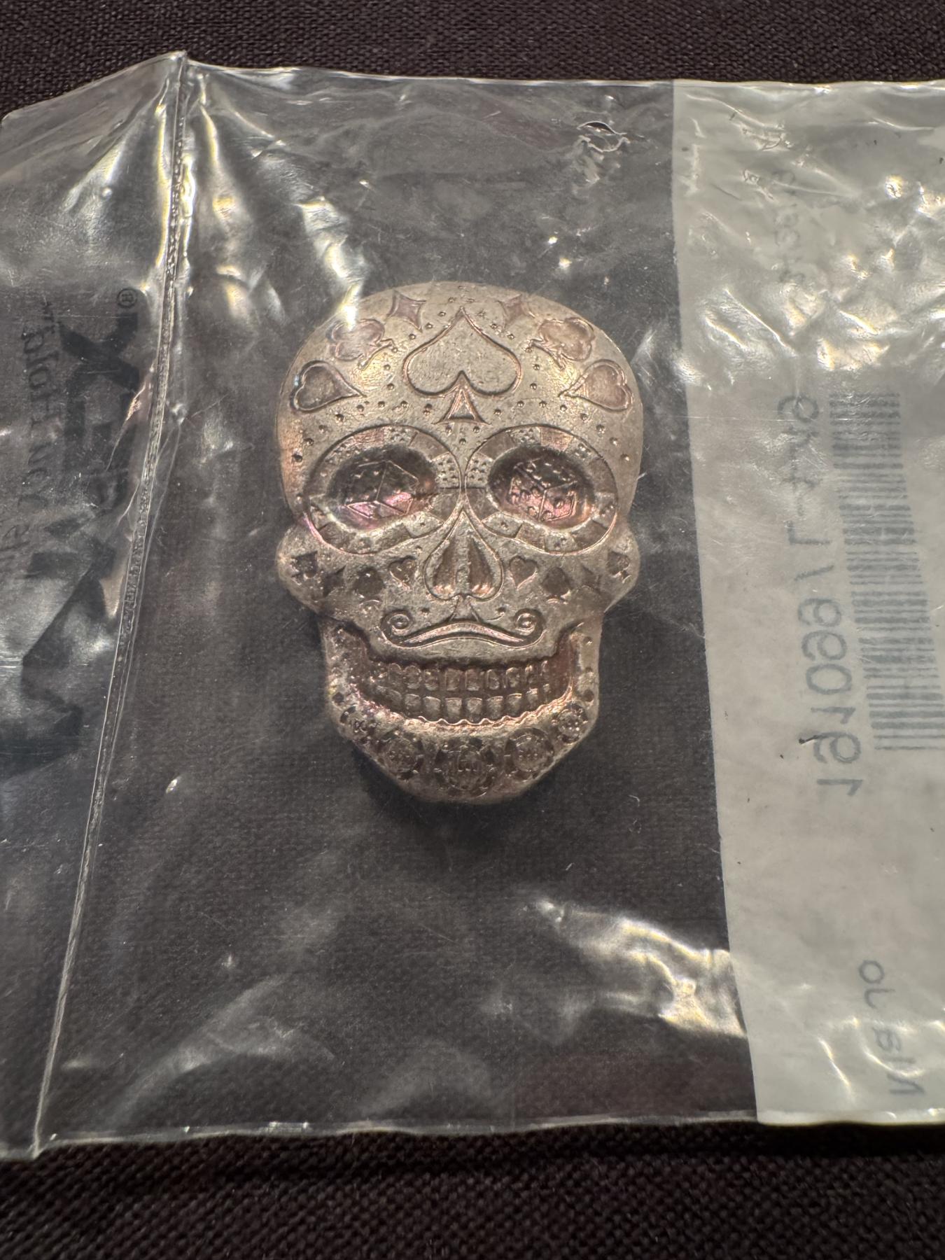 Exceptional Day of The Dead 2 Troy Oz .999 Fine Silver Hand Poured Skull - Mint Condition