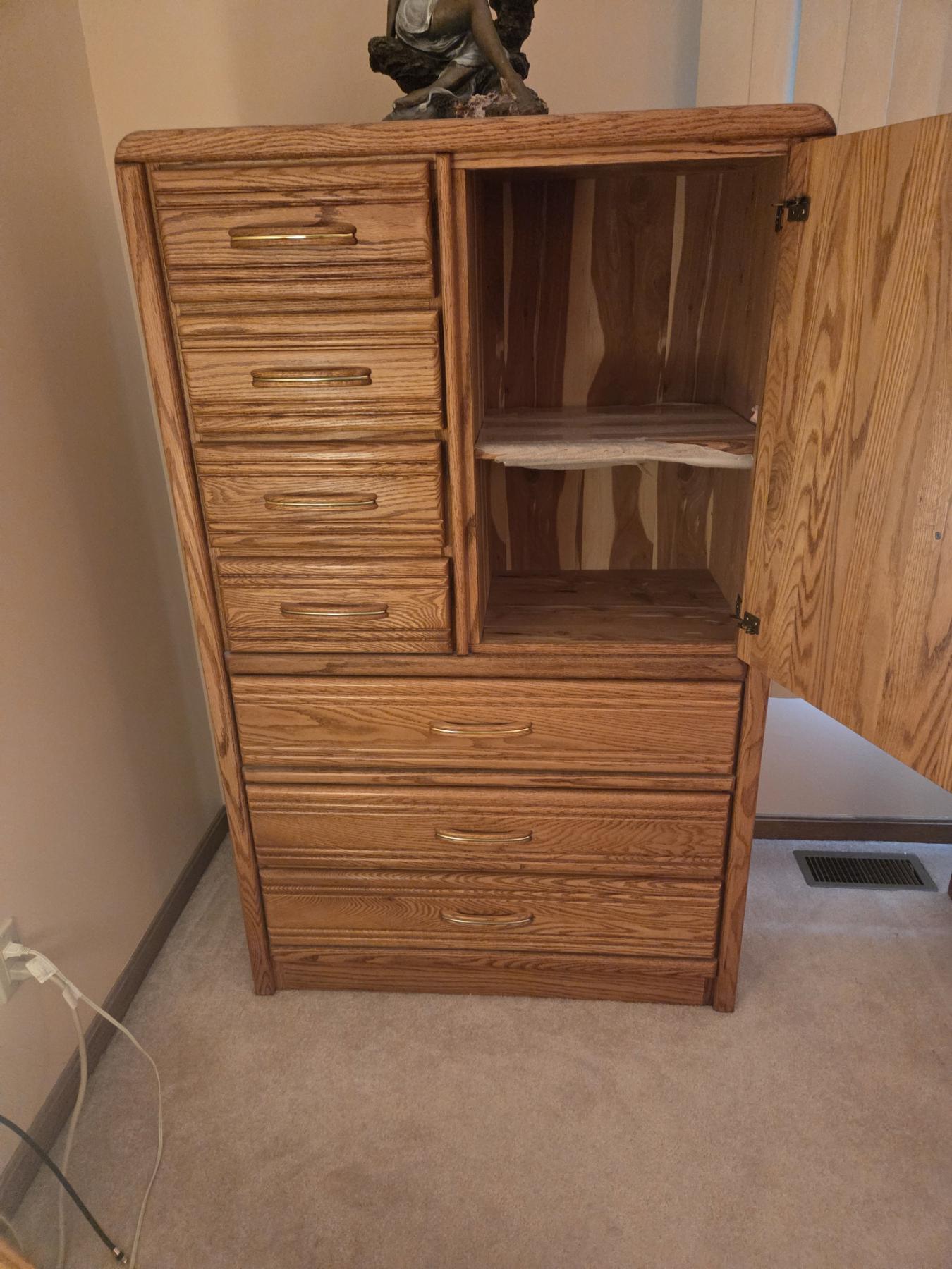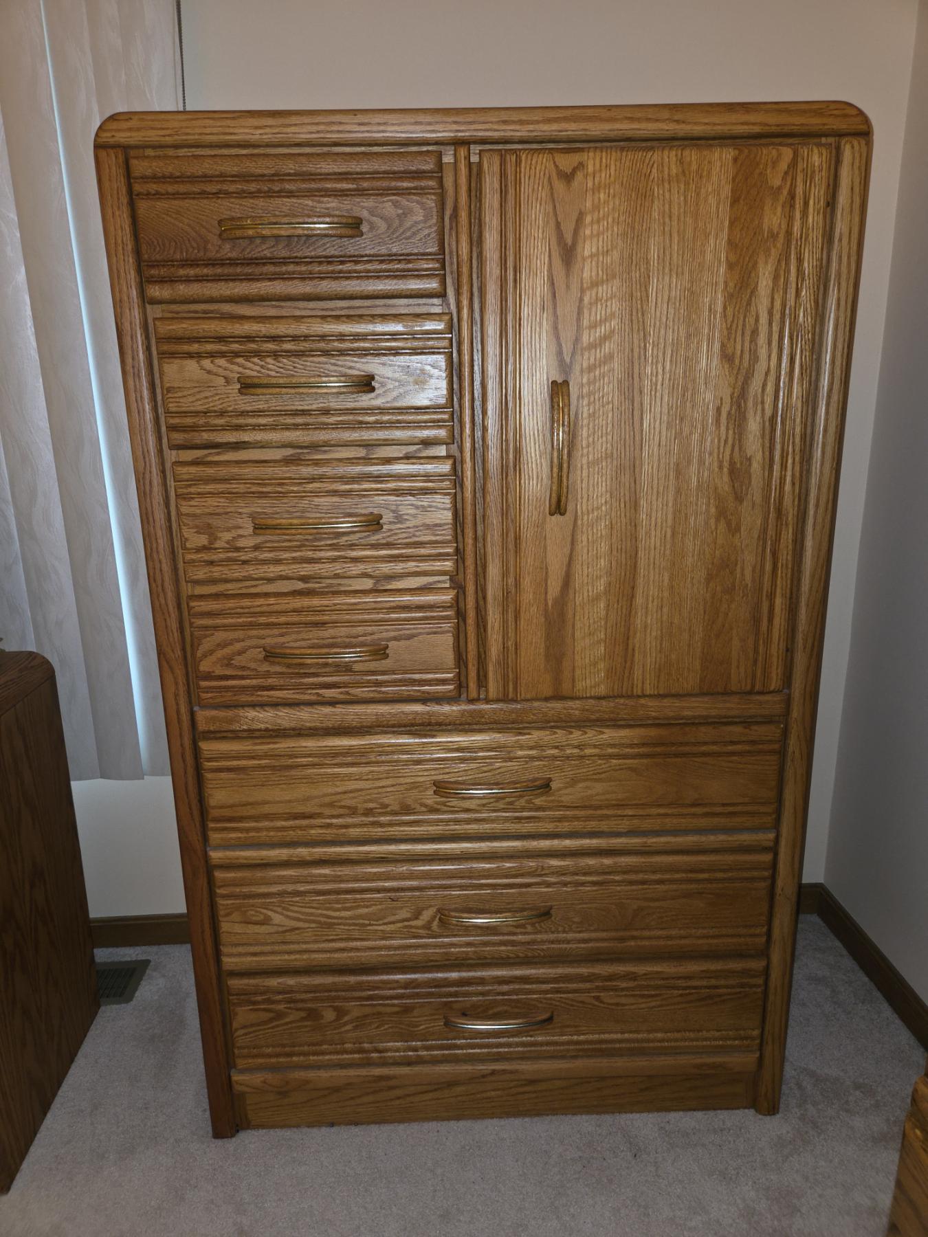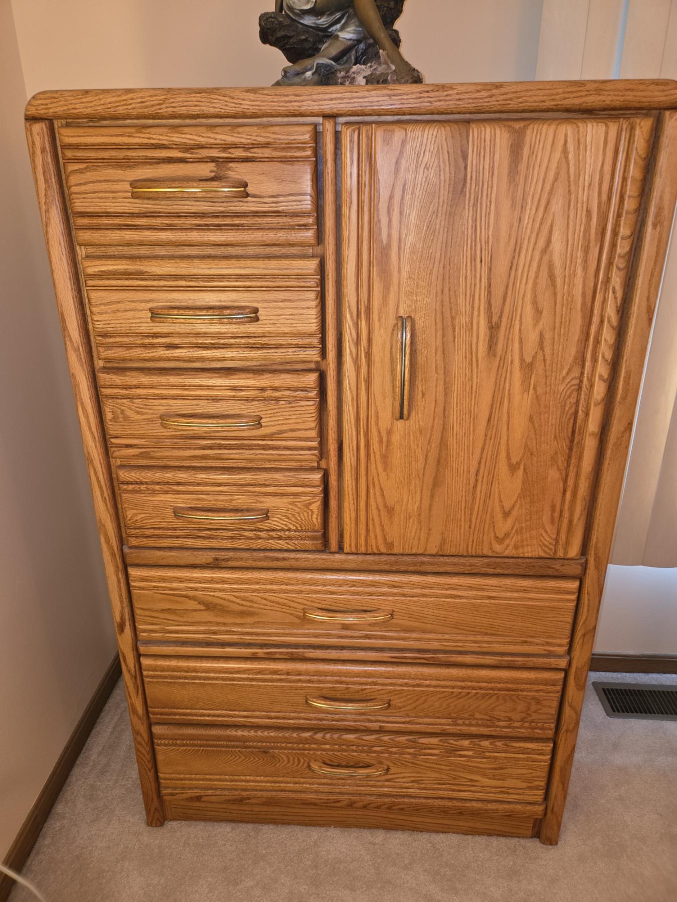 Oak Dresser Group. Long 30"x60", 2 Cupboard Dressers 94"x38", jewelry Dresser 68"x22", 5 Drawer 34"x39"