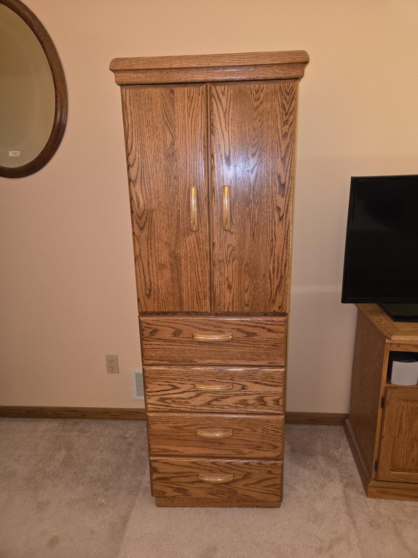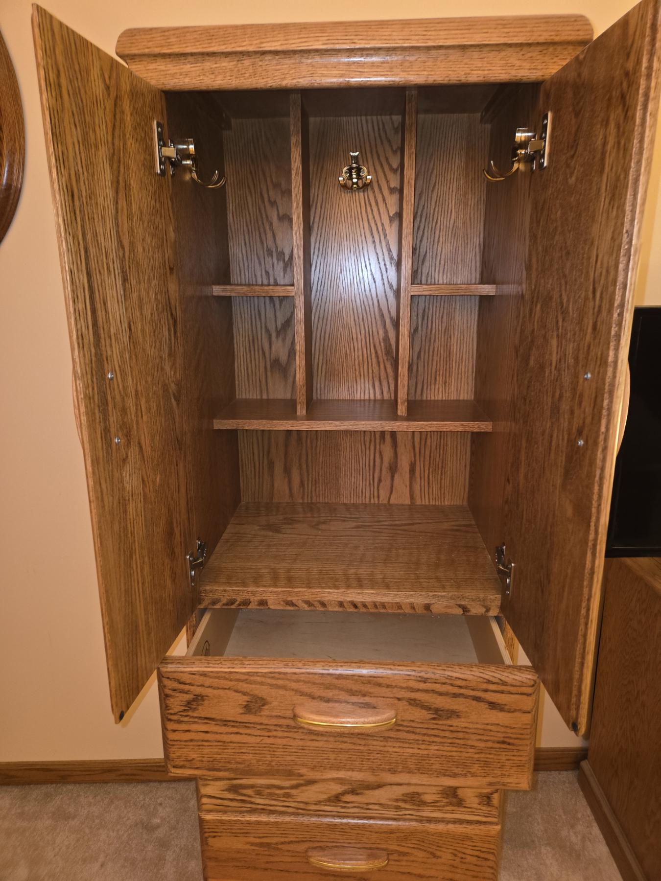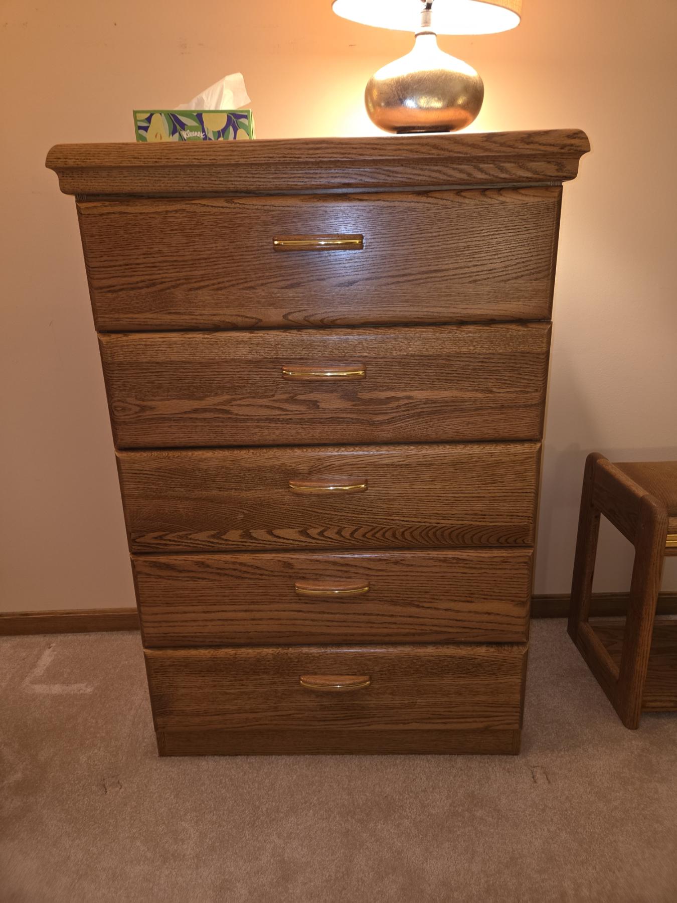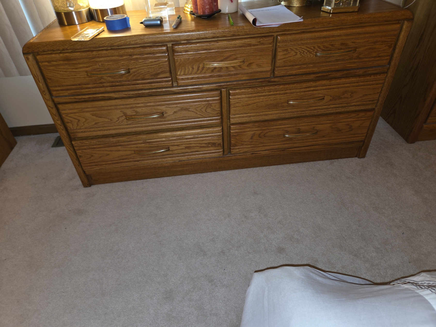 Oak Dresser Group. Long 30"x60", 2 Cupboard Dressers 94"x38", jewelry Dresser 68"x22", 5 Drawer 34"x39"
