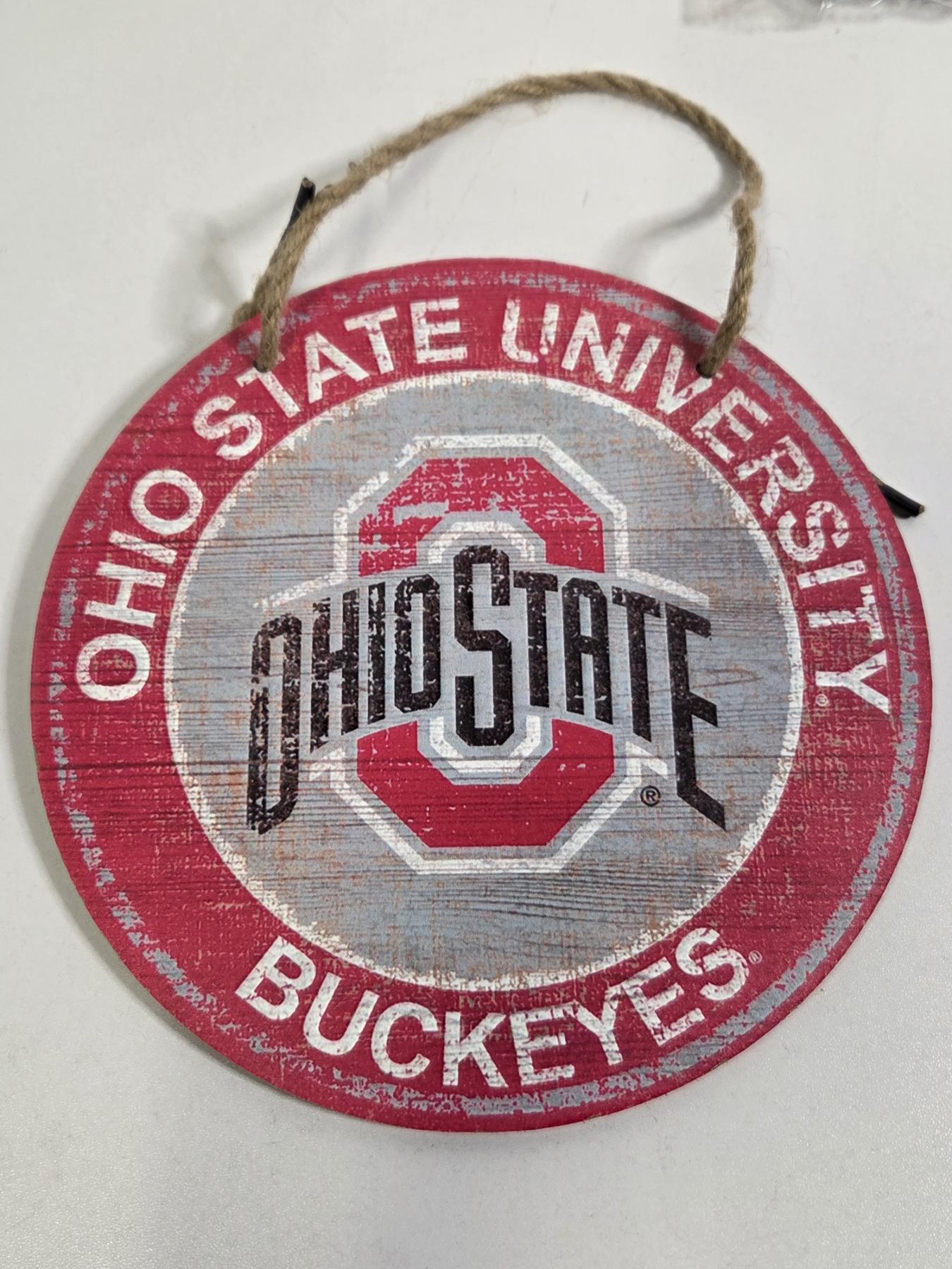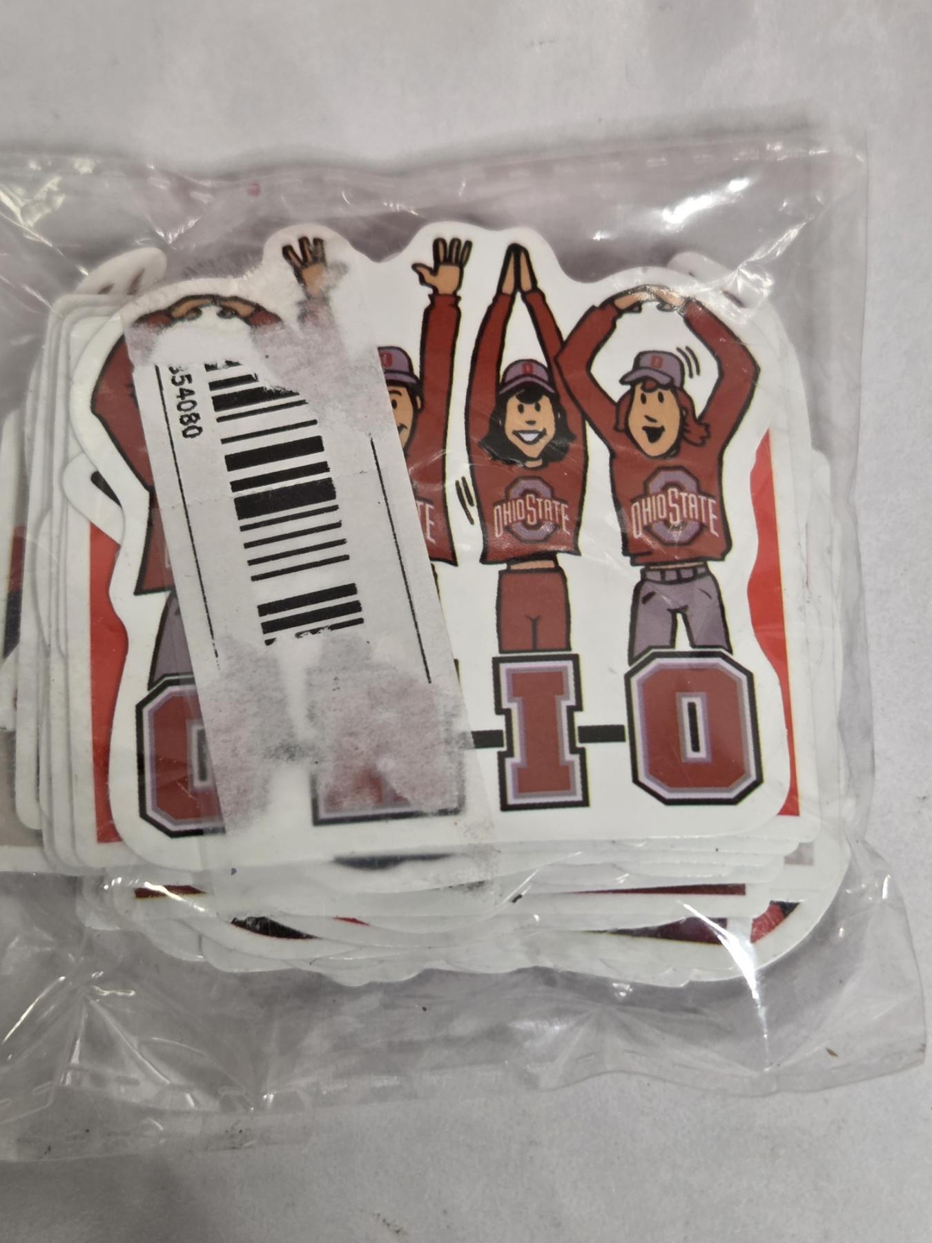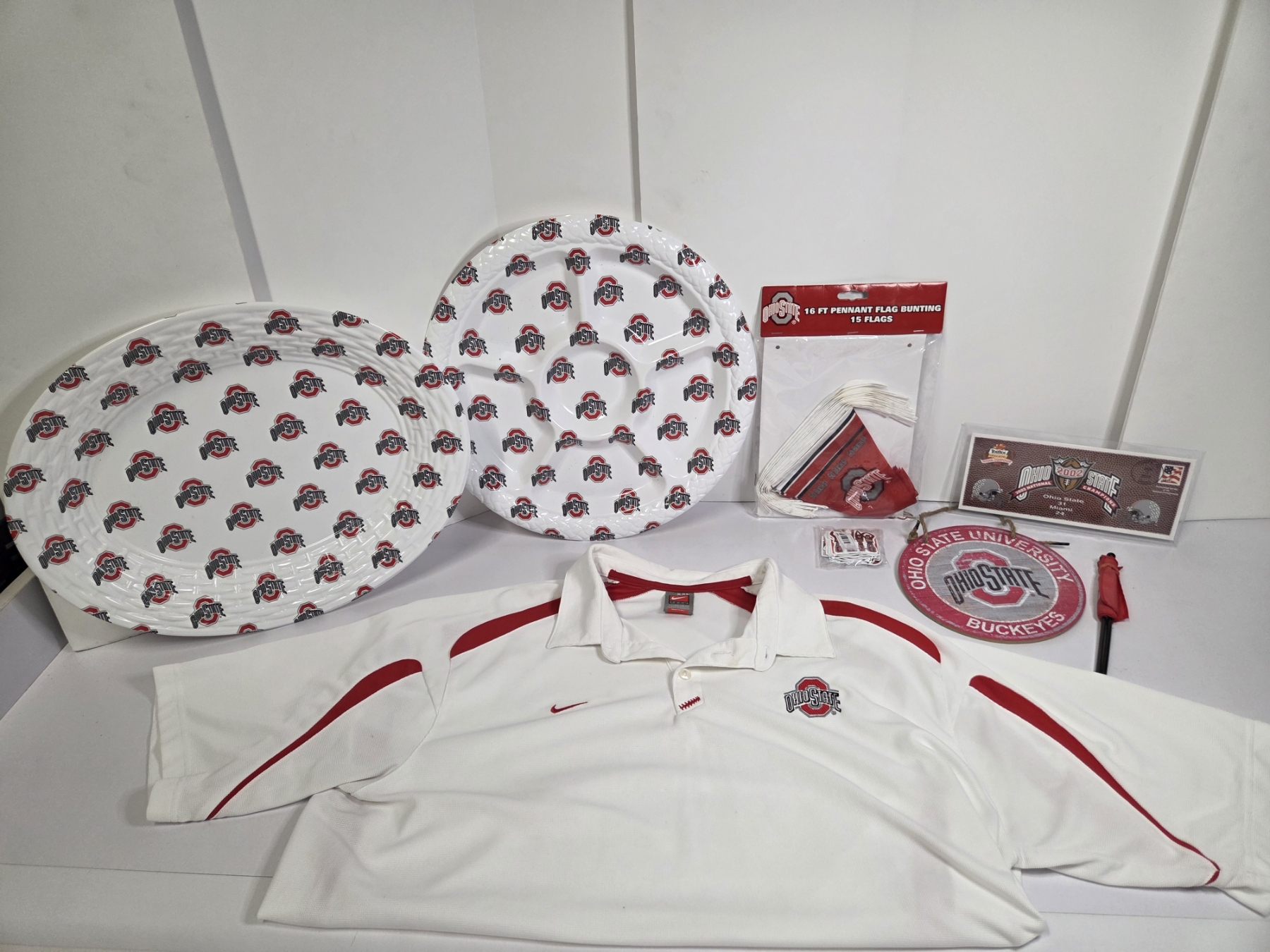 Fantastic OSU Group Including XXL Nike Golf Shirt, 16'' & 18'' Plastic Serving Trays, New 16ft Pennant Flag Banner, New Stickers, New 37 Cent 2003 Fiesta Bowl Envelope, 8'' Hanging Round Sign & Two Small Stick Flags!