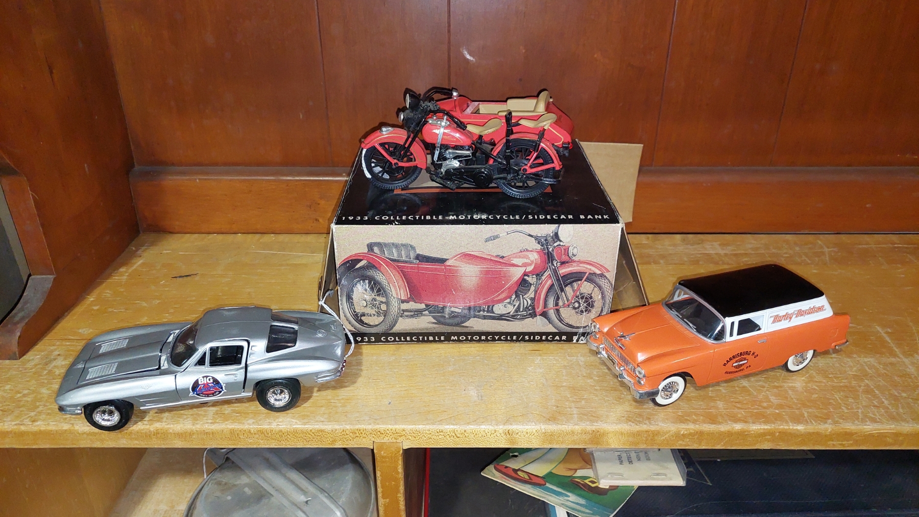Fantastic die Cast Lot - 3 Pcs Harley Davidson Motrcycle, Station Wagon & Corvette See Pics