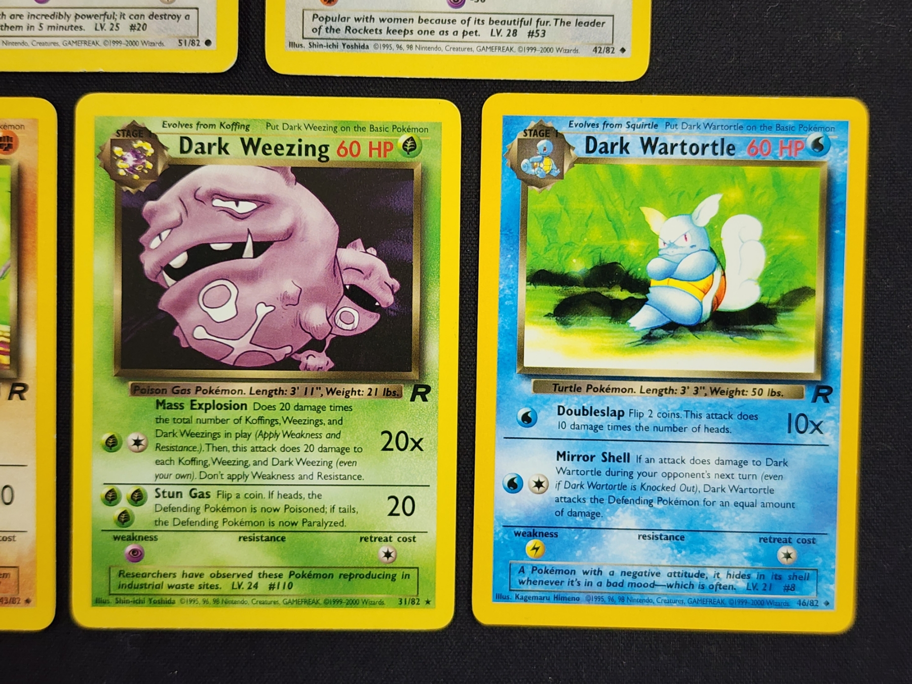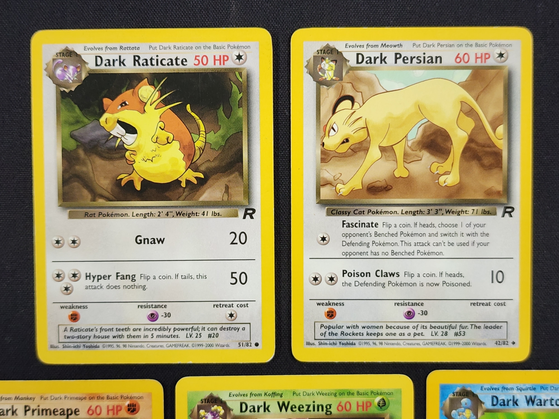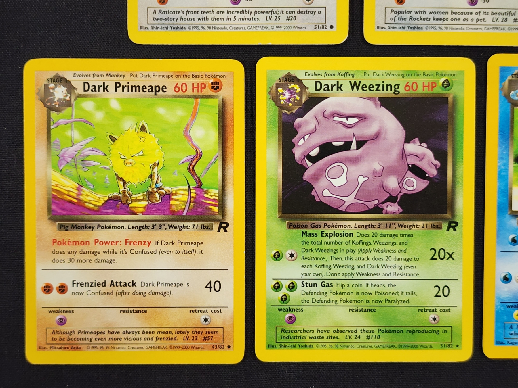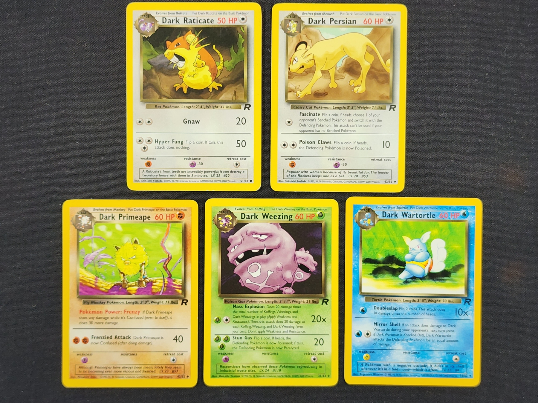 Five Assorted Vintage Team Rocket Set "Dark" Pokemon Trading Cards Including Weezing & Primeape