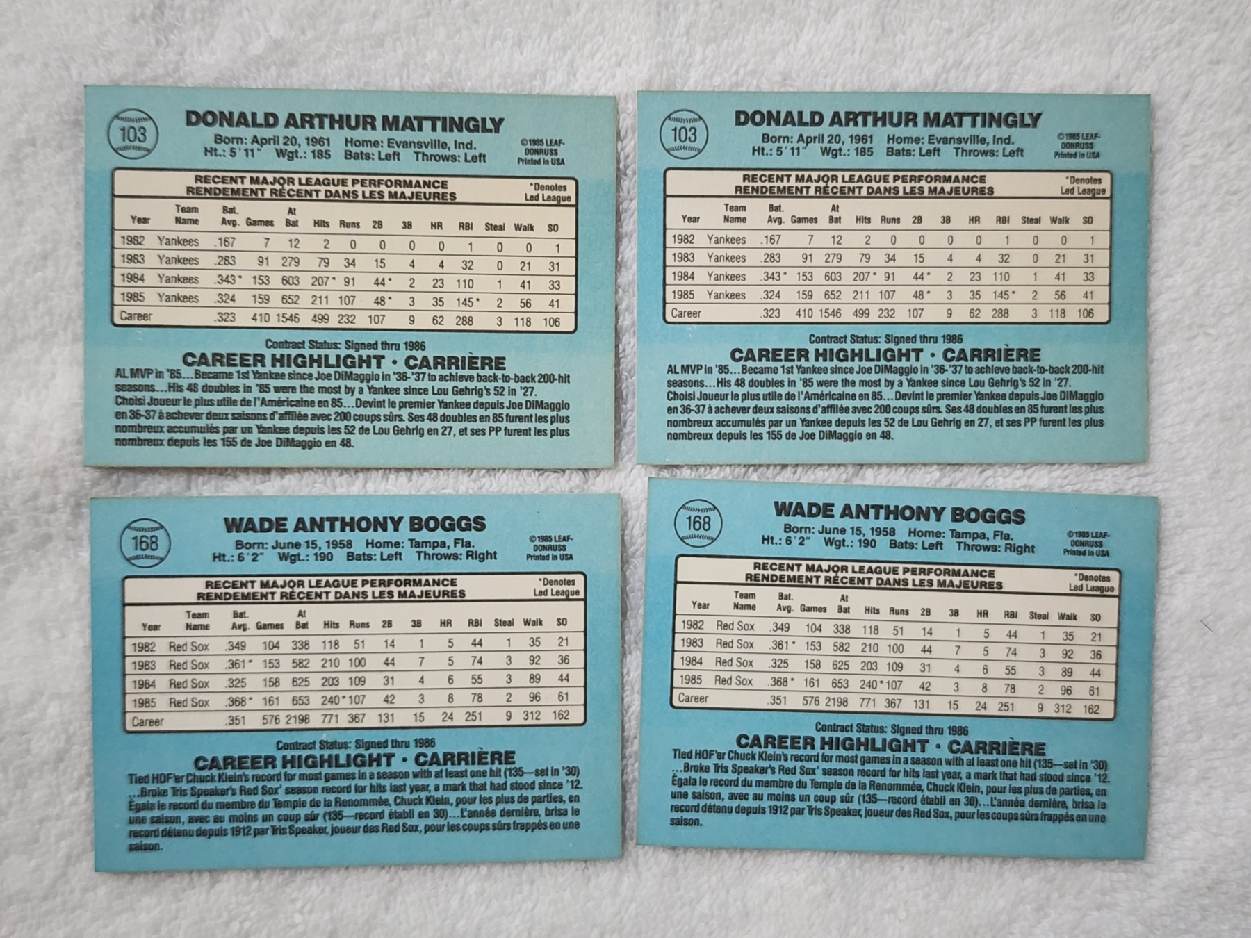 Four Assorted 1985 Leaf-Donruss Baseball Trading Cards Ft. Two Don Mattingly #103 & Two Wade Boggs #168
