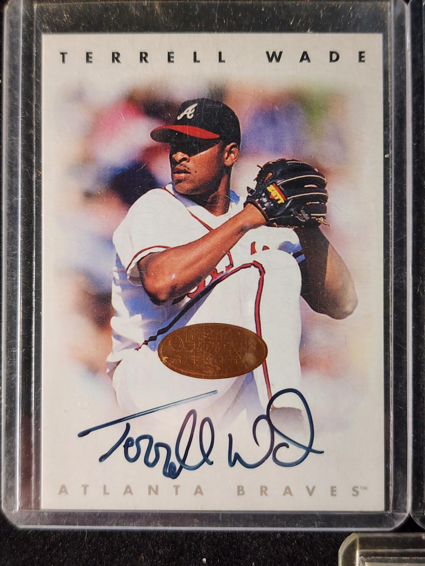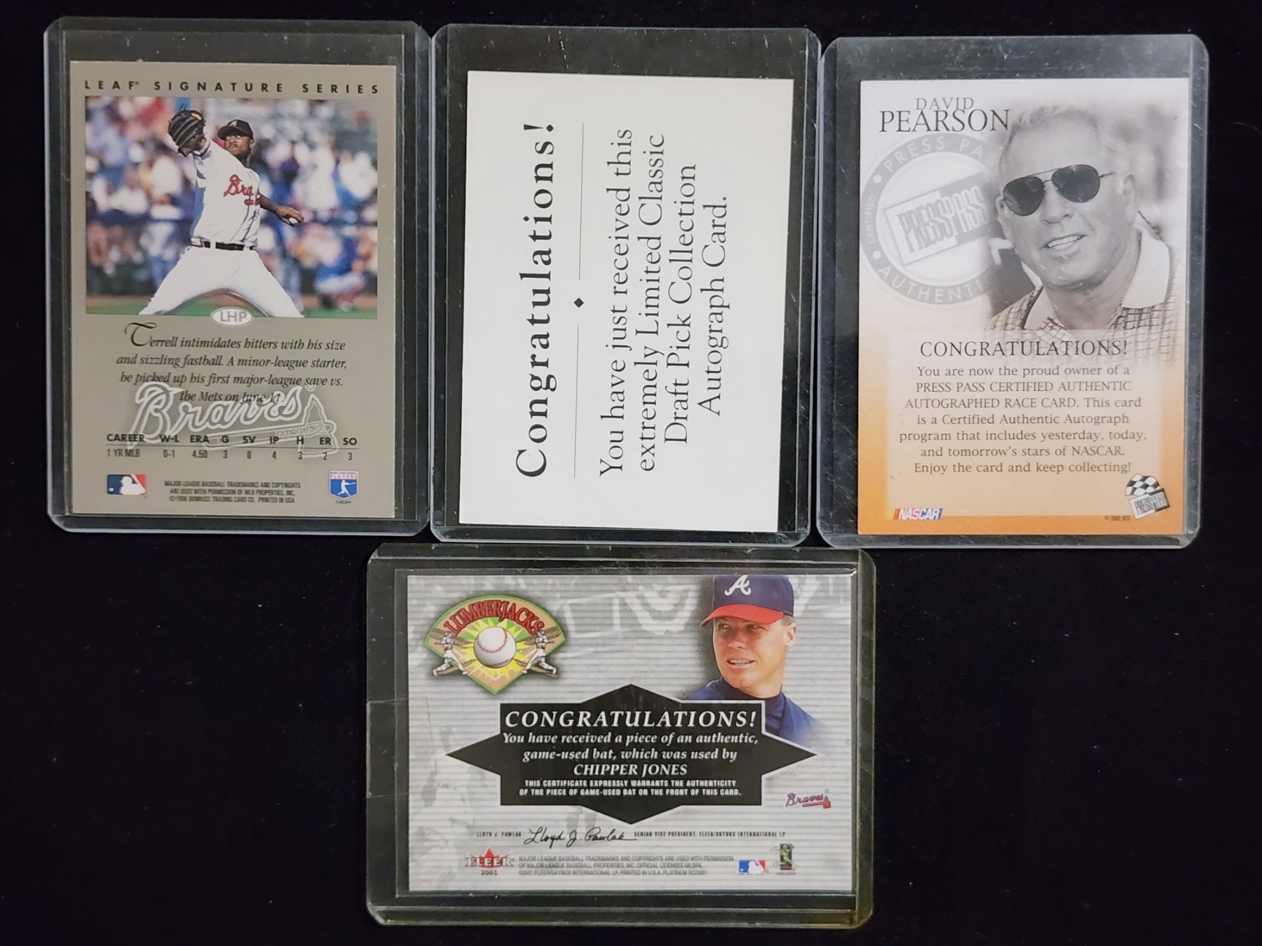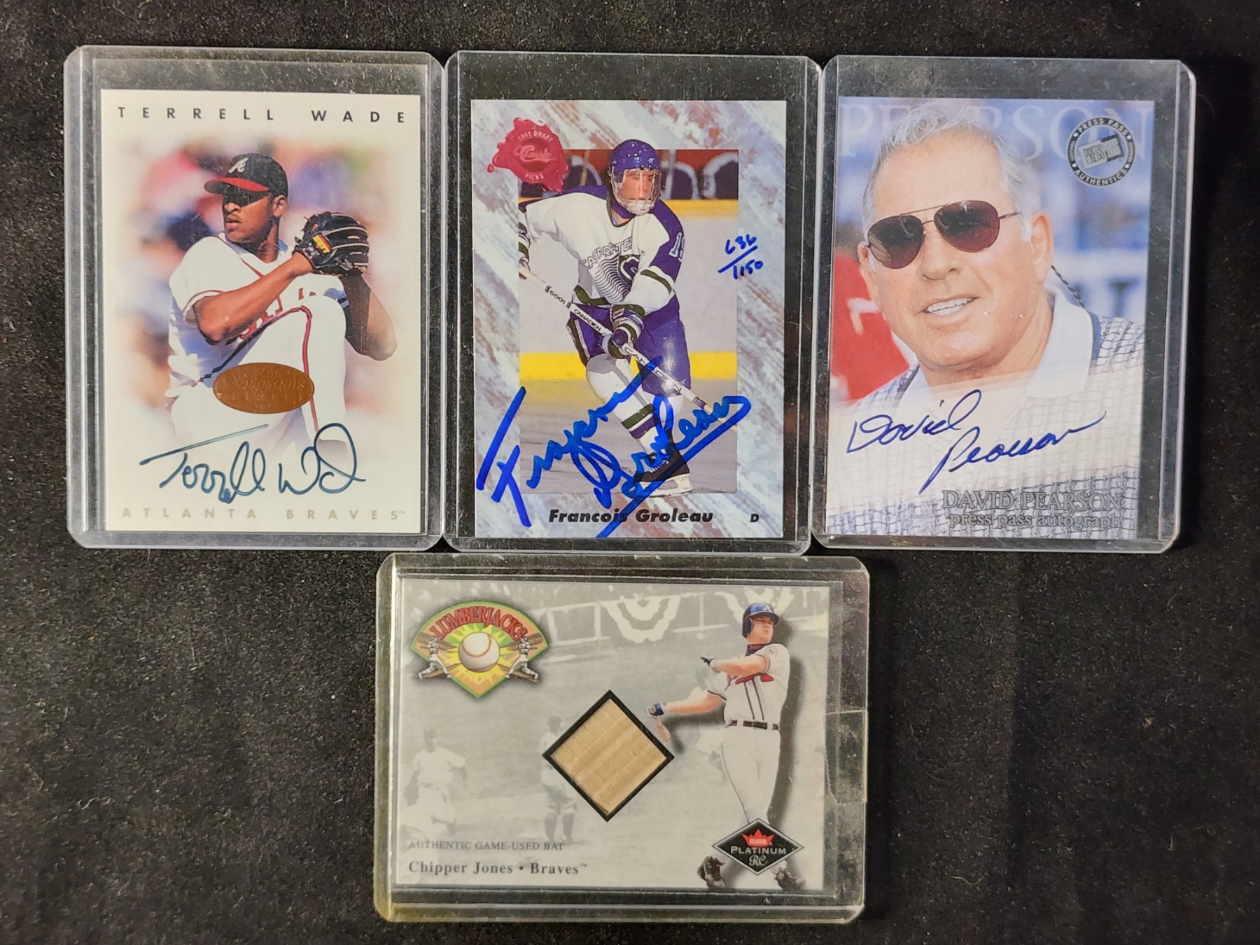 Four Assorted Trading Cards Ft. Three Autographed (Terrell Wade, Francois Groleau & David Pearson) & One Chipper Jones Game Used Bat Patch Card!