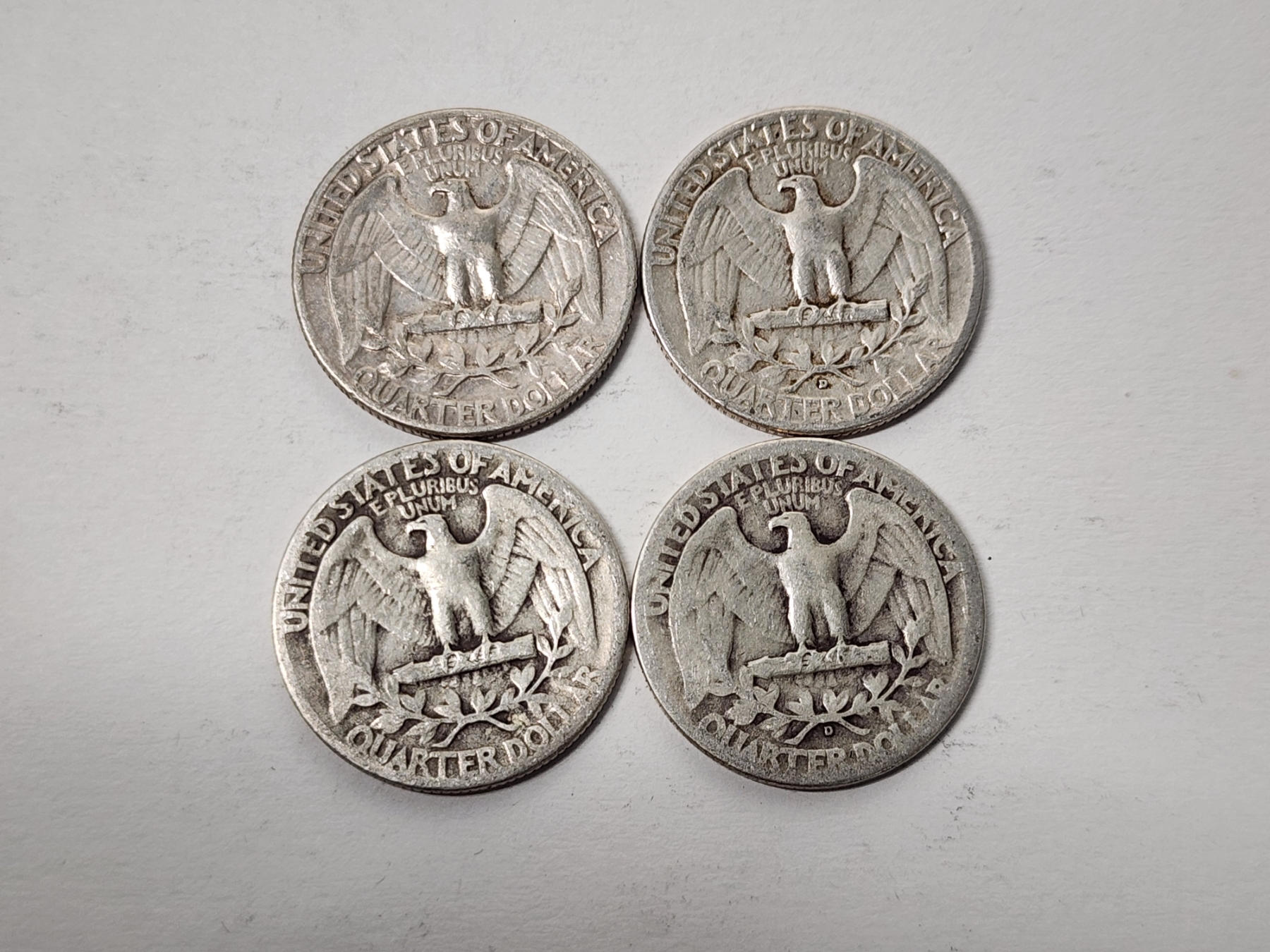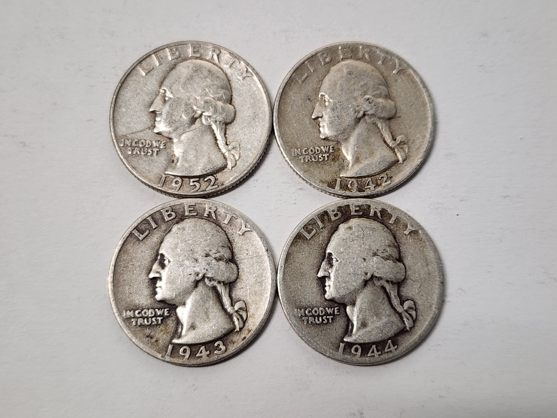 Four Assorted Years 90% Silver Washington Quarters - FV: $1.00