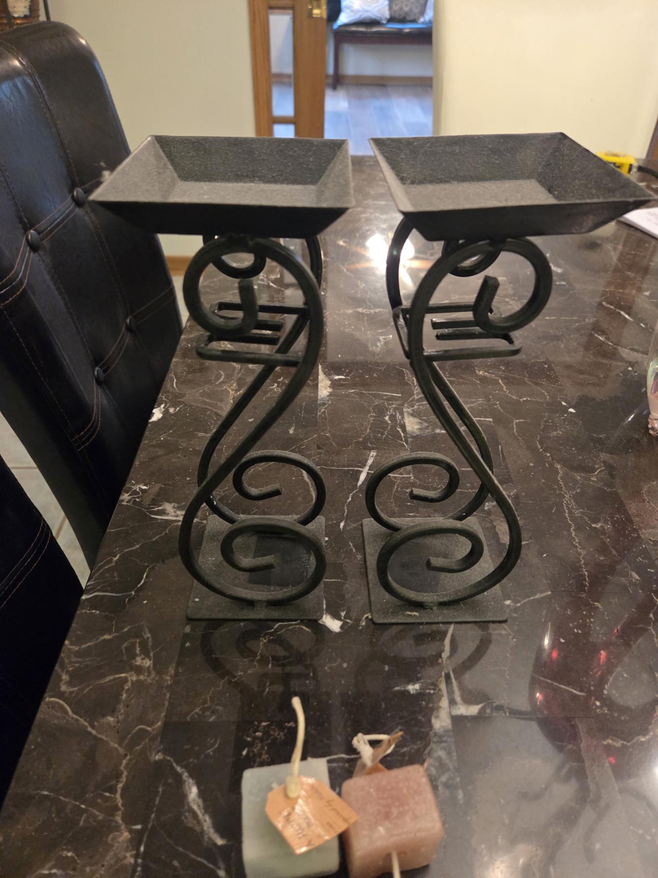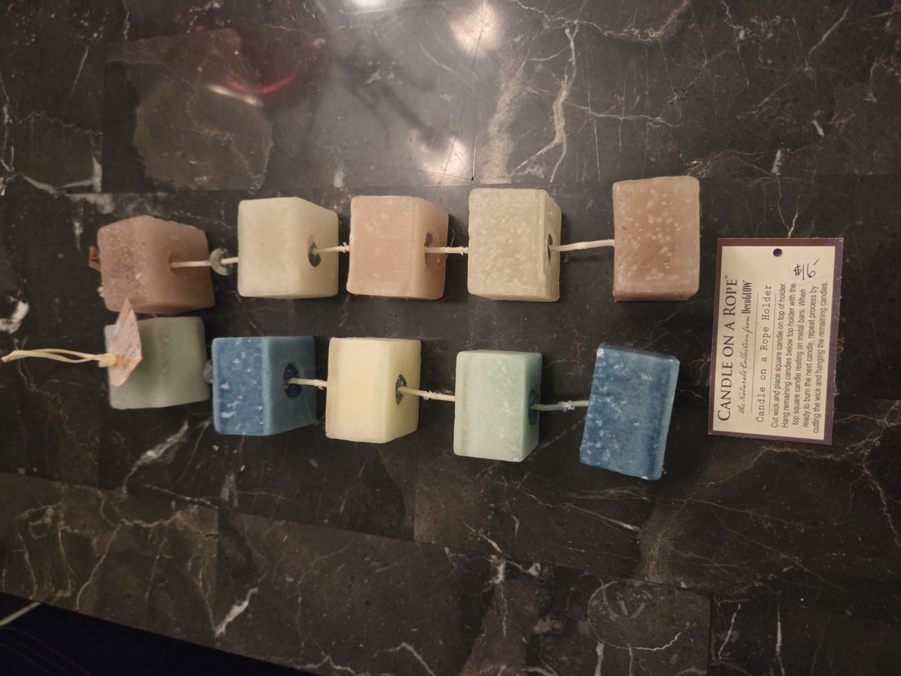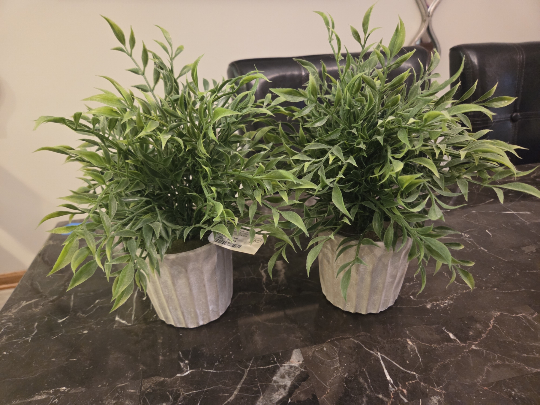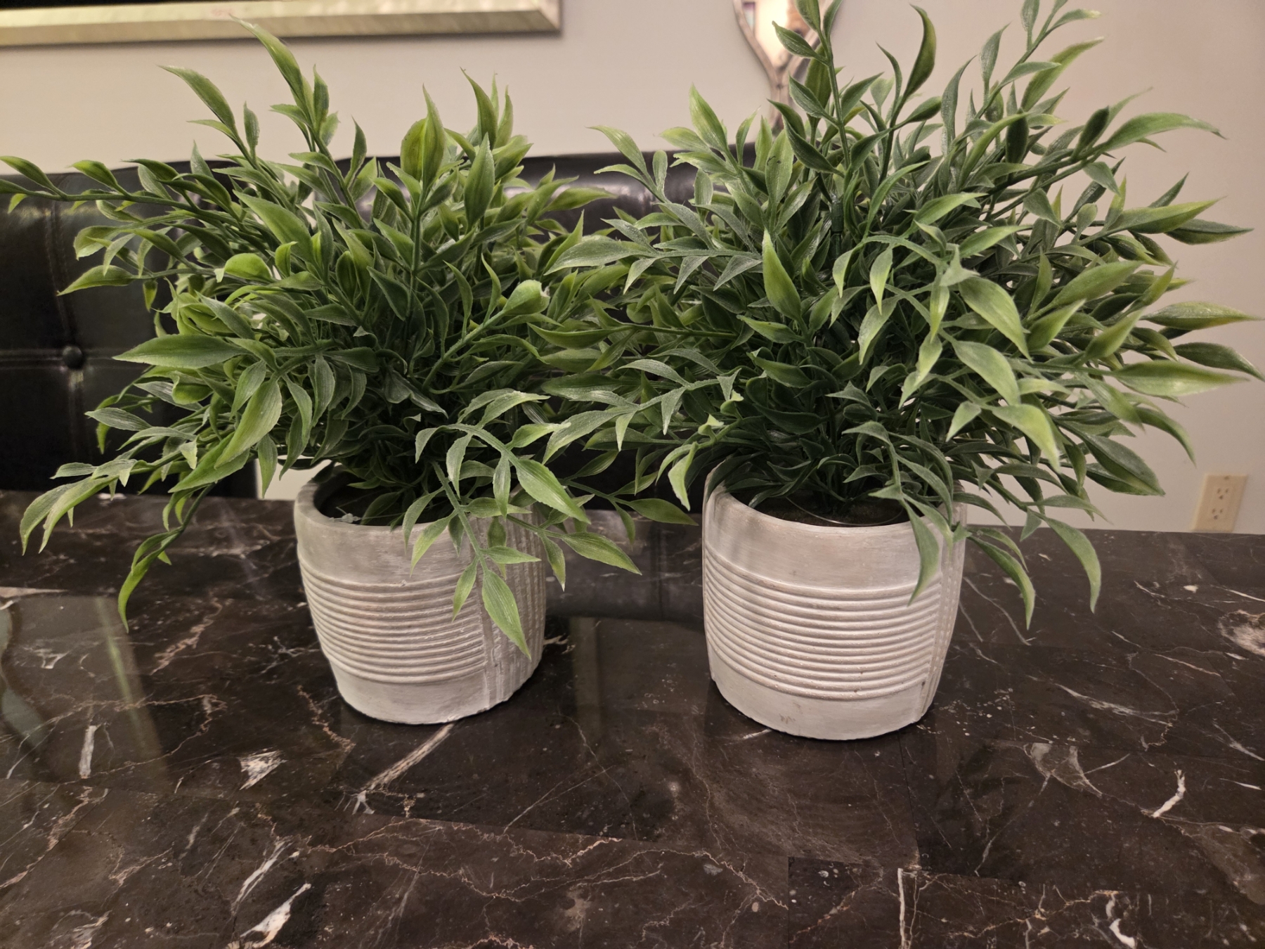 Four Like New Faux Potted Plants, & Two New Rope Candles With Holders