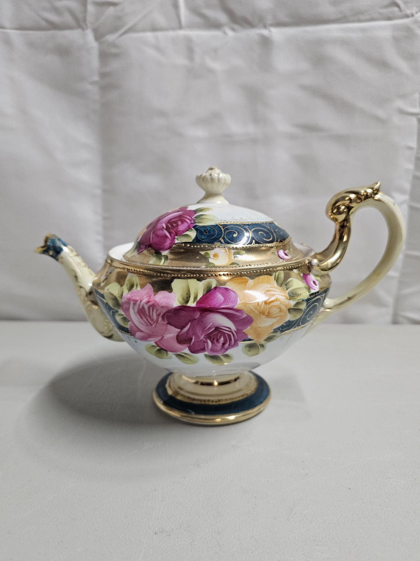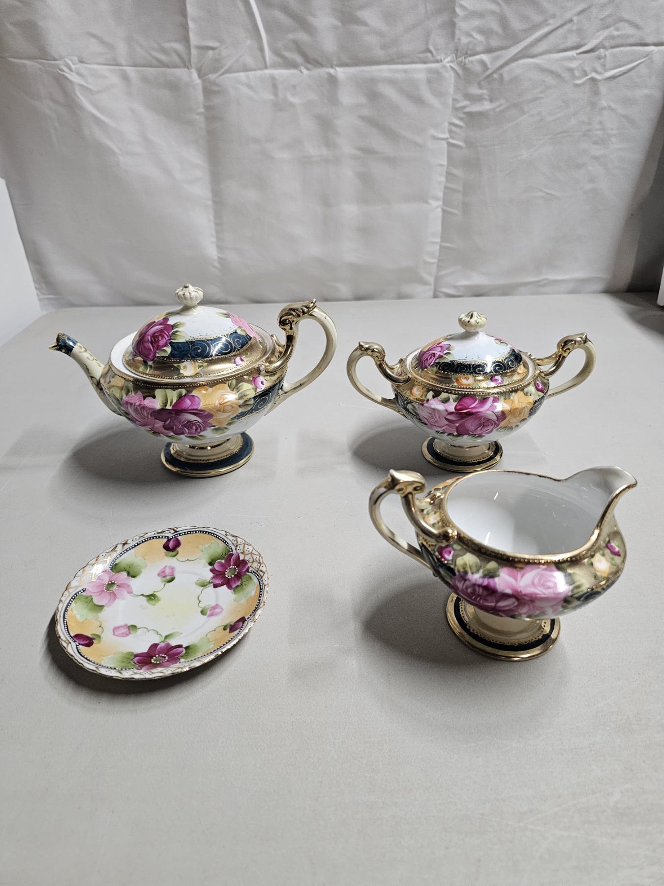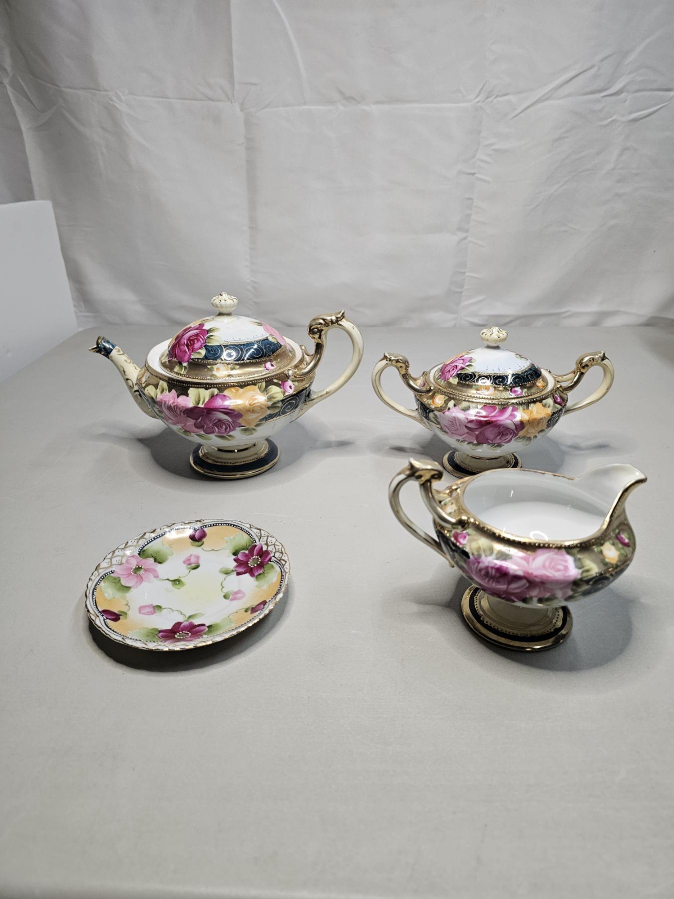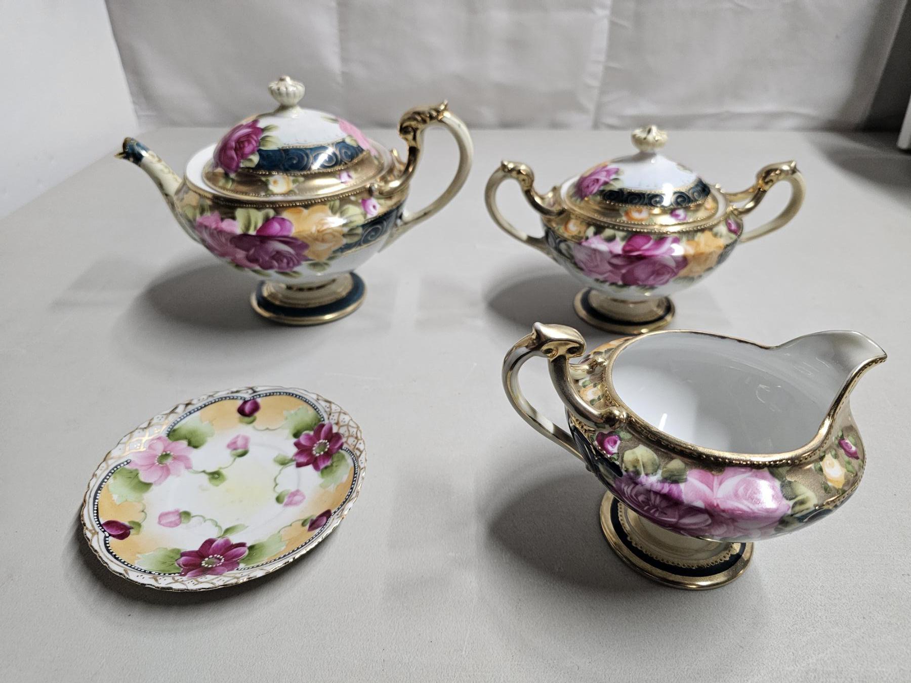 Gold Rimmed Nippon Tea Set (4pc) - Vintage Japanese Tea Set, Includes 6" Tea Pot, 5" Creamer, 5" Sugar Pot, 5" Tea Saucer