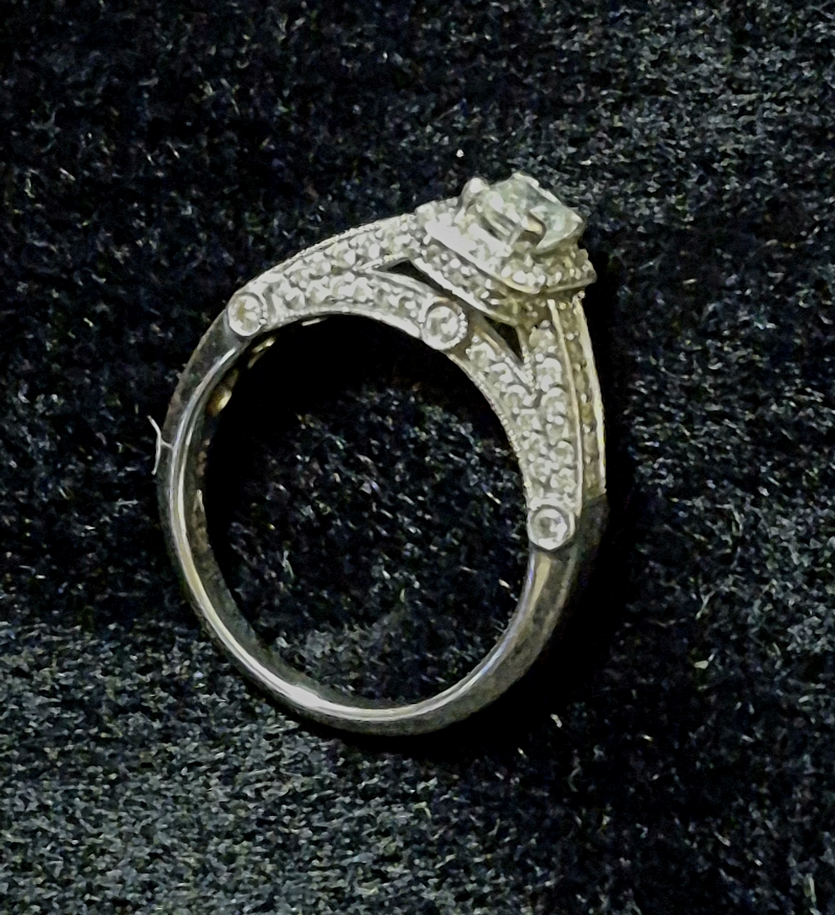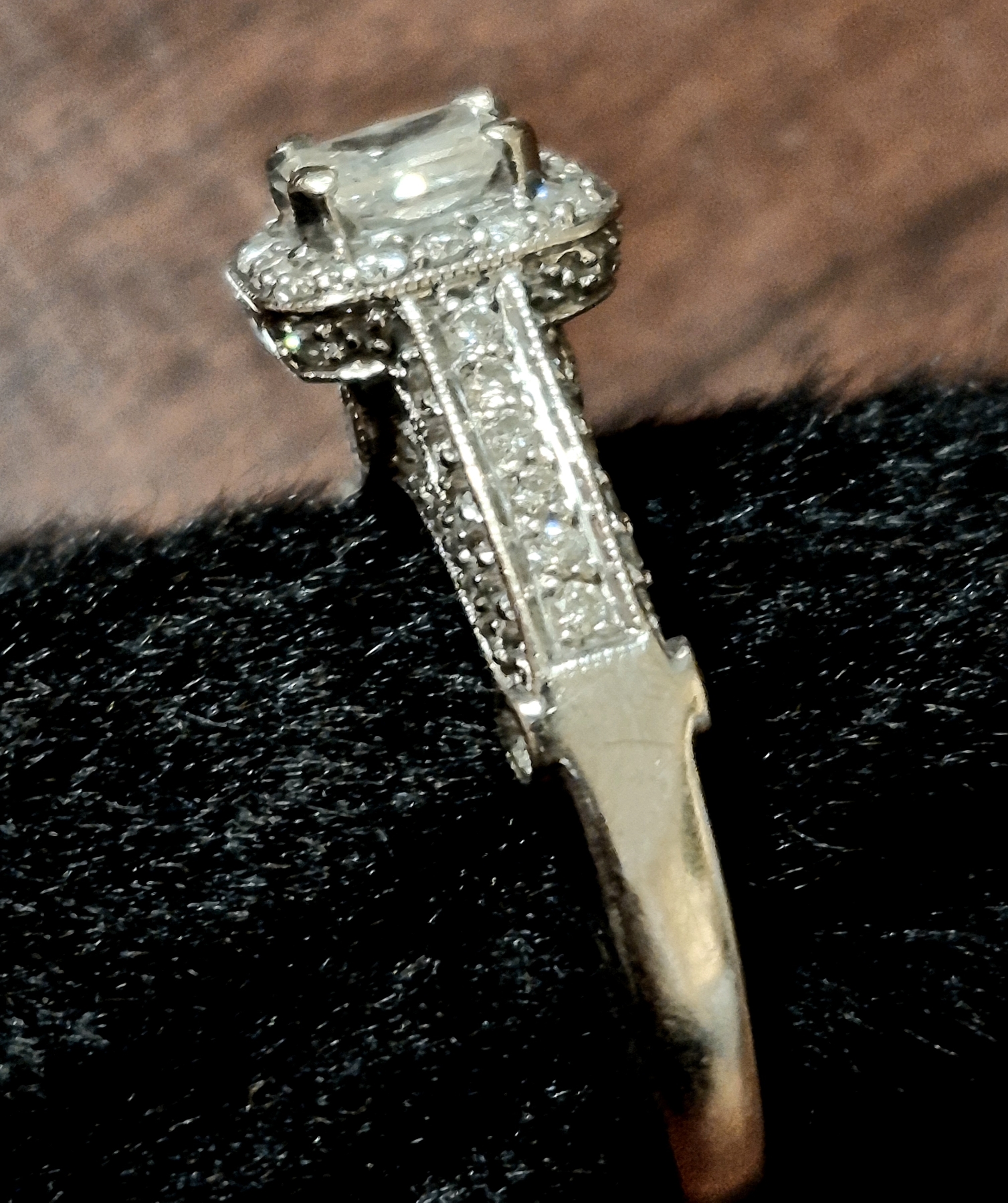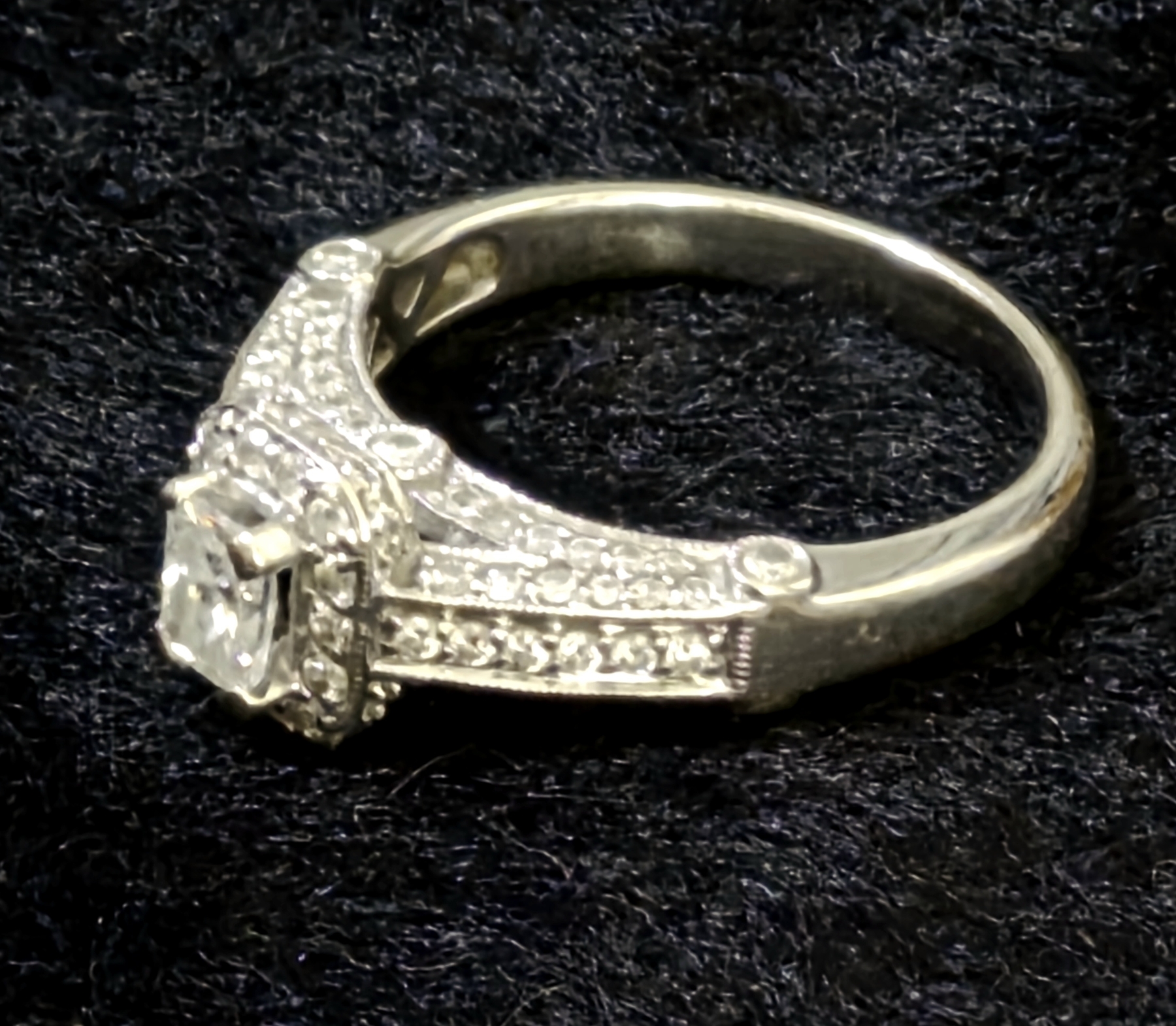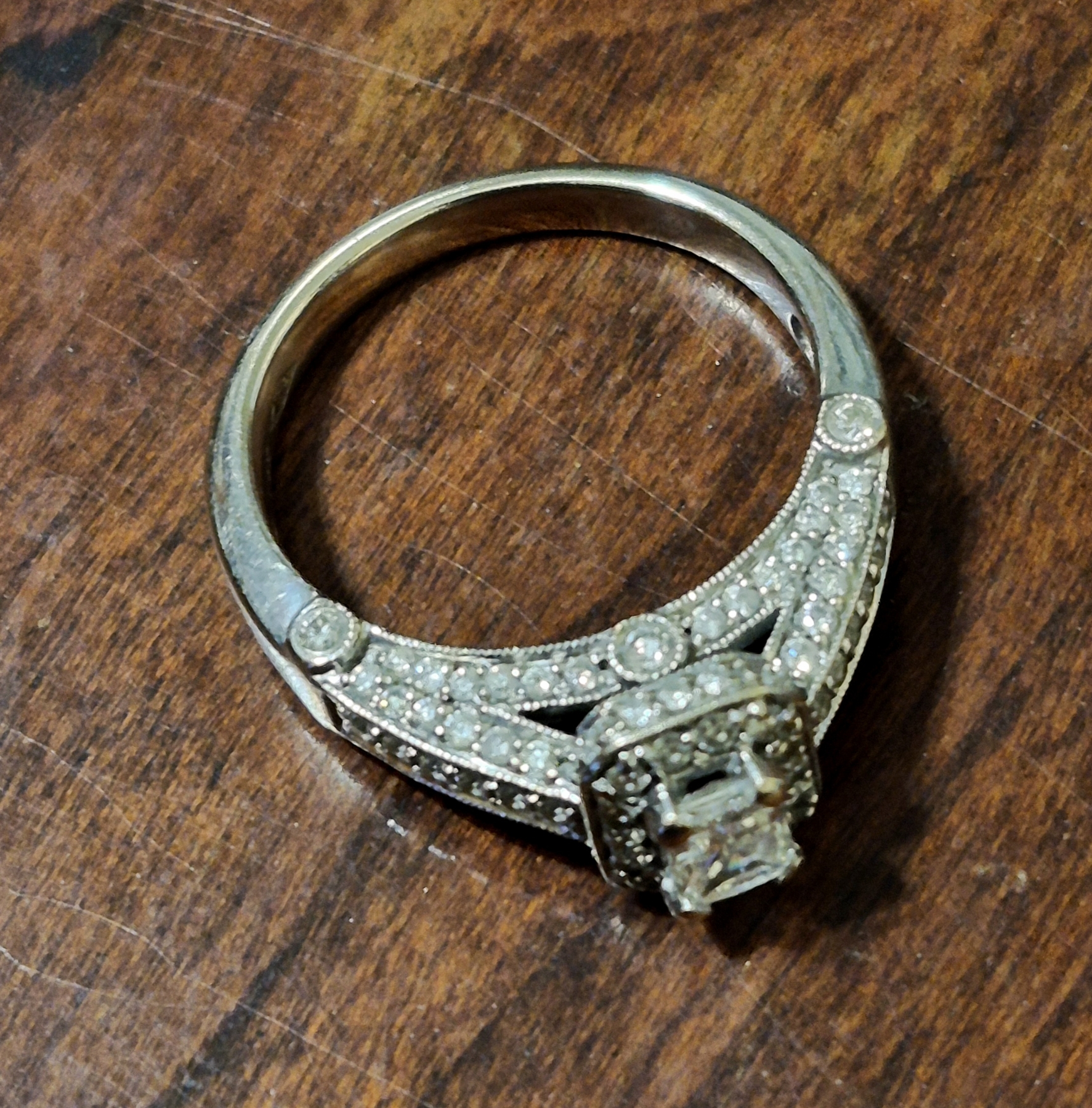 Gorgeous Sz 7.25 14K WG Ladies Diamond Ring 3.5- 5mm Main Stone - 55 Diamonds Total Weight is 4.6 Grams 14K Solid Gold- See Detailed photos. this is a pareticularly elegant arrangement of more than 55 diamonds. Main Stone is a Rectangular Cut 3.5 mm Width by 5 mm Length mounted center high as you can see in the photos. Surrounded by one row of small diamonds immediately under the main stone, and then lavishly embellished on each side of the ring with more diamonds. The count is actuallyt more than 55 - up to 60, Total weight of the ring is 4.6 grams 14K White Gold.