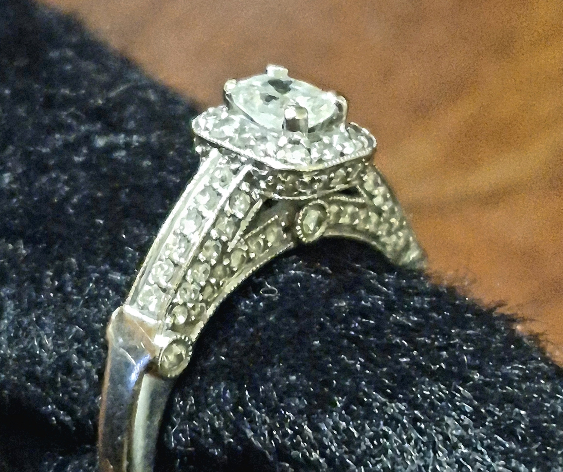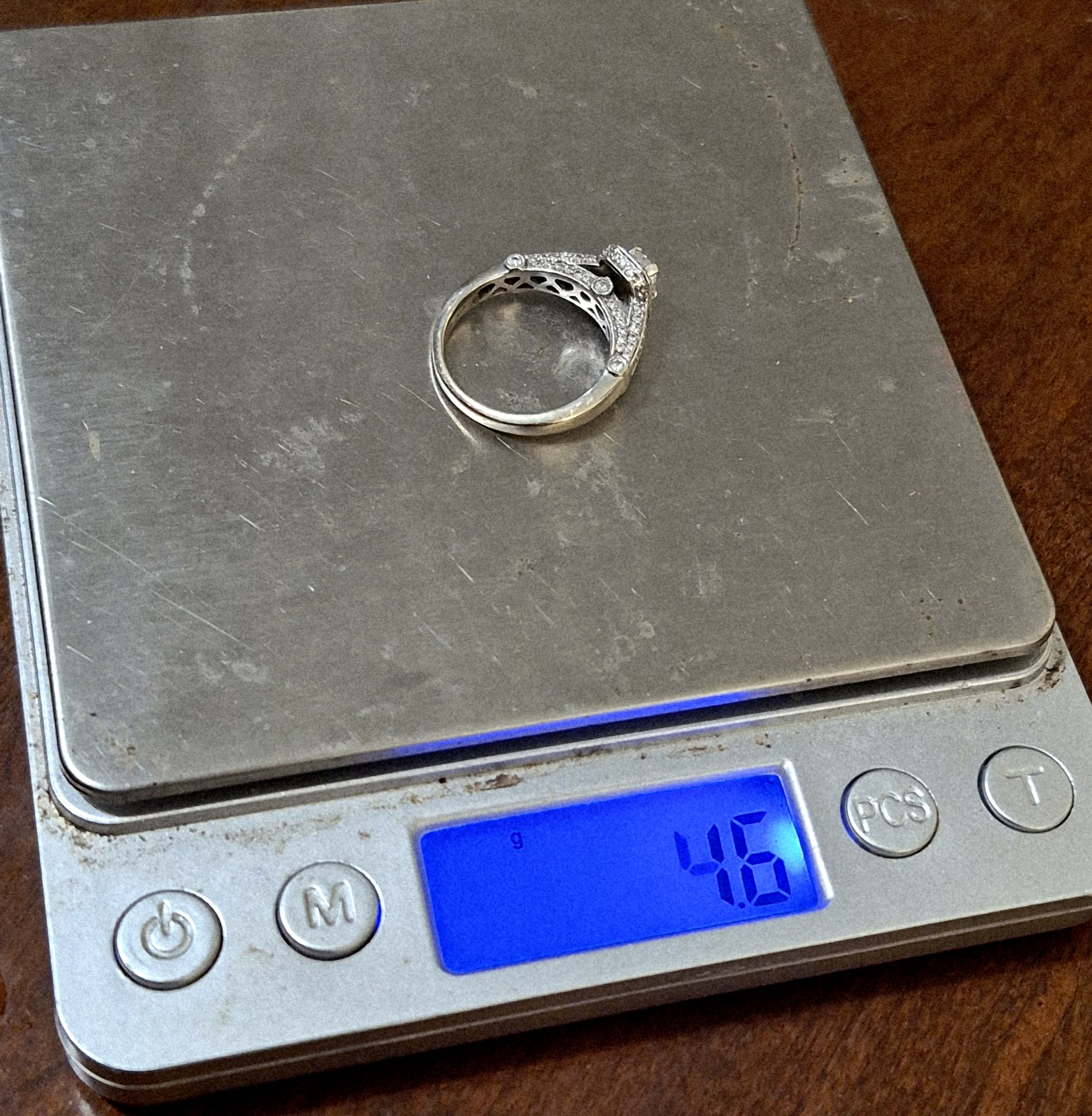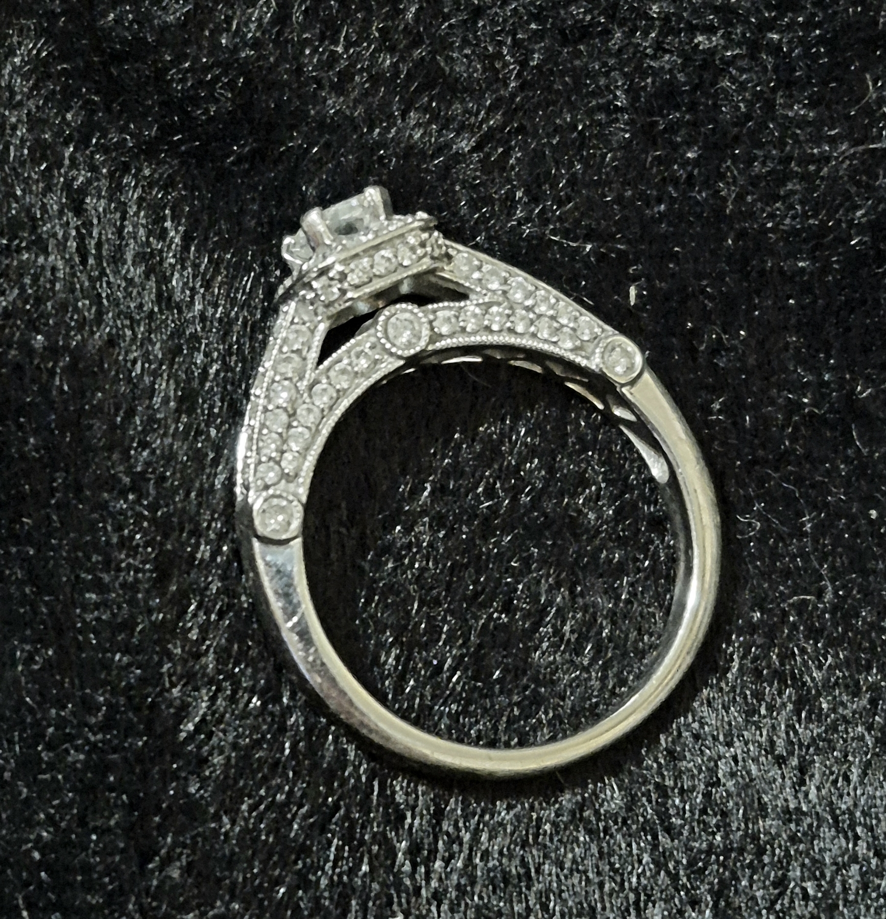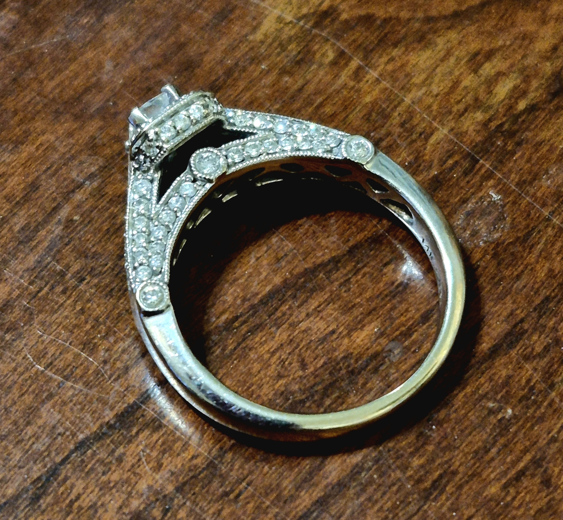 Gorgeous Sz 7.25 14K WG Ladies Diamond Ring 3.5- 5mm Main Stone - 55 Diamonds Total Weight is 4.6 Grams 14K Solid Gold- See Detailed photos. this is a pareticularly elegant arrangement of more than 55 diamonds. Main Stone is a Rectangular Cut 3.5 mm Width by 5 mm Length mounted center high as you can see in the photos. Surrounded by one row of small diamonds immediately under the main stone, and then lavishly embellished on each side of the ring with more diamonds. The count is actuallyt more than 55 - up to 60, Total weight of the ring is 4.6 grams 14K White Gold.