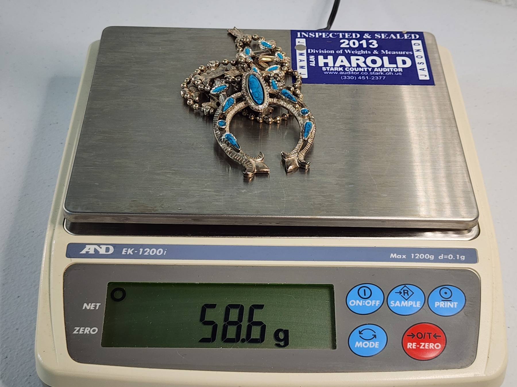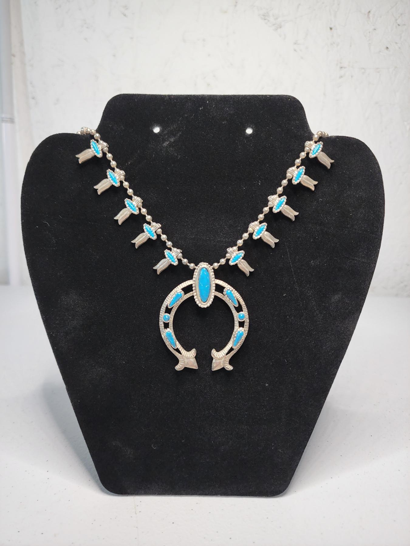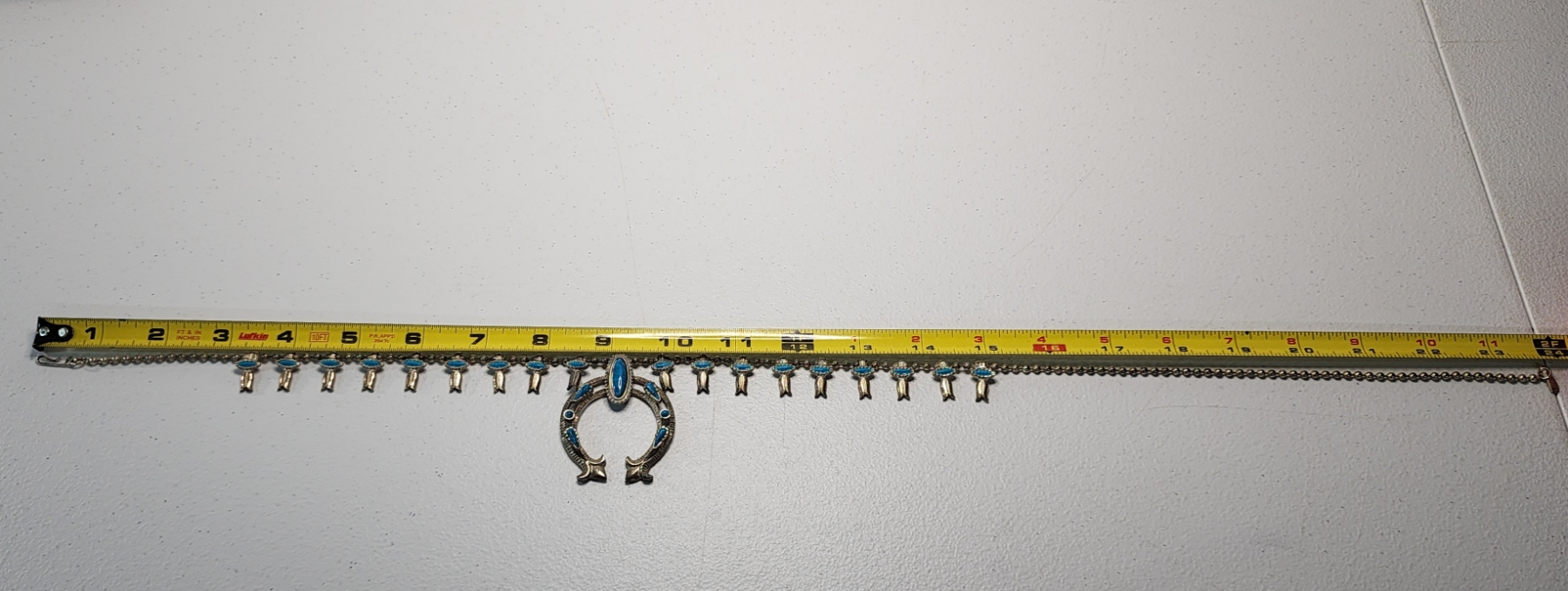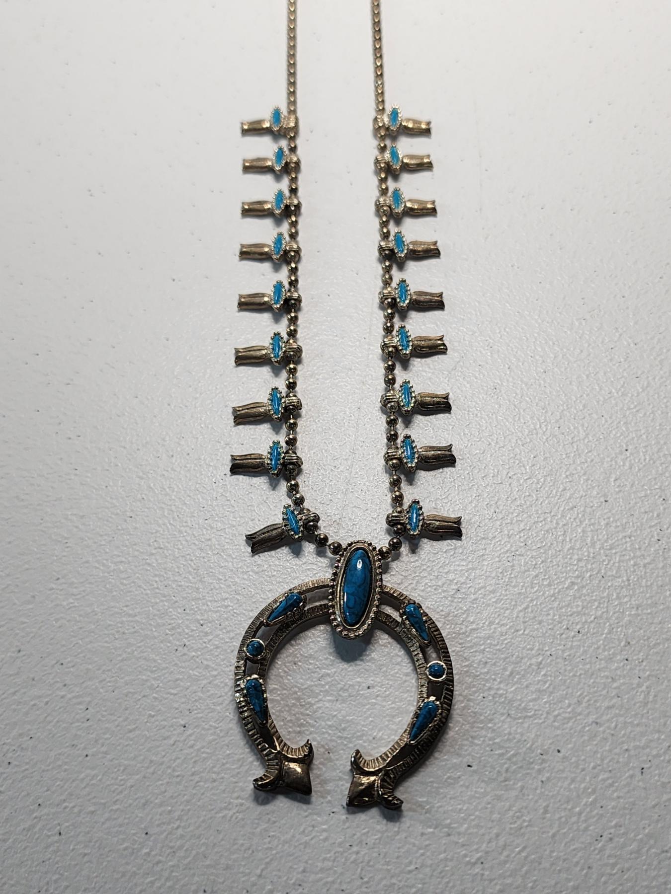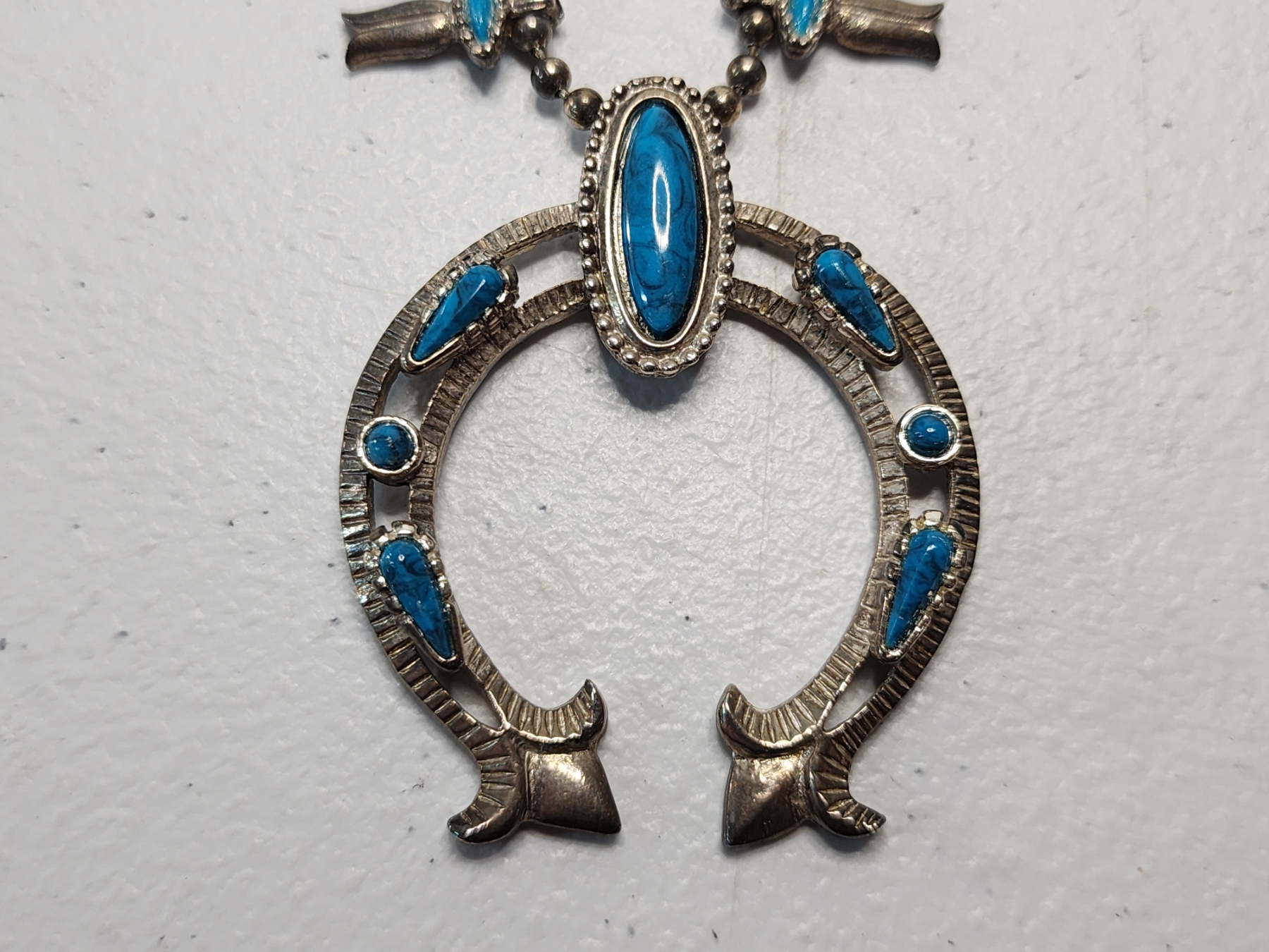 Gorgeous Vintage "Indian Princess Squash Blossom" Silver-Tone and Turquoise Necklace - 24in