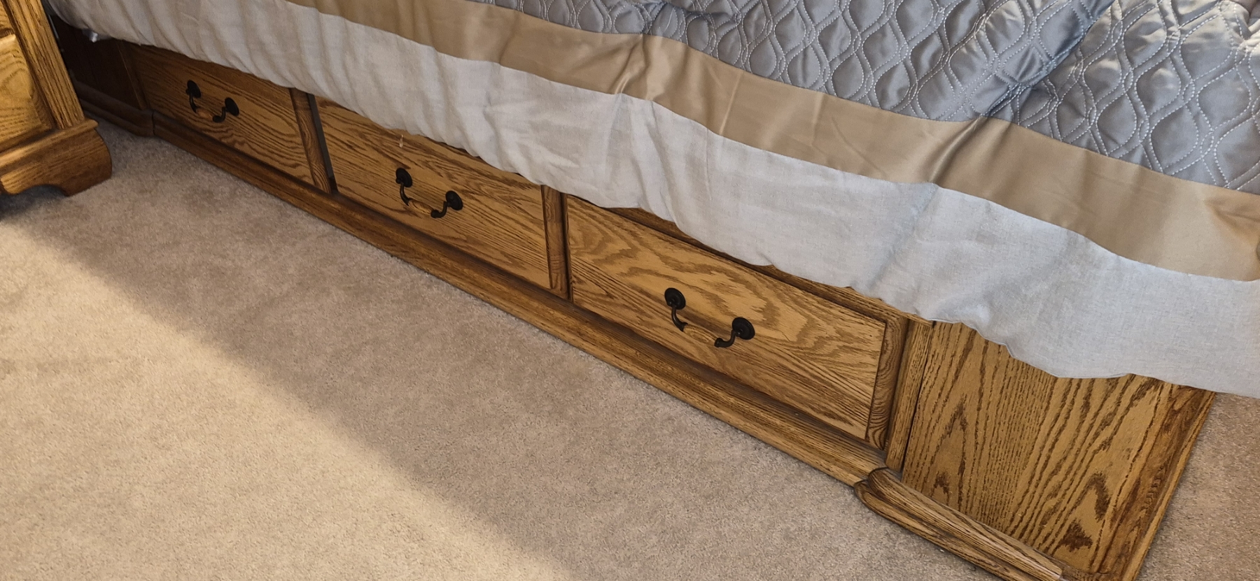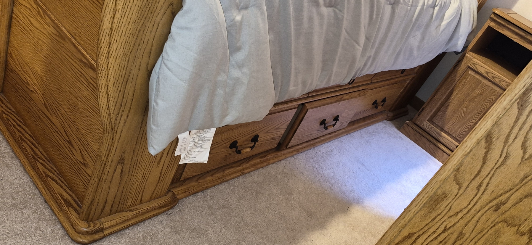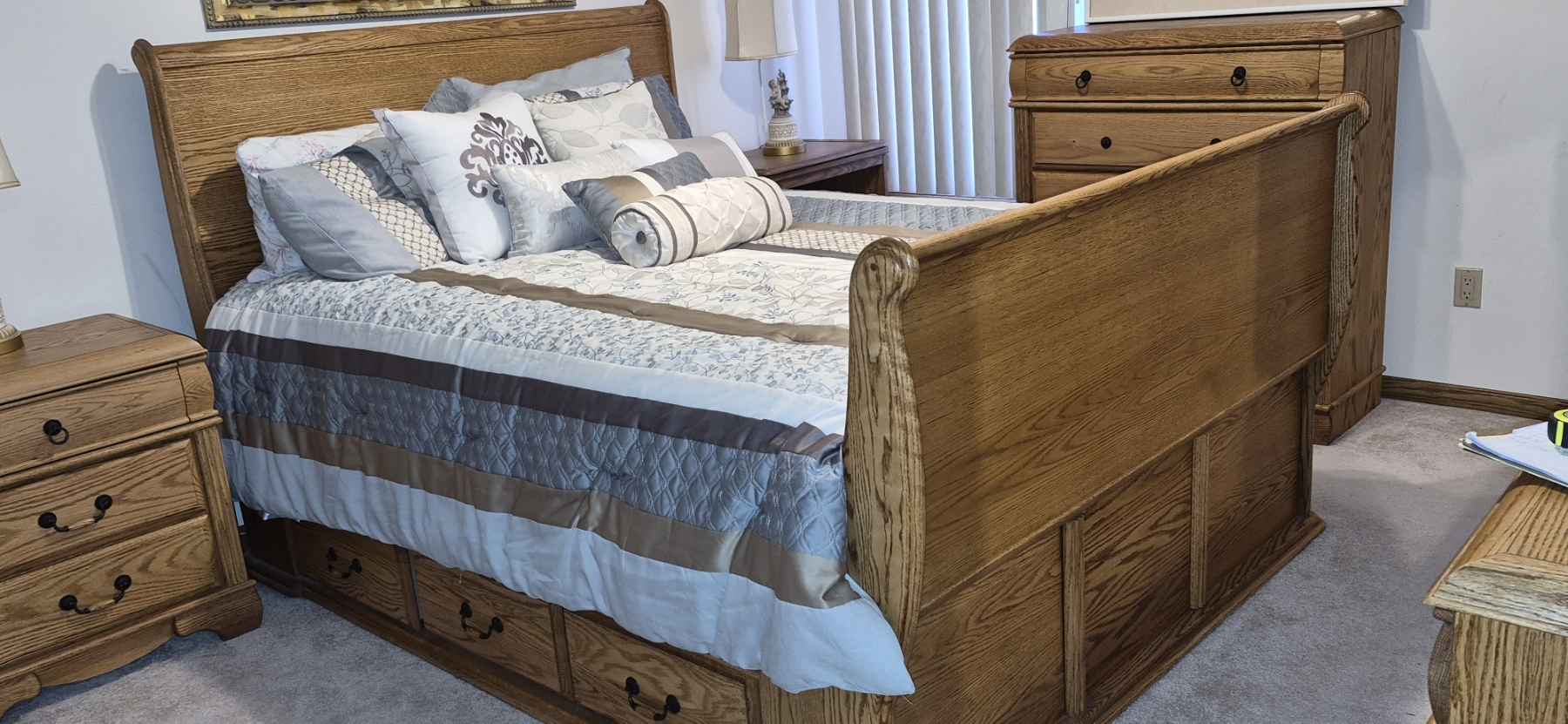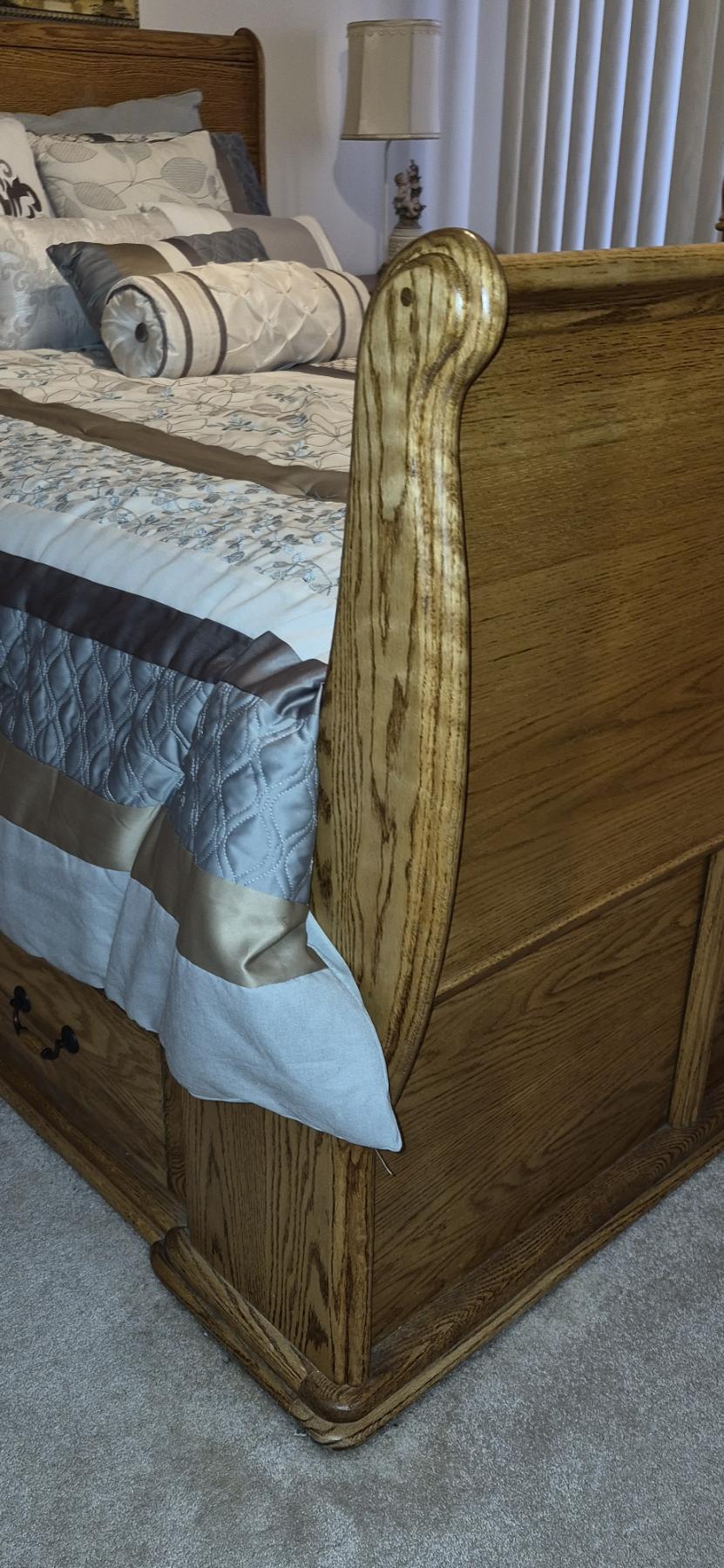 Gorgeous solid Oak And MINT Condition Queen Size Sleigh Bed - Everything Included - may Not Have Been Used Or Only Slightly - Bed Measures 88 Length, 63 Width, And Height of the Sleigh Backboard is 52" Tall - Mattress & PIllows Included
