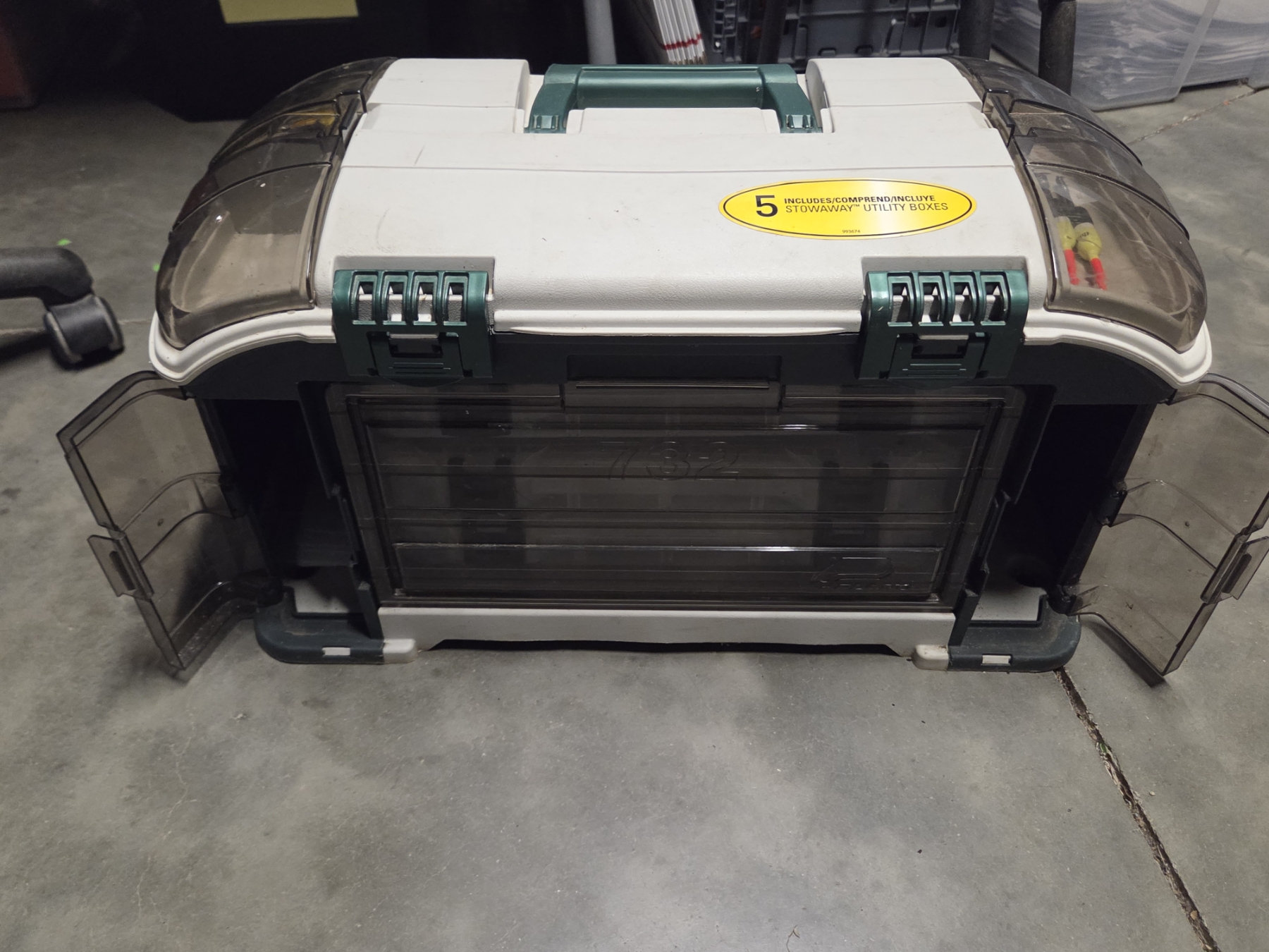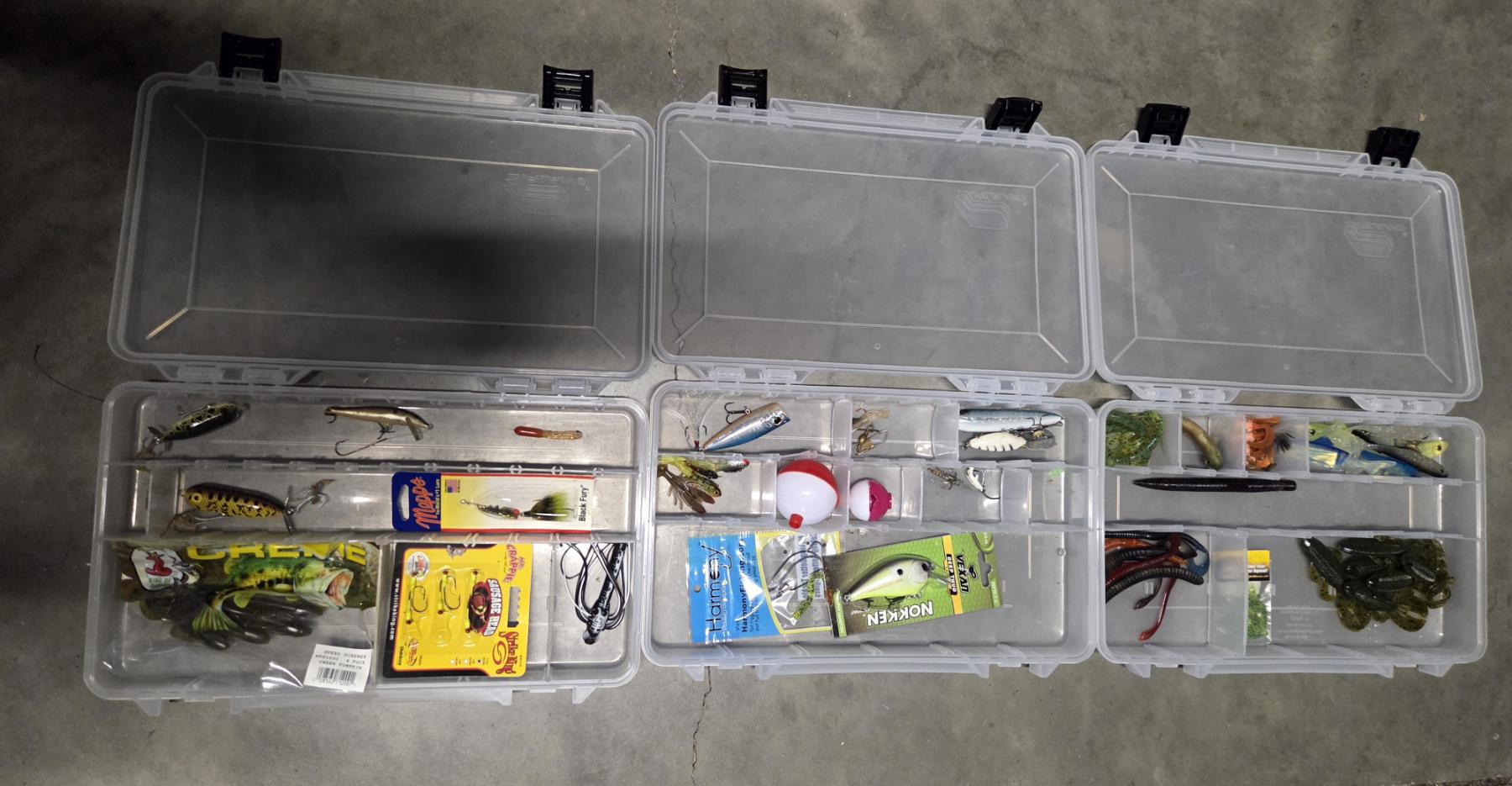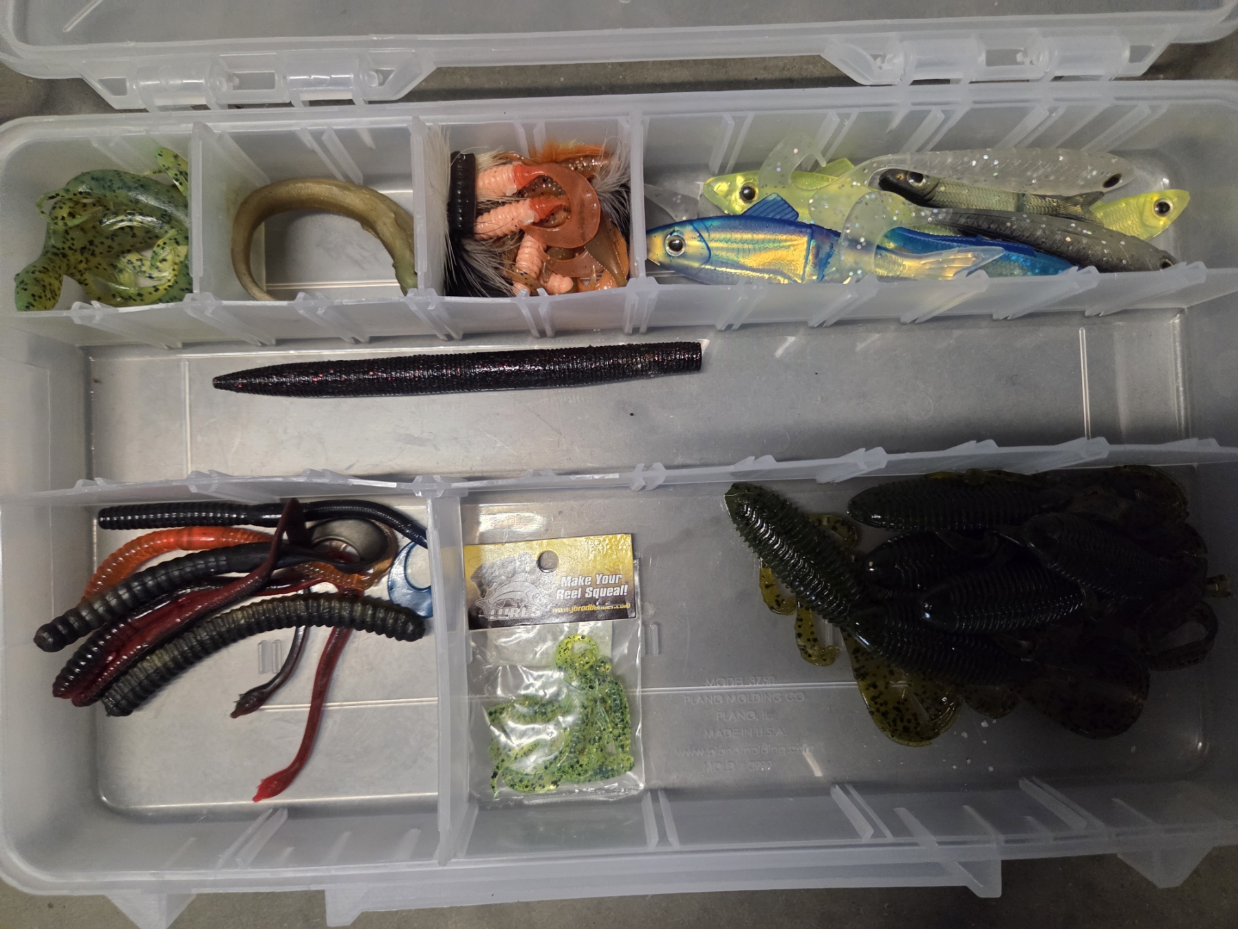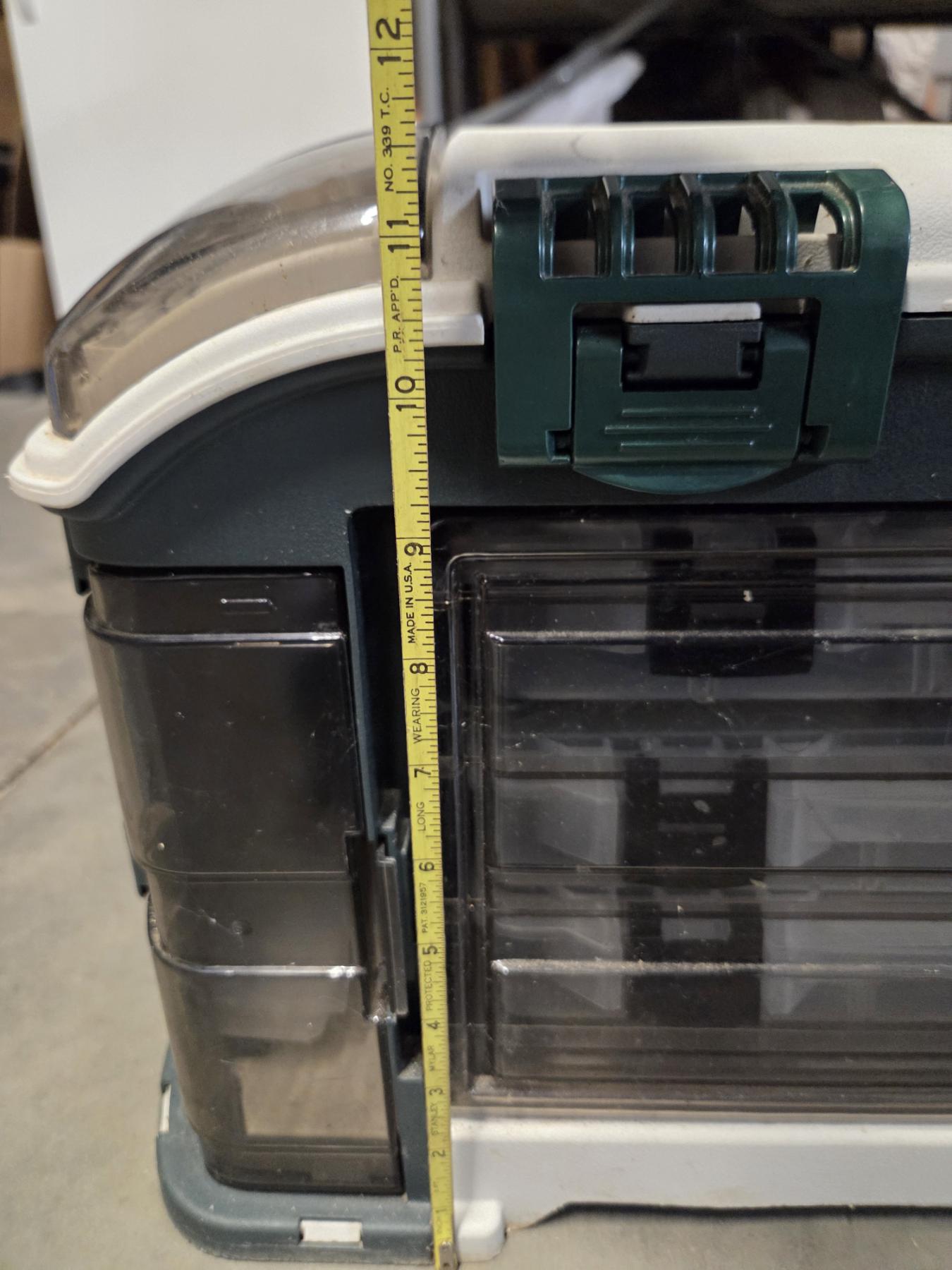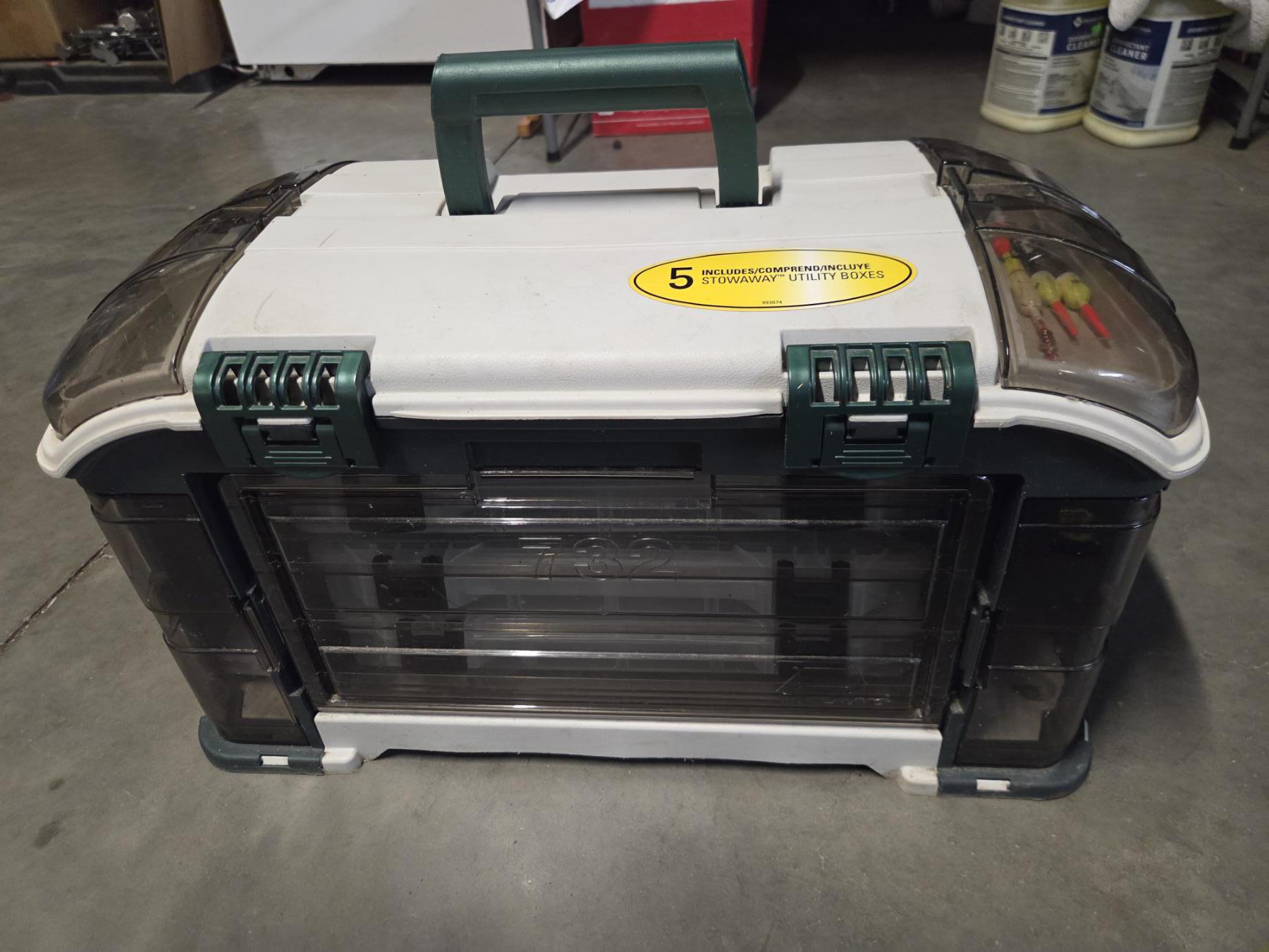 Great Condition Plano 732 Tackle Box With Dual Top Access. 3 Pull Out Clear Boxes With Assorted New & Like New Rubber Worms, Hooks, Lures, Jigs & More! Plus 4 Additional Storage Spaces, 23''L x 12.5'' W x 11.75'' H