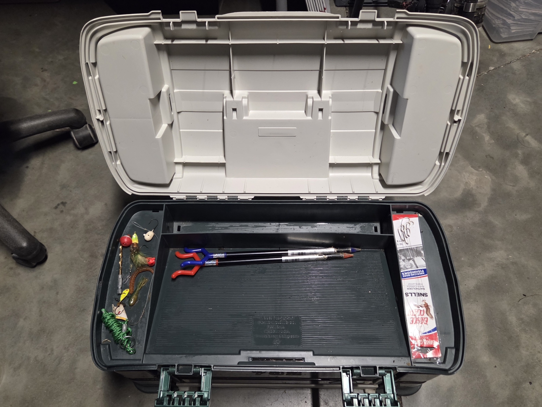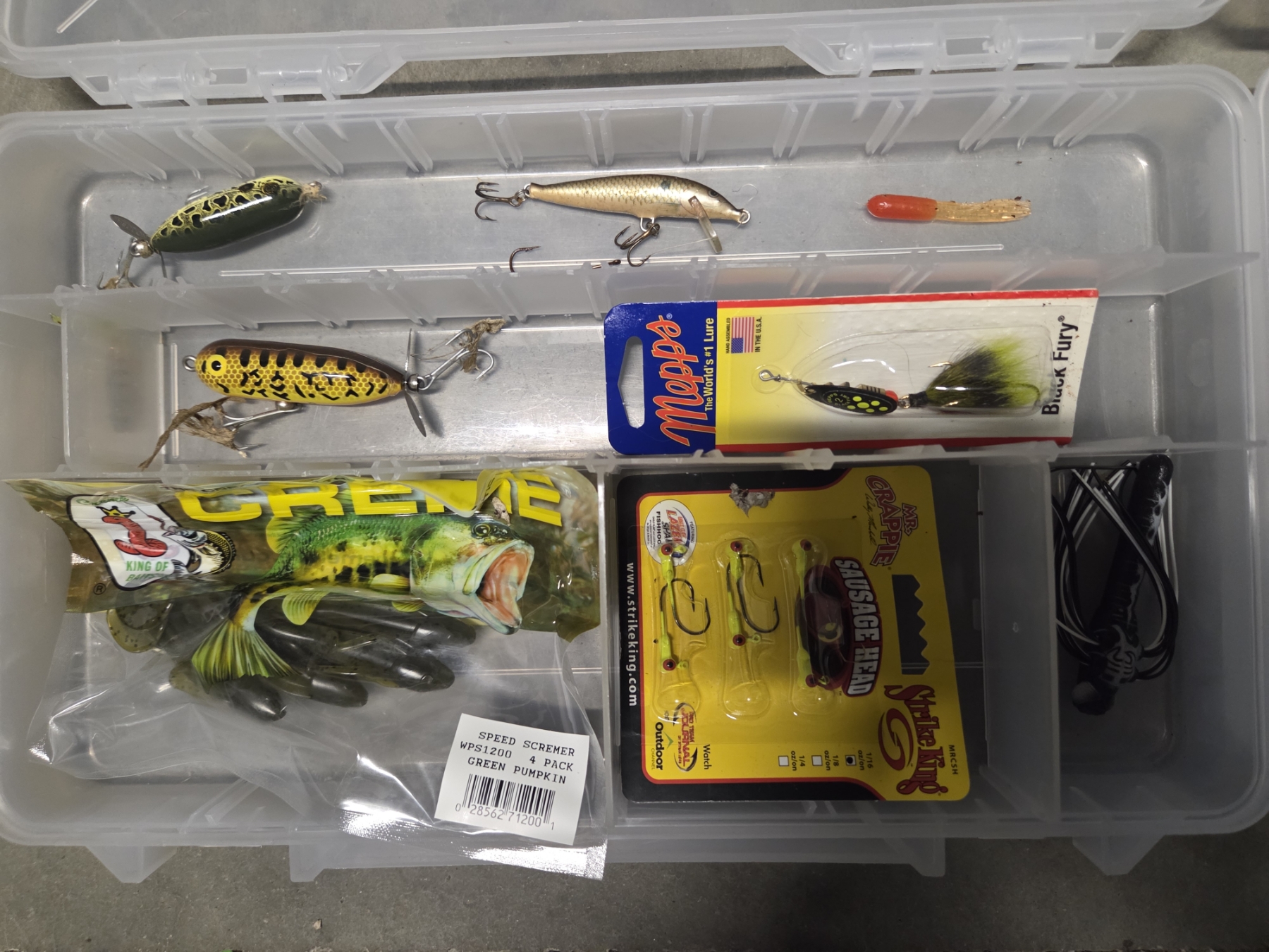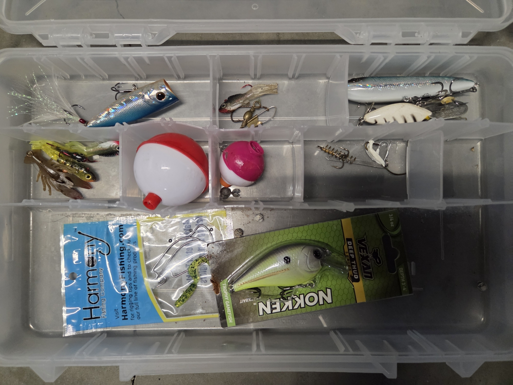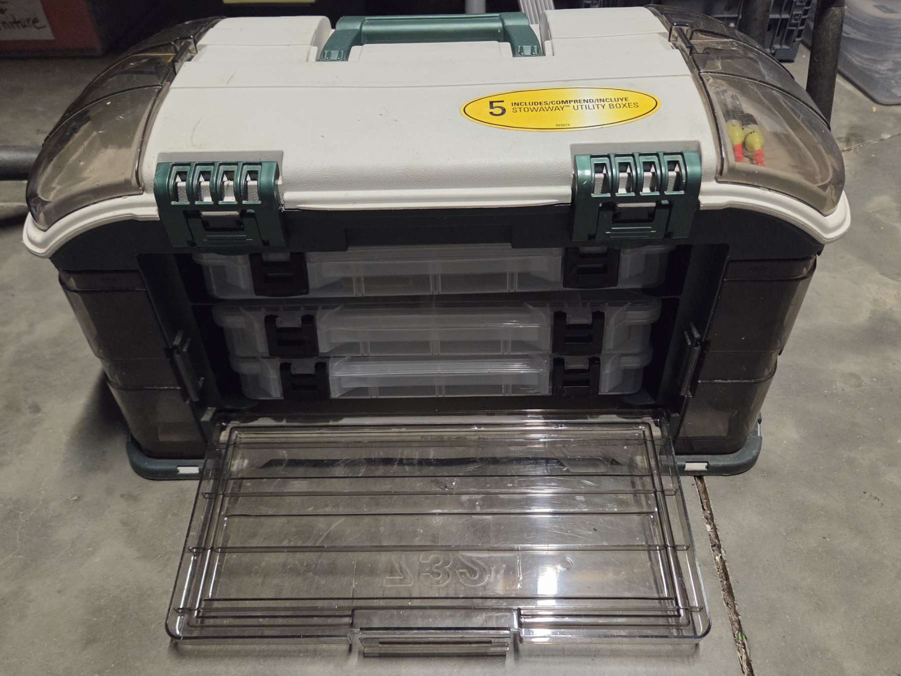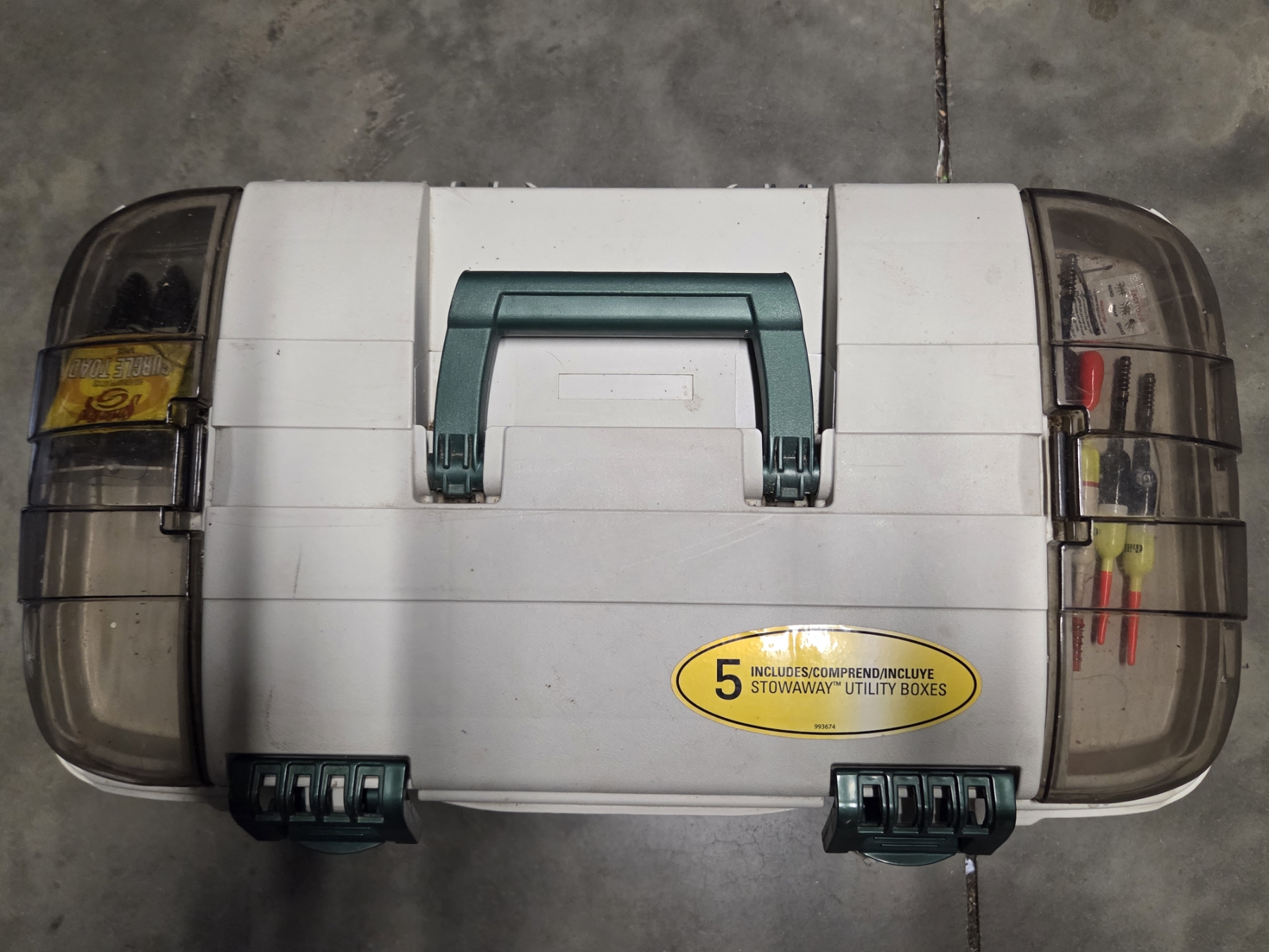 Great Condition Plano 732 Tackle Box With Dual Top Access. 3 Pull Out Clear Boxes With Assorted New & Like New Rubber Worms, Hooks, Lures, Jigs & More! Plus 4 Additional Storage Spaces, 23''L x 12.5'' W x 11.75'' H