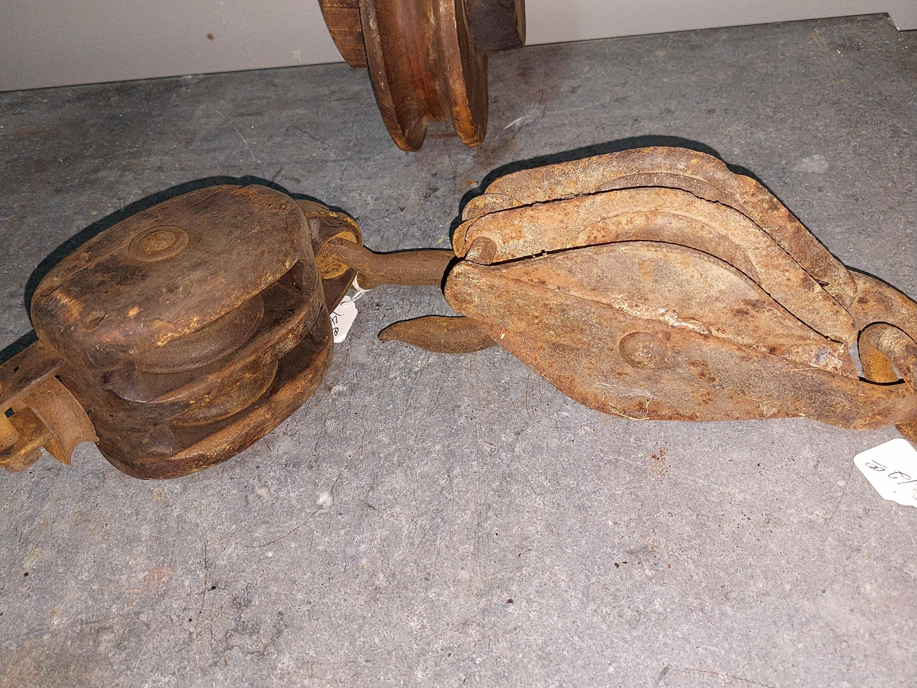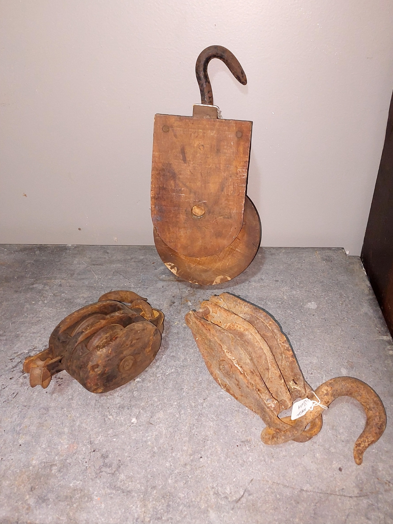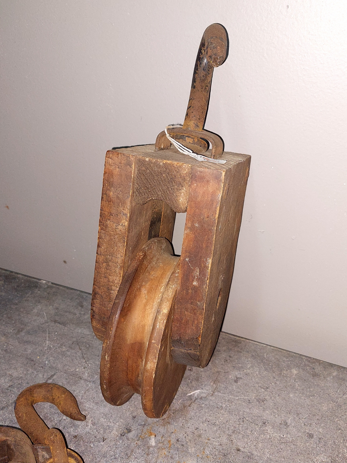 Group Of 3 Antique Wooden Pully / Blocks - one With Hook 10" - 6" - 6" - See Pics